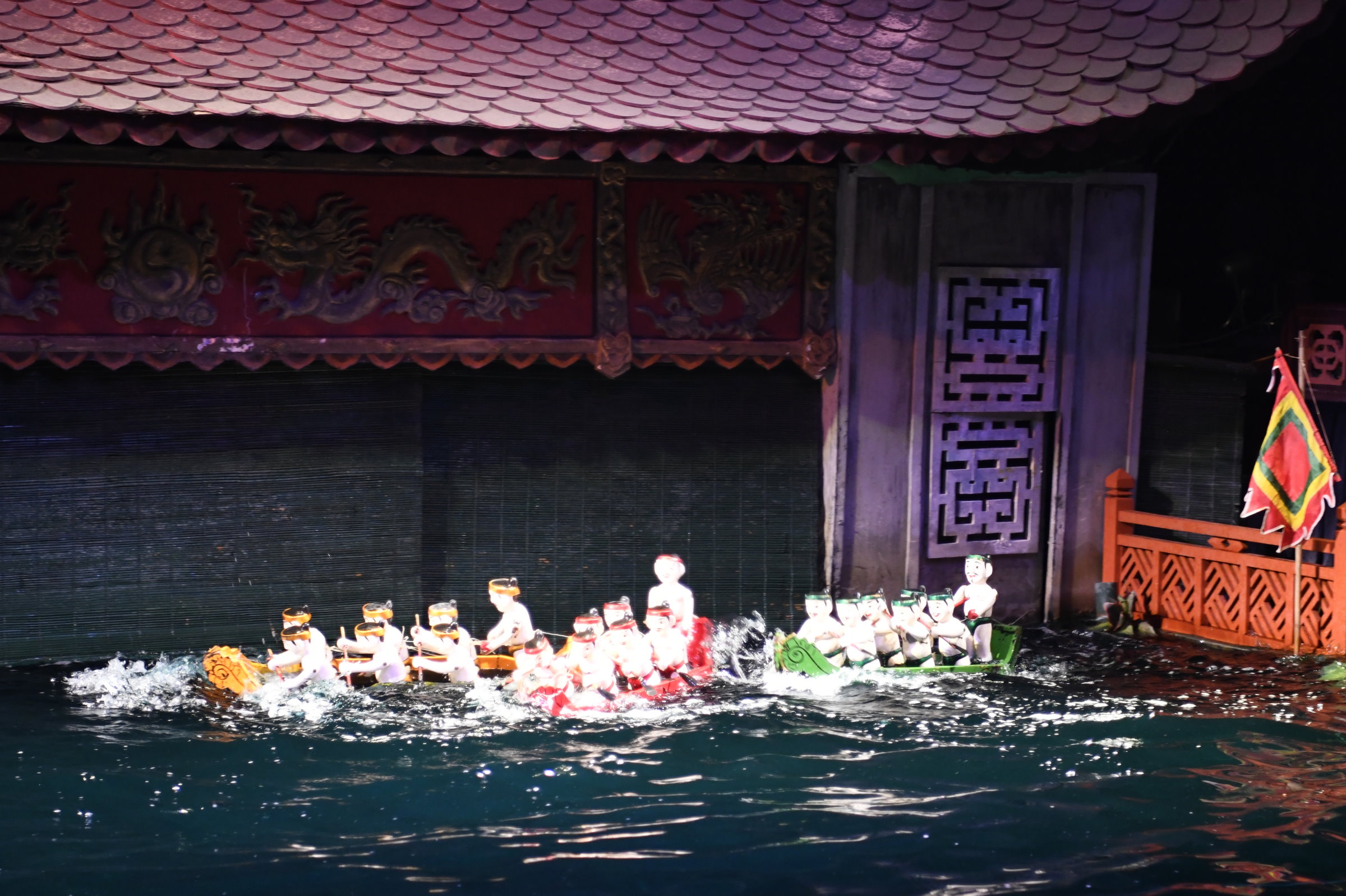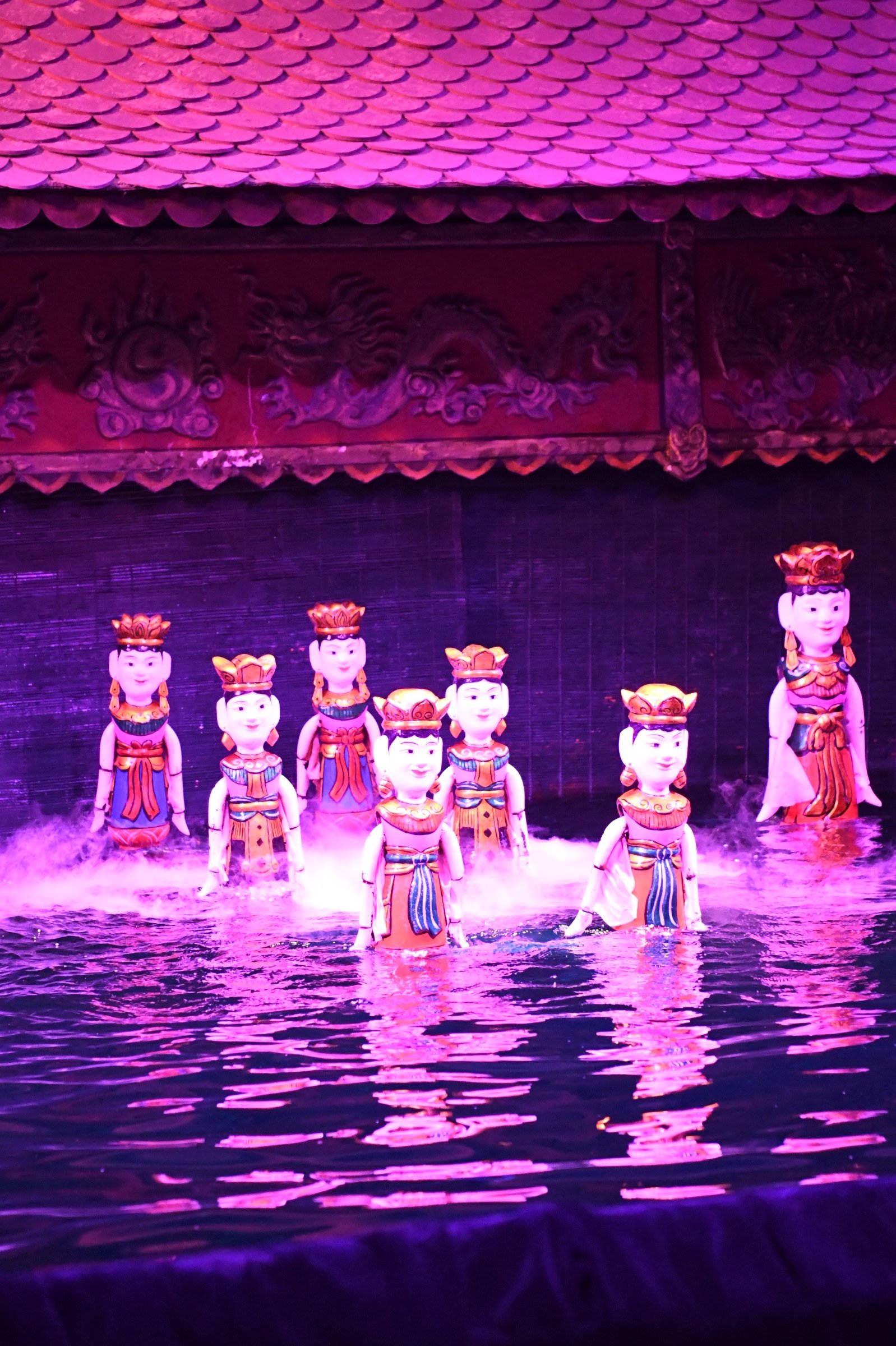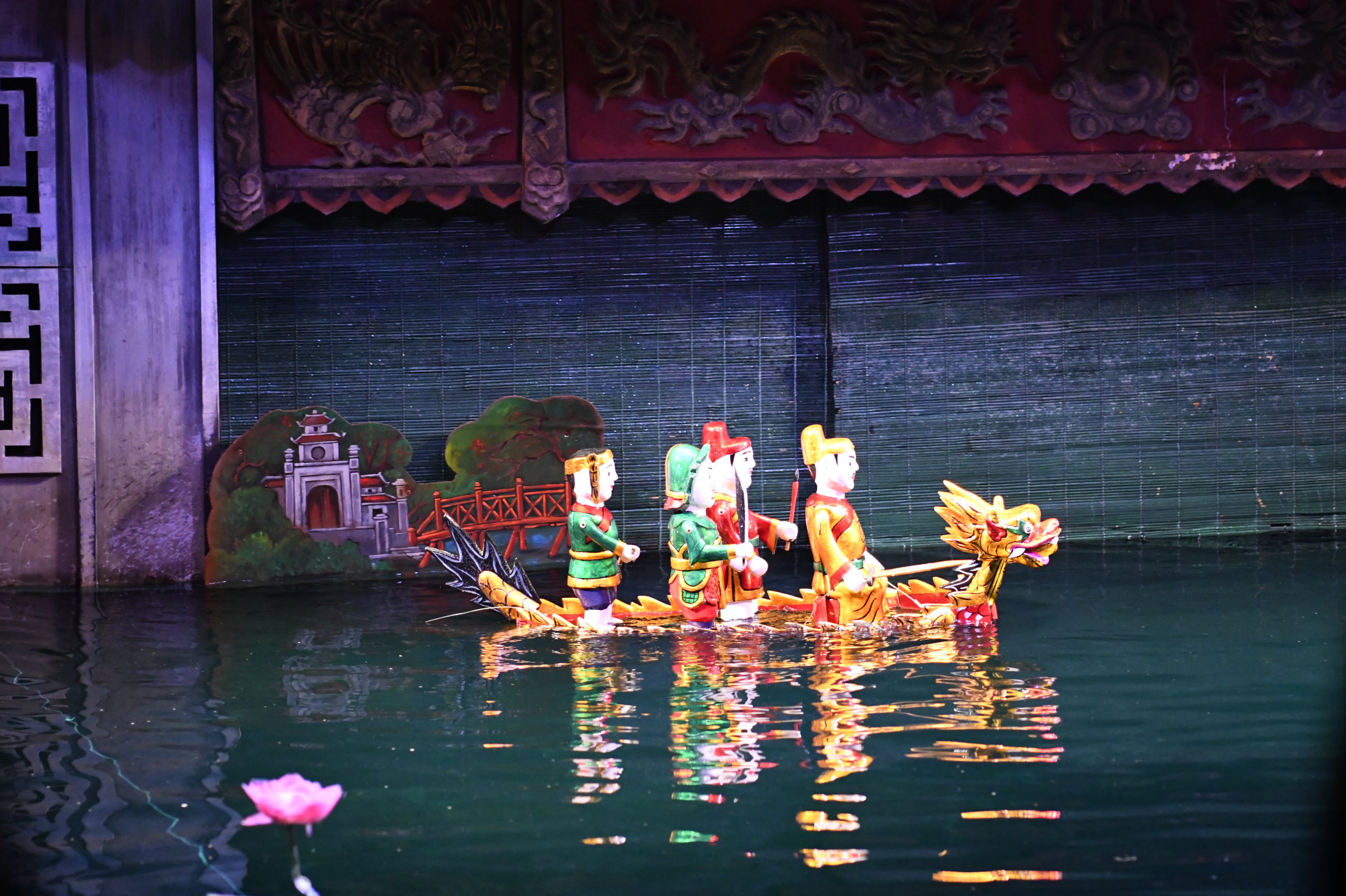 Um 15 Uhr entscheiden wir uns spontan zu einem Besuch des Wasserpuppentheaters hier am Platz. Die Aufführungen für heute und die nächsten zwei Tage sind ausverkauft, aber wir werden für unsre Spontanität belohnt. Es gibt noch zwei Karten auf den vorderen Plätzen für die Vorstellung, die vor einer Minute begonnen hat.