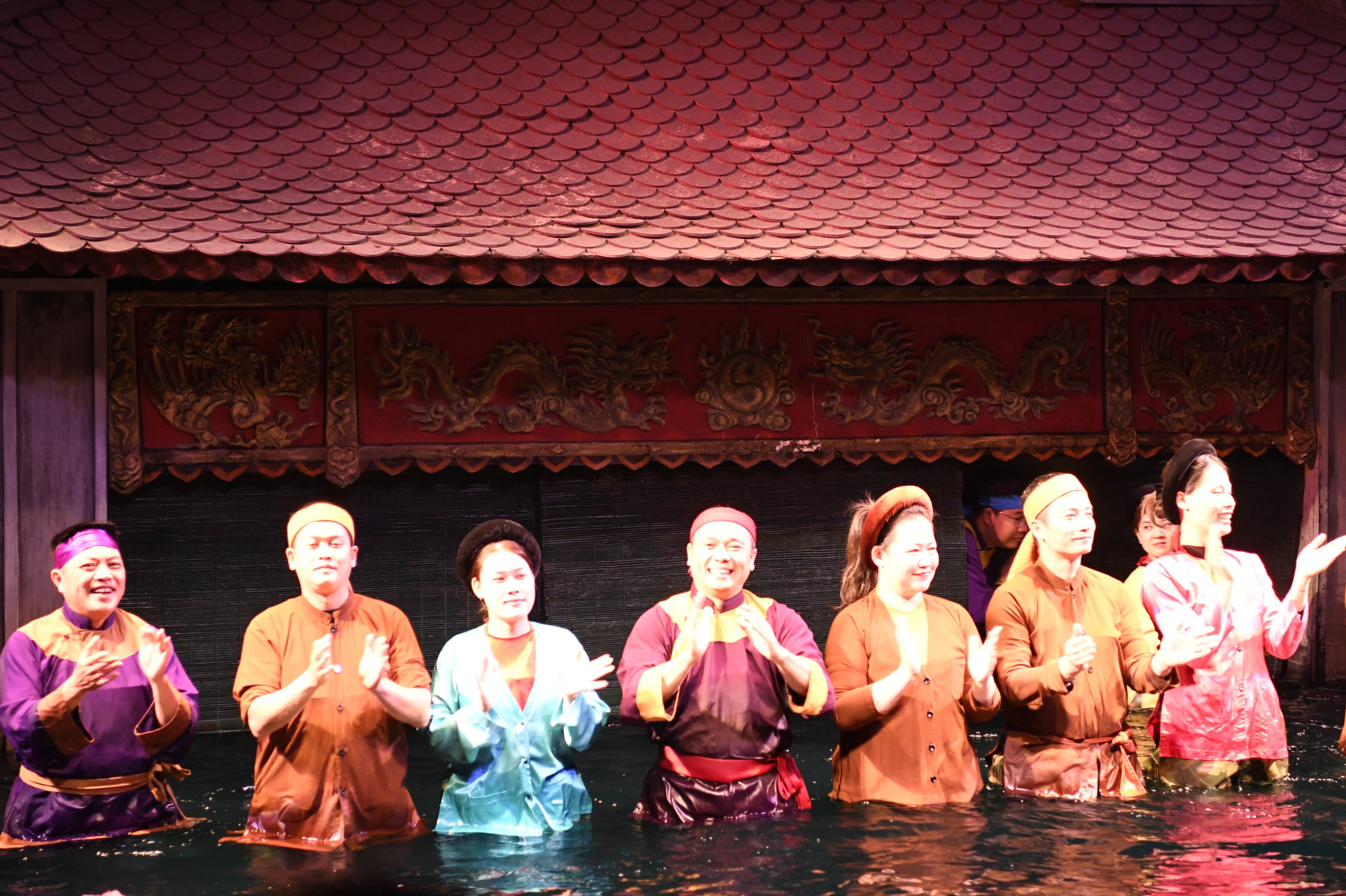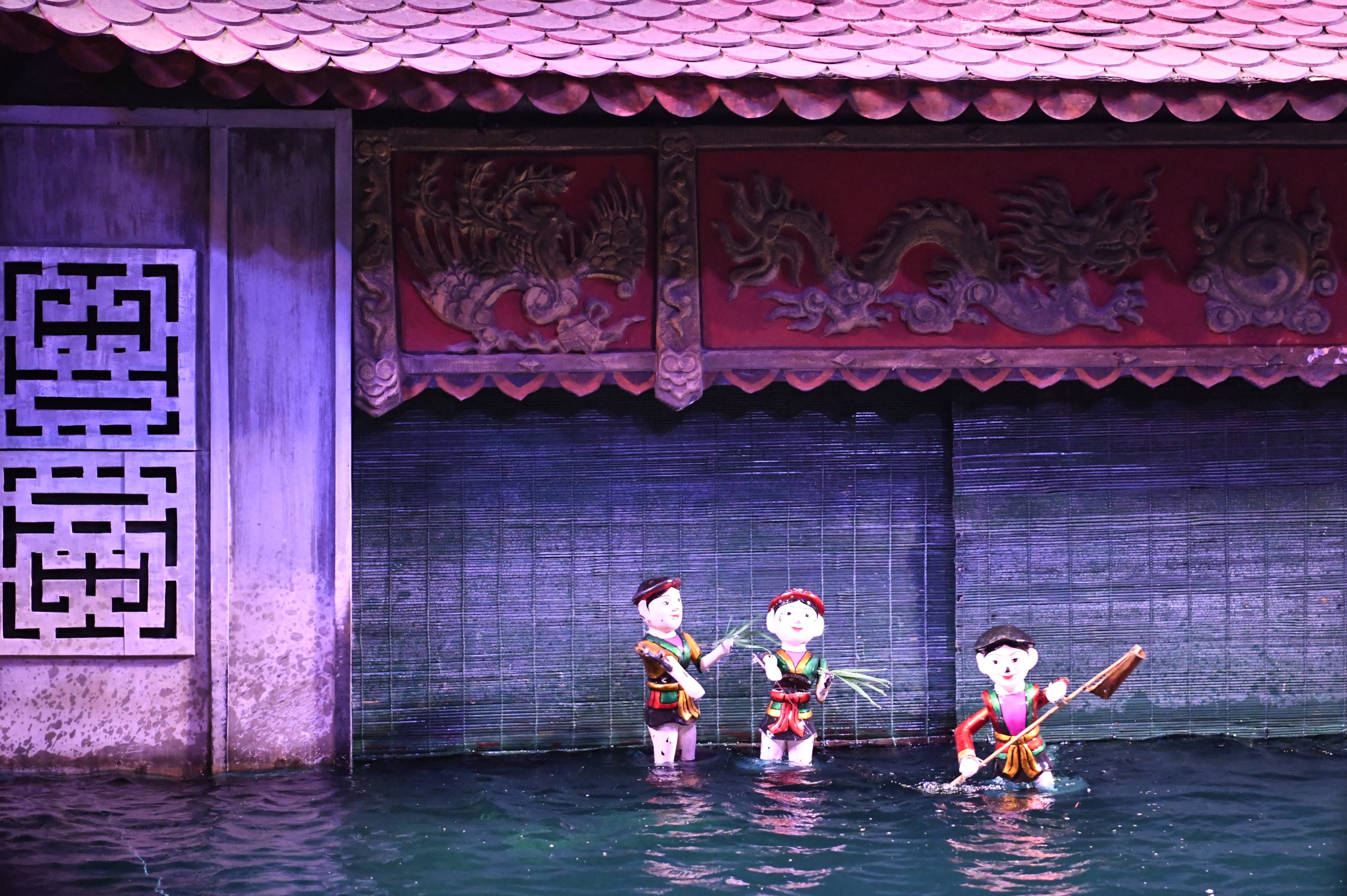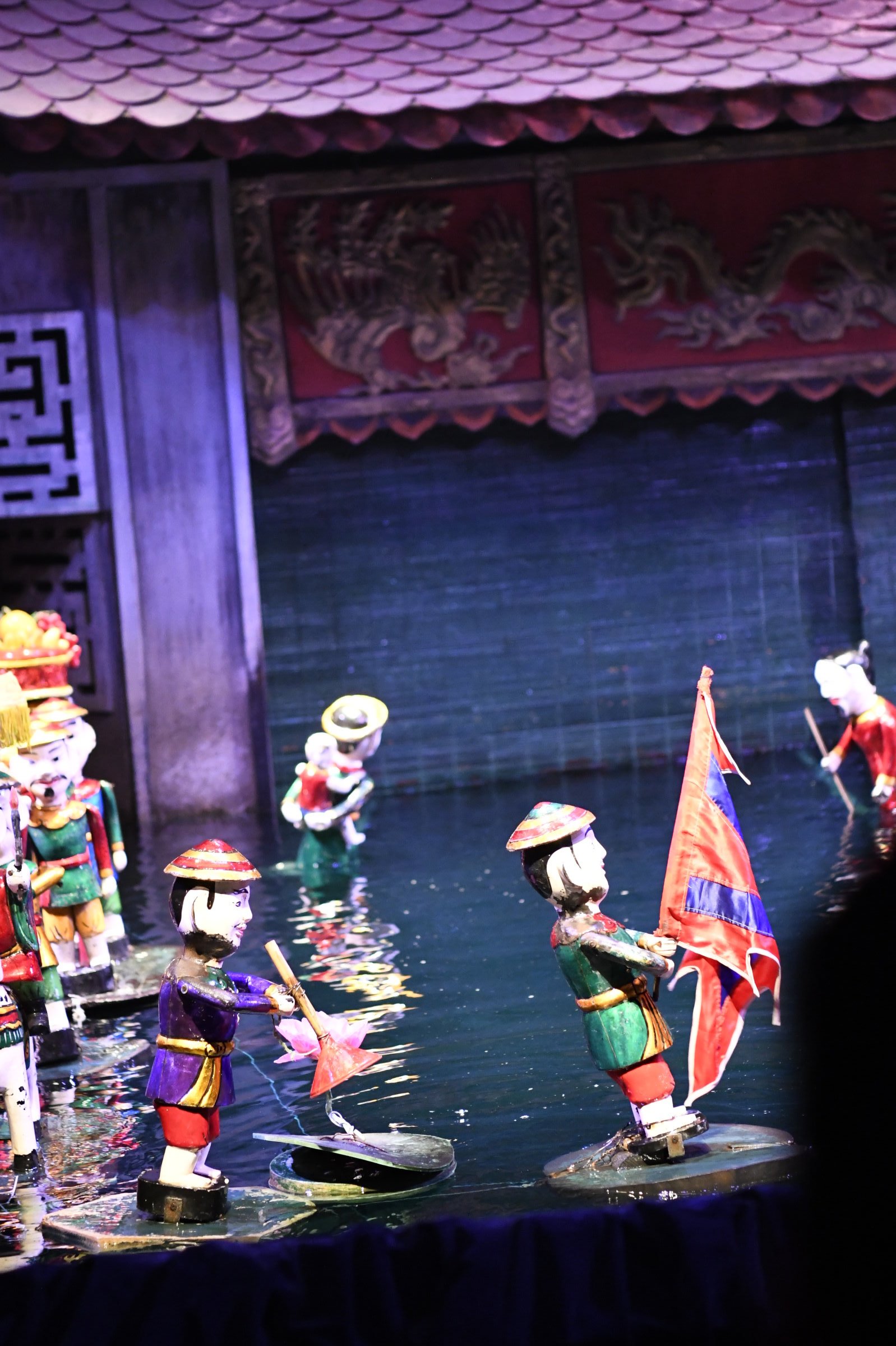 Um 15 Uhr entscheiden wir uns spontan zu einem Besuch des Wasserpuppentheaters hier am Platz. Die Aufführungen für heute und die nächsten zwei Tage sind ausverkauft, aber wir werden für unsre Spontanität belohnt. Es gibt noch zwei Karten auf den vorderen Plätzen für die Vorstellung, die vor einer Minute begonnen hat.