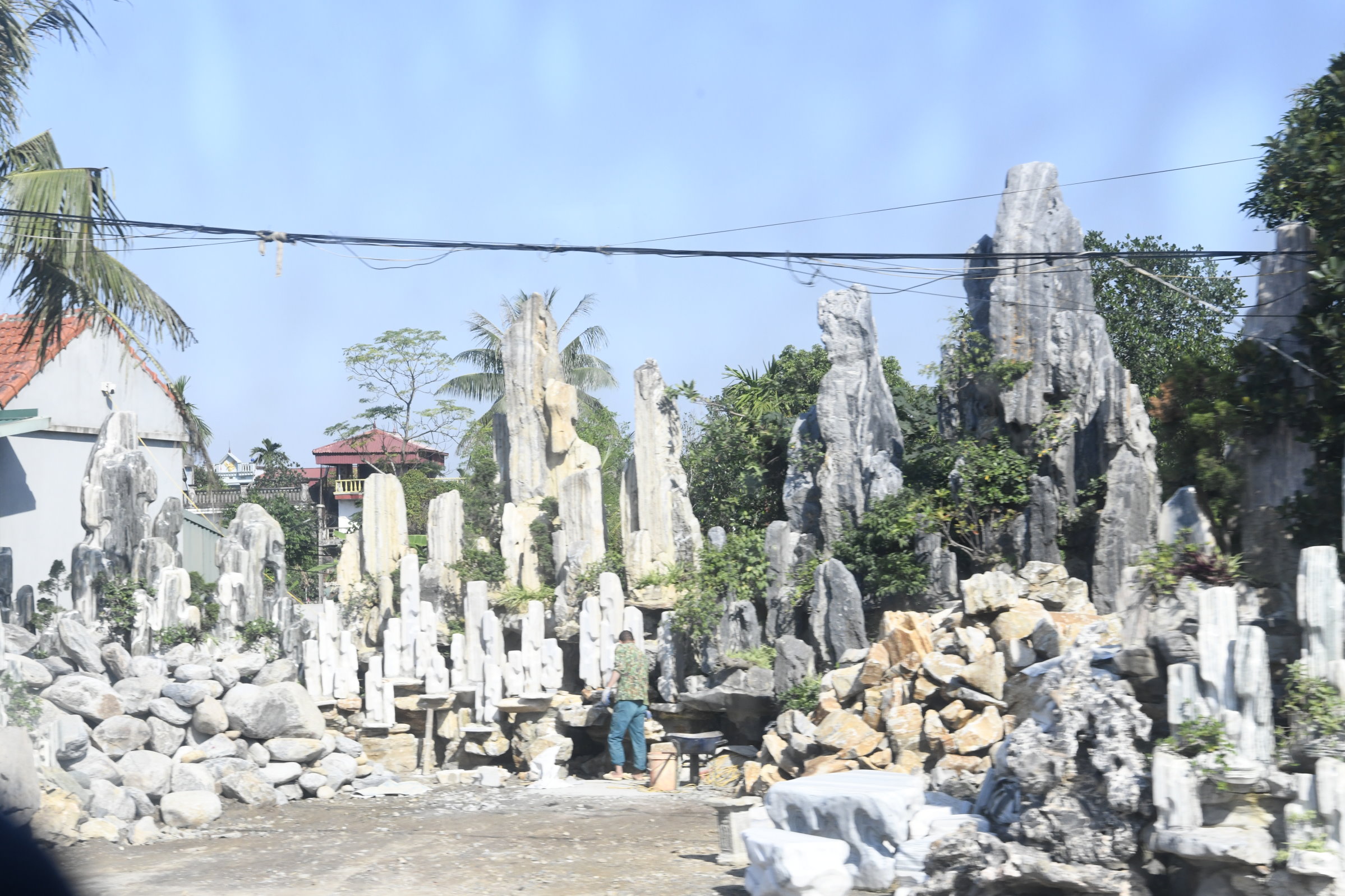 Nach einer Stunde haben wir die Stadt verlassen. Kanäle, Bananenplantagen, Reisfelder, immer wieder Kirchen und ein das Neubaugebiet: Sun Urban City ziehen an den Fenstern vorbei Um 10 Uhr erreichen wir Phu Ly und die ersten Fahrgäste sind an ihrem Ziel. Es dauert nur wenige Minuten, dann fahren wir auch schon wieder. Die Strecke folgt nun einer Landstraße, entlang der sich einige Steinmetze angesiedelt haben.
