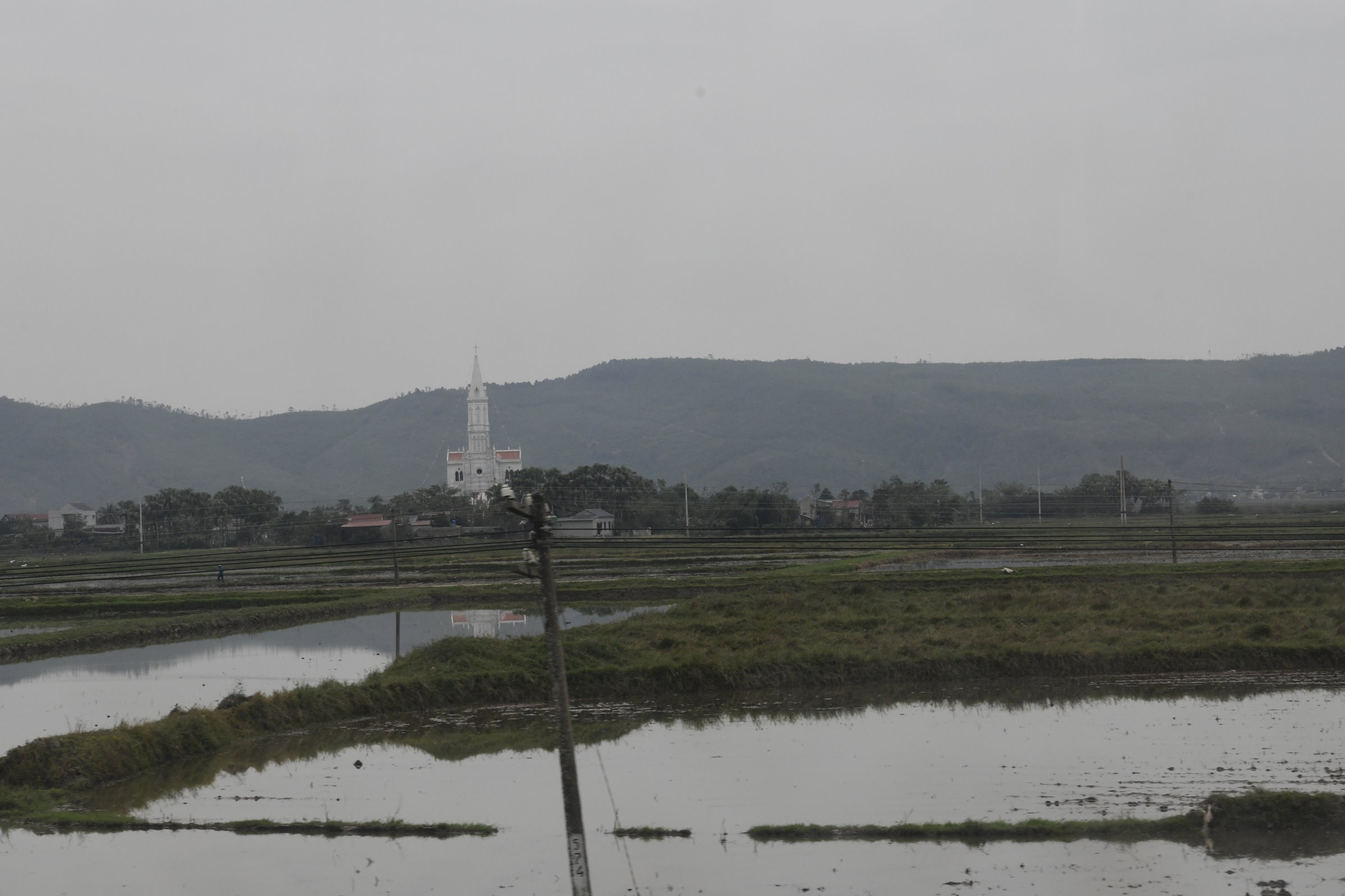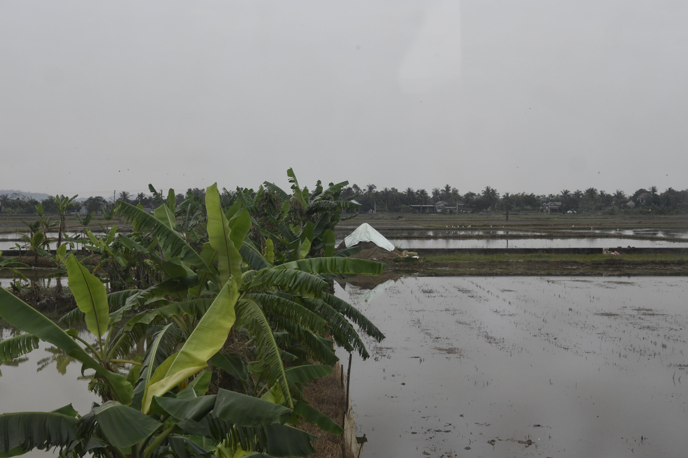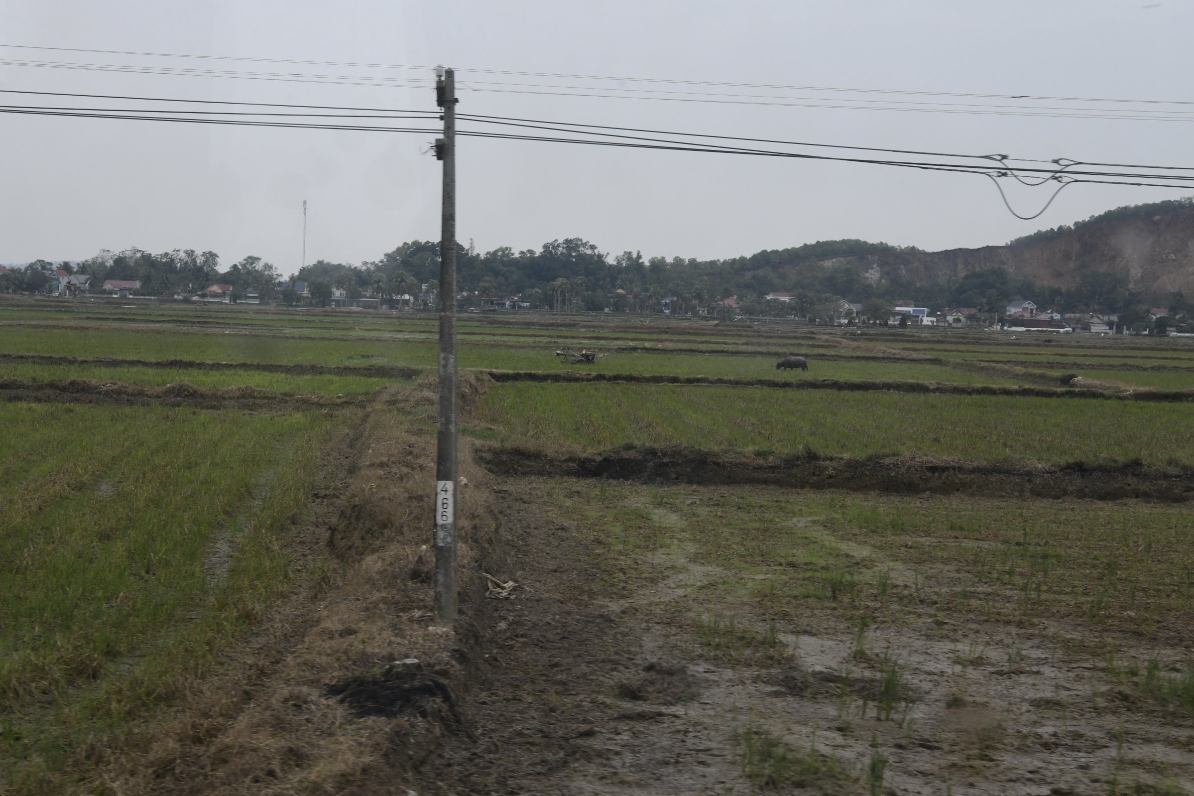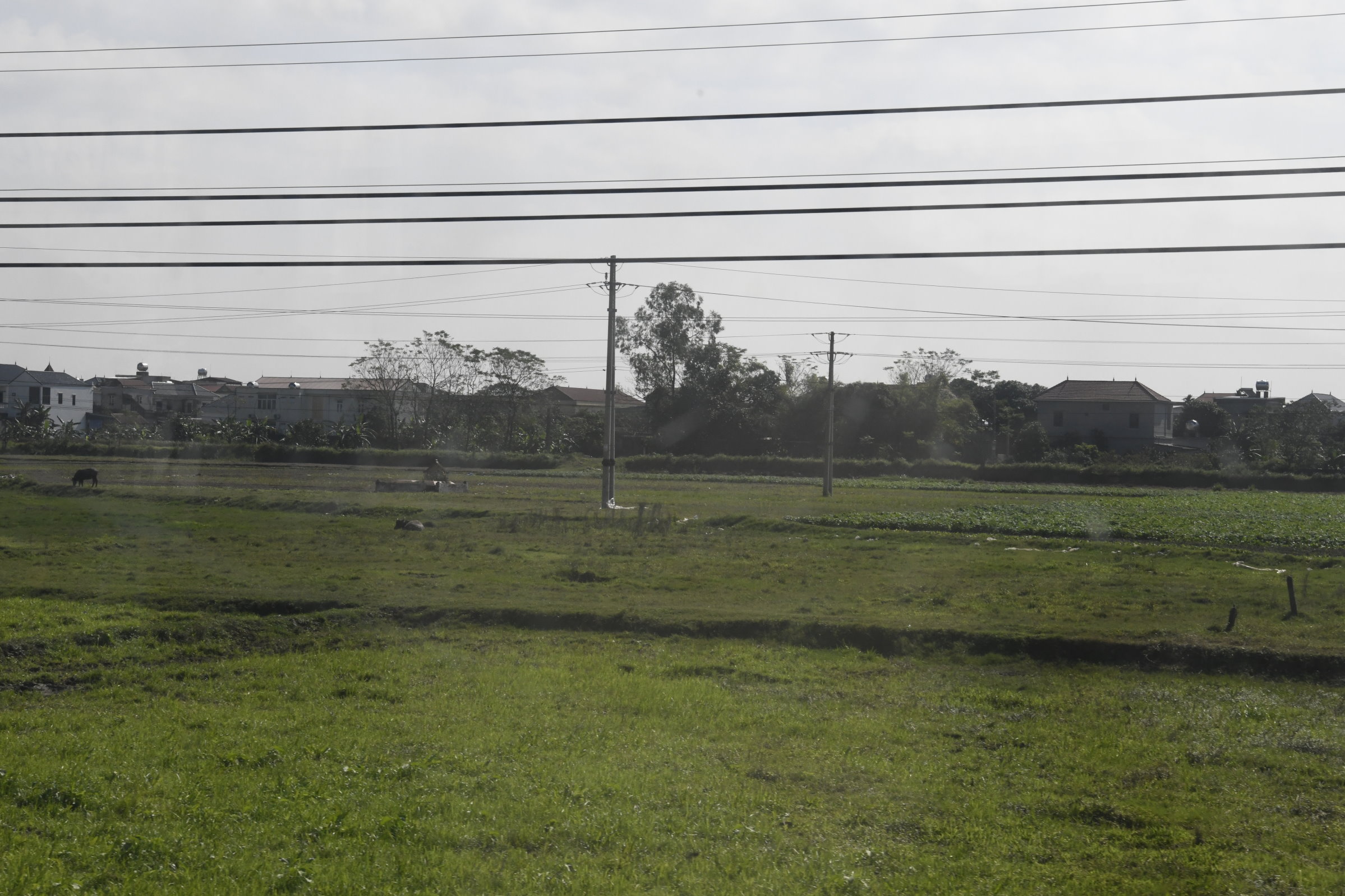 Zunächst verläuft die Weiterfahrt plangemäß, bis es in Cau Gia, rund 60 Kilometer von unserem Ziel entfernt zu einem längeren Stopp kommt. Der Grund: Ab hier wird die Strecke einspurig und wir müssen erst den Gegenzug durchlassen. Um 14 Uhr geht es endlich weiter. Die Gleise führen auf einer Böschung direkt durch die Reisfelder, die teils erntereif, teils frisch umgegraben und frisch bepflanzt an den Fenstern vorbeihuschen.