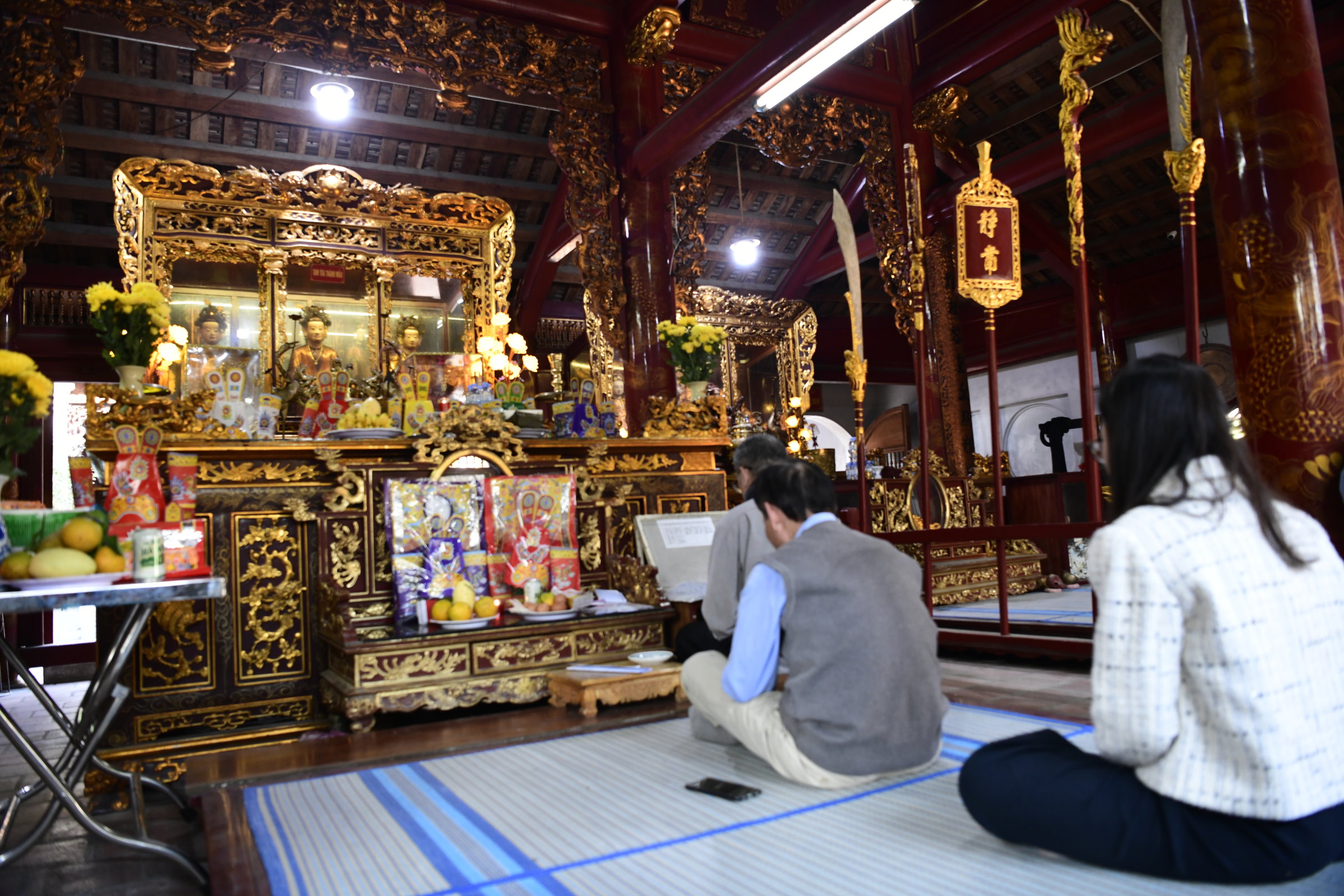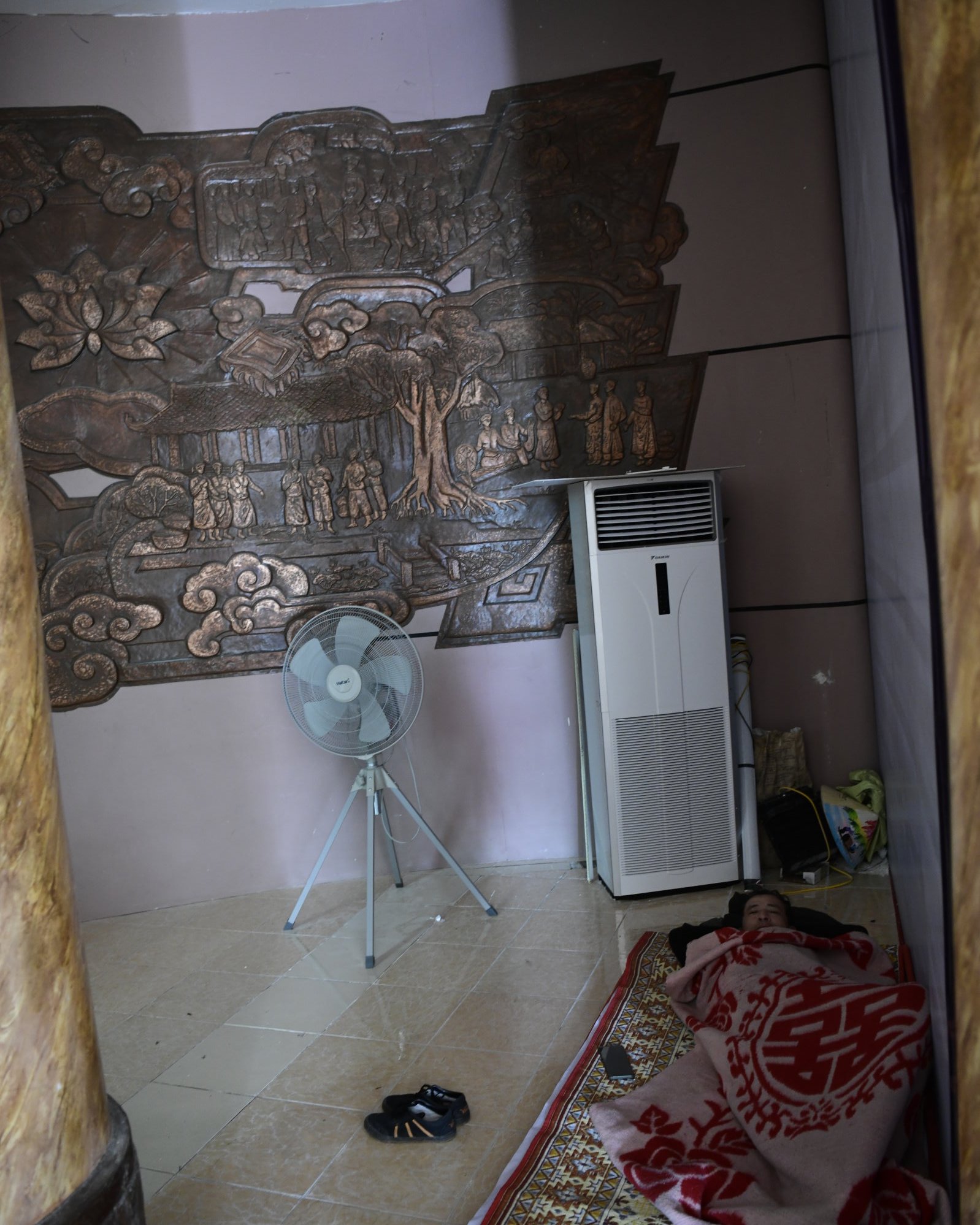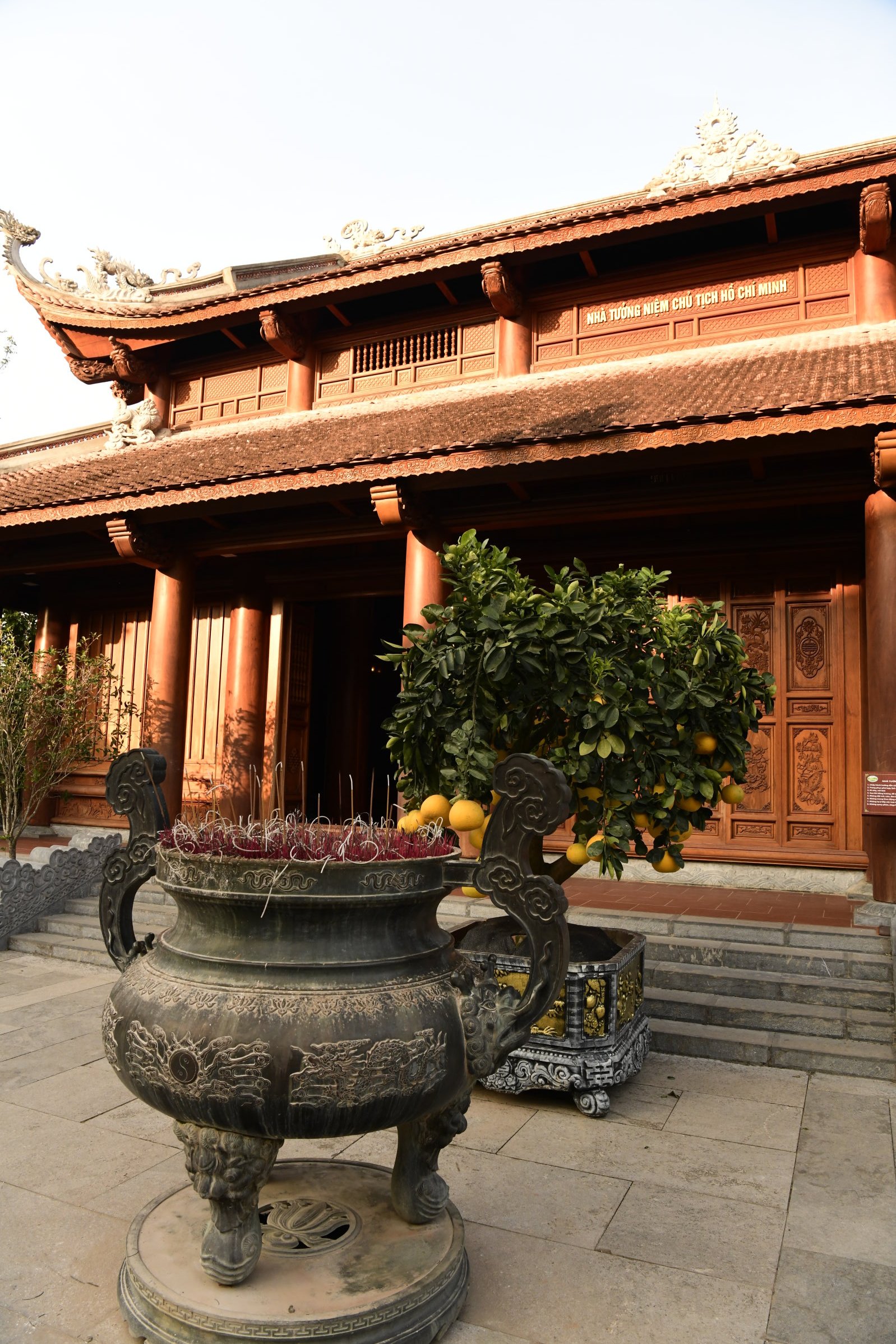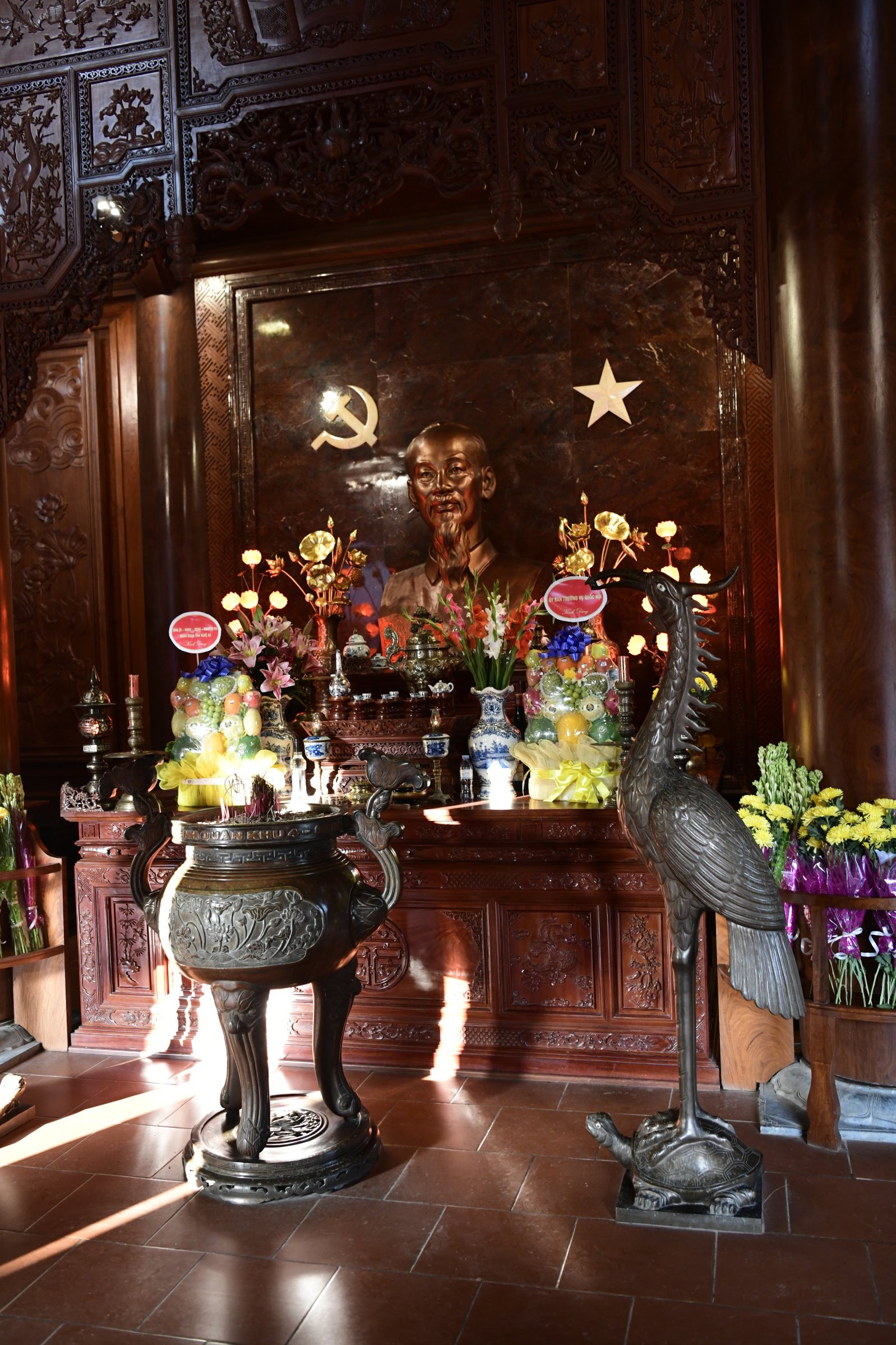 Das erste zeigt eine kleine Ausstellung, im zweiten ist ein Jeep zu sehen, bis dann in der dritten Halle eine Bronzebüste Ho Chi Minhs thront. Während auf den Altären des Tempels am Nachmittag Wasserflaschen und Getränkedosen gestapelt waren, sind es hier sorgfältig in Plastik verpackte Obstkörbe.
