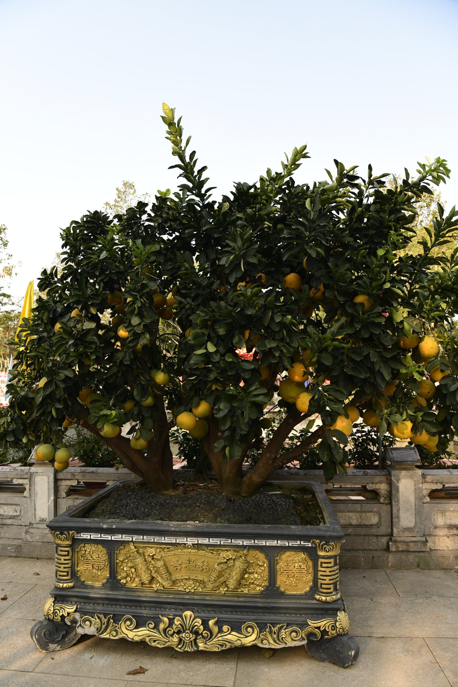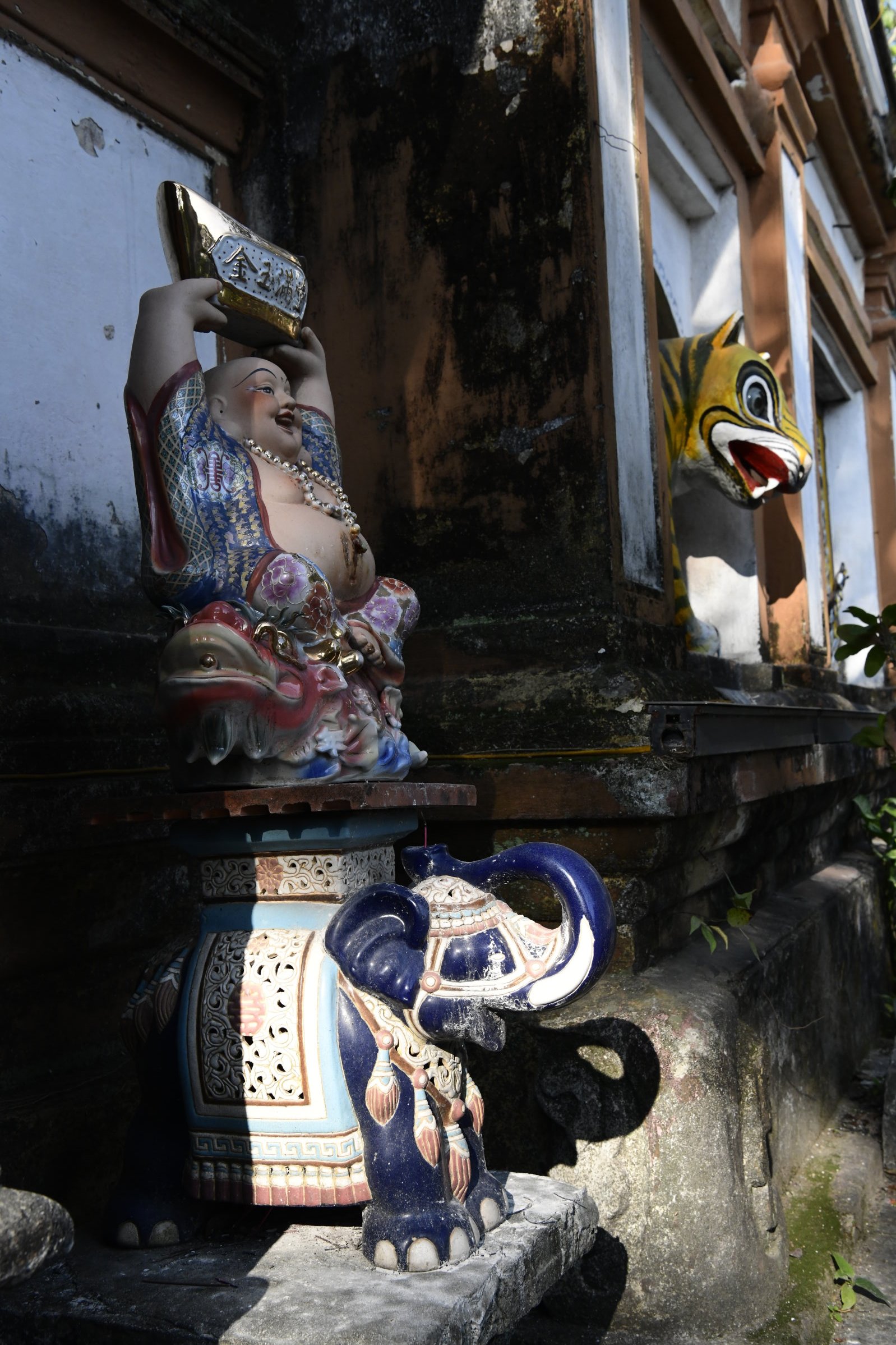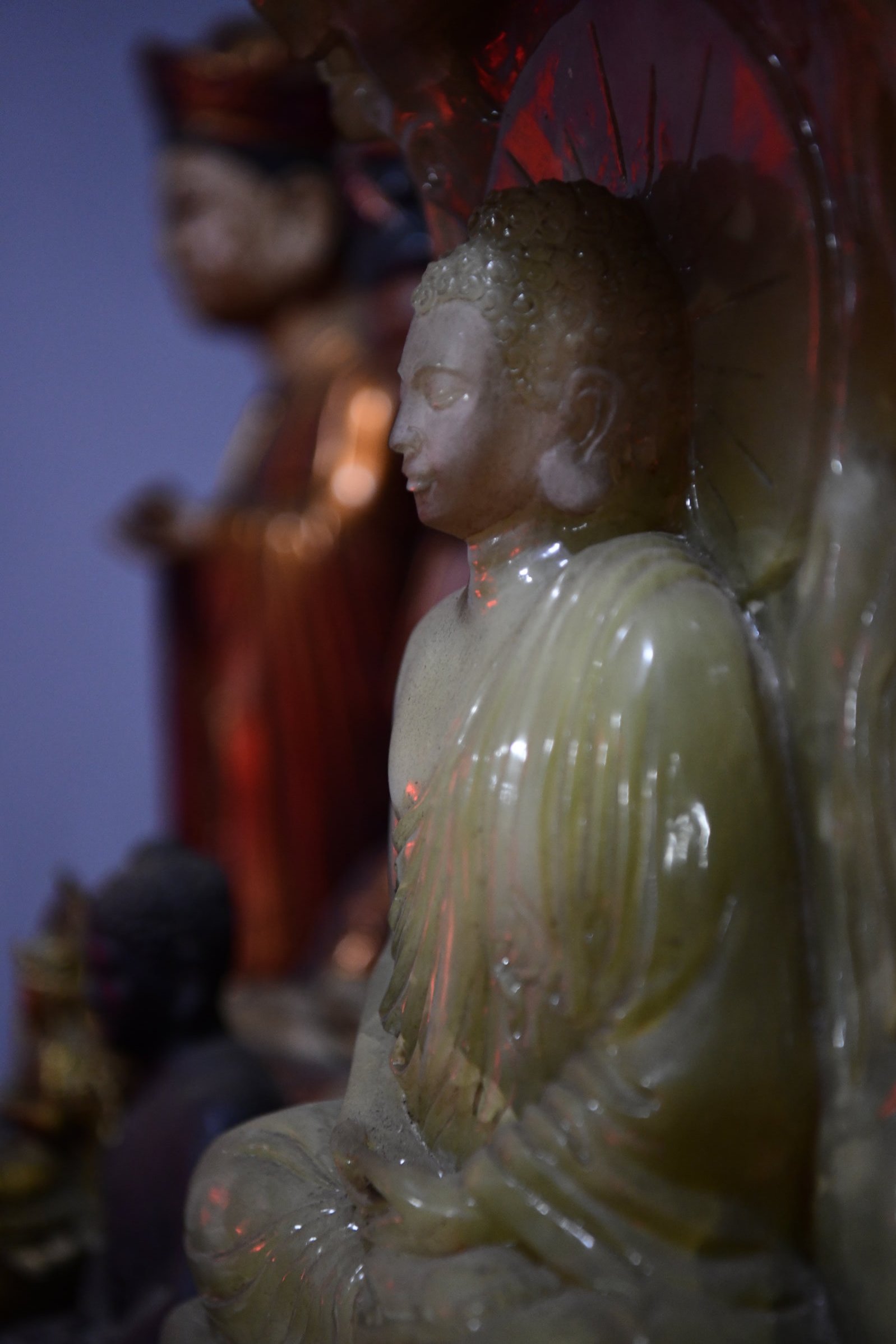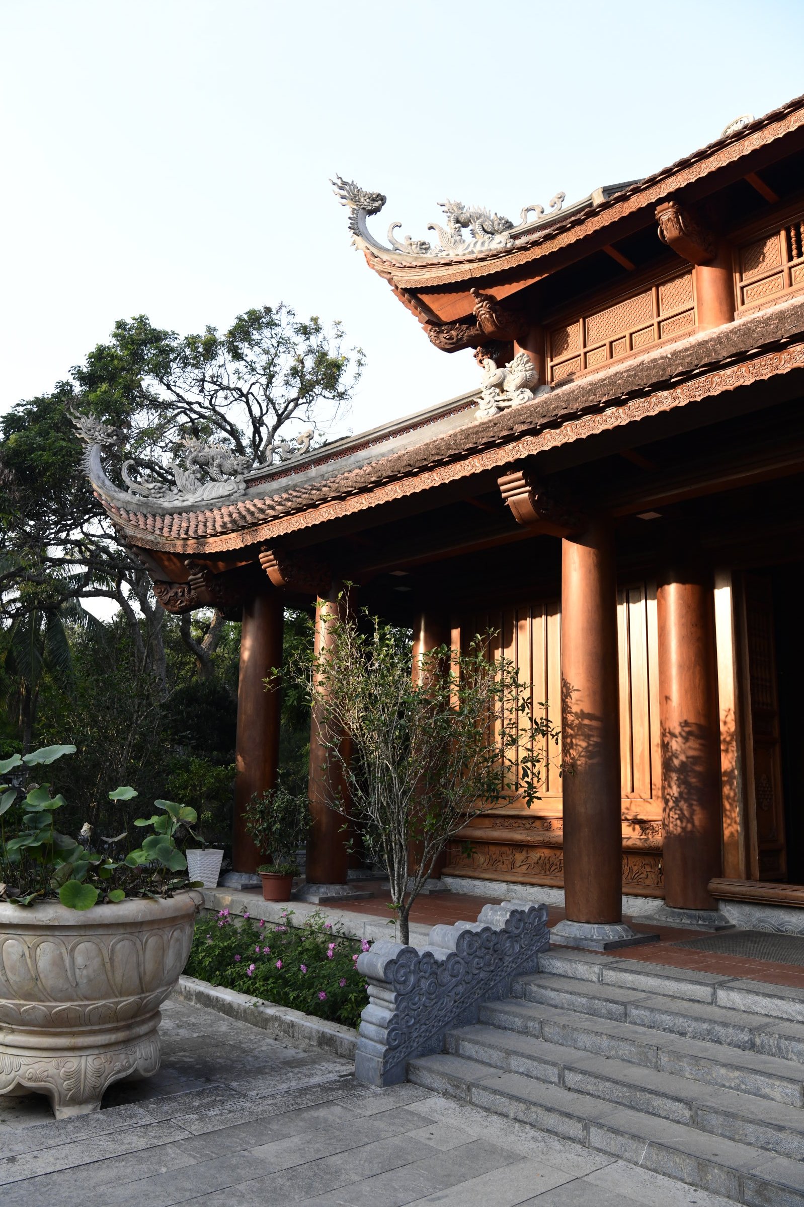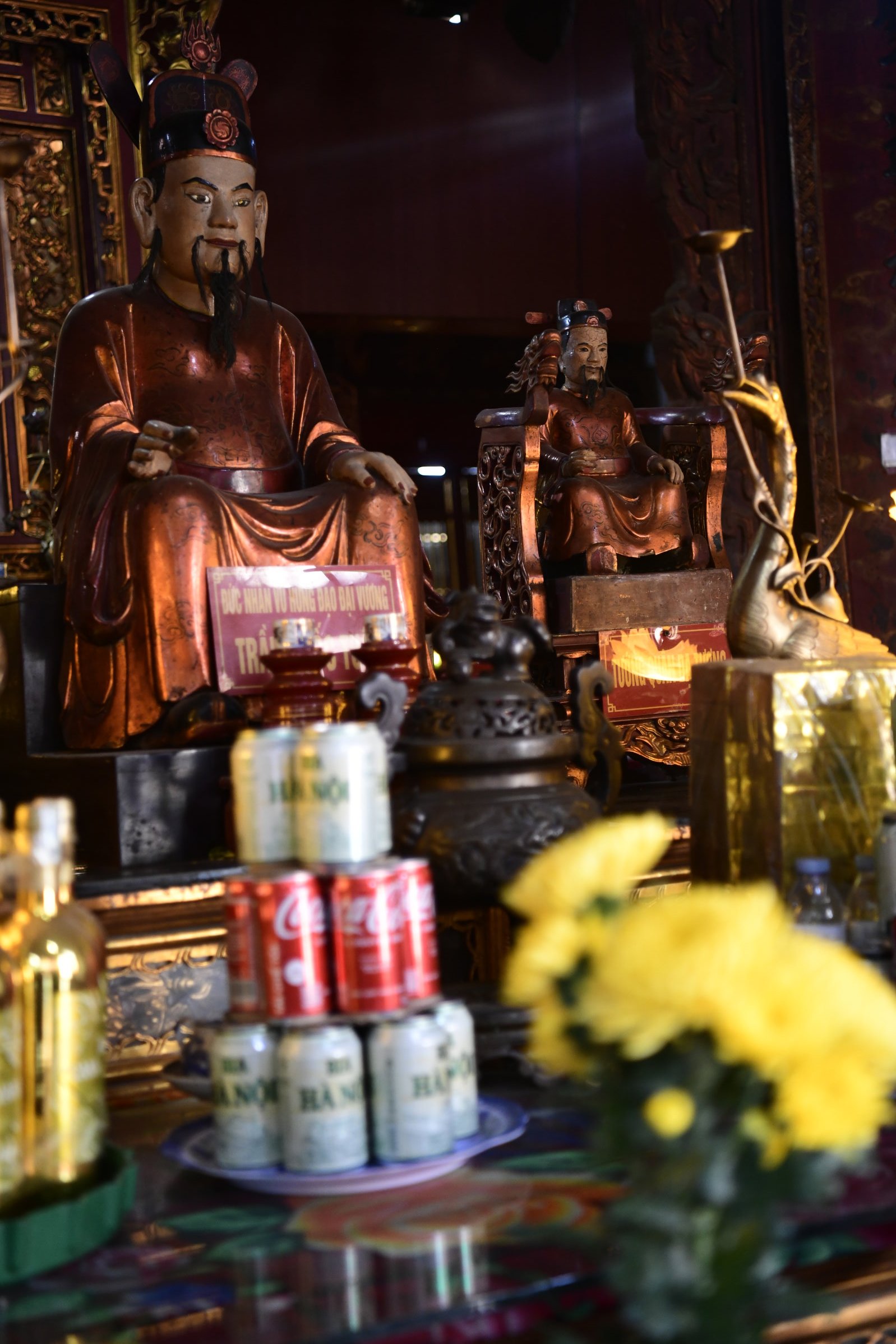 Das erste zeigt eine kleine Ausstellung, im zweiten ist ein Jeep zu sehen, bis dann in der dritten Halle eine Bronzebüste Ho Chi Minhs thront. Während auf den Altären des Tempels am Nachmittag Wasserflaschen und Getränkedosen gestapelt waren, sind es hier sorgfältig in Plastik verpackte Obstkörbe.