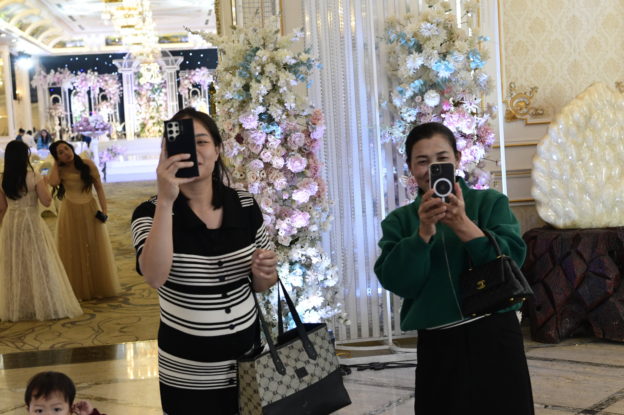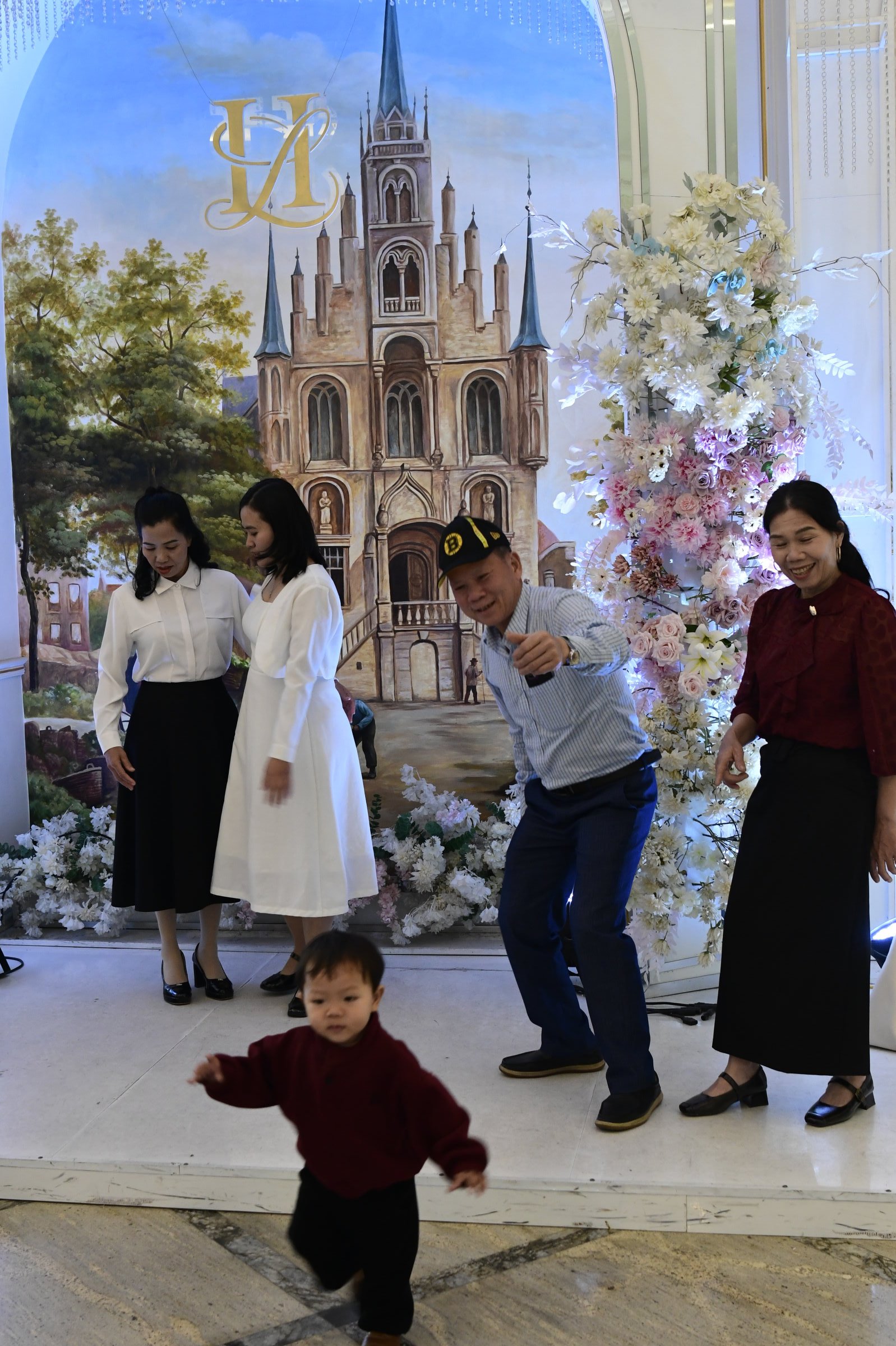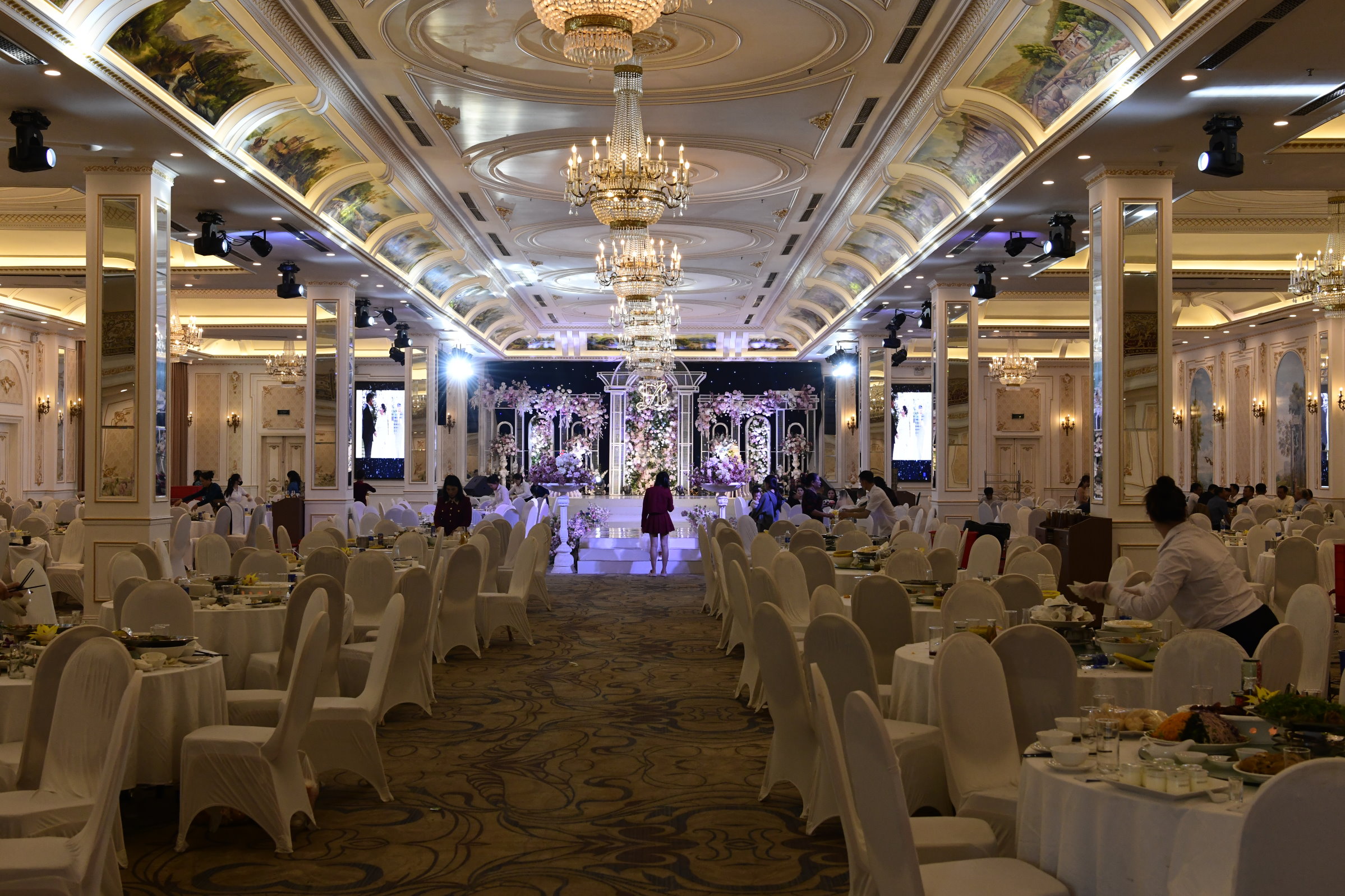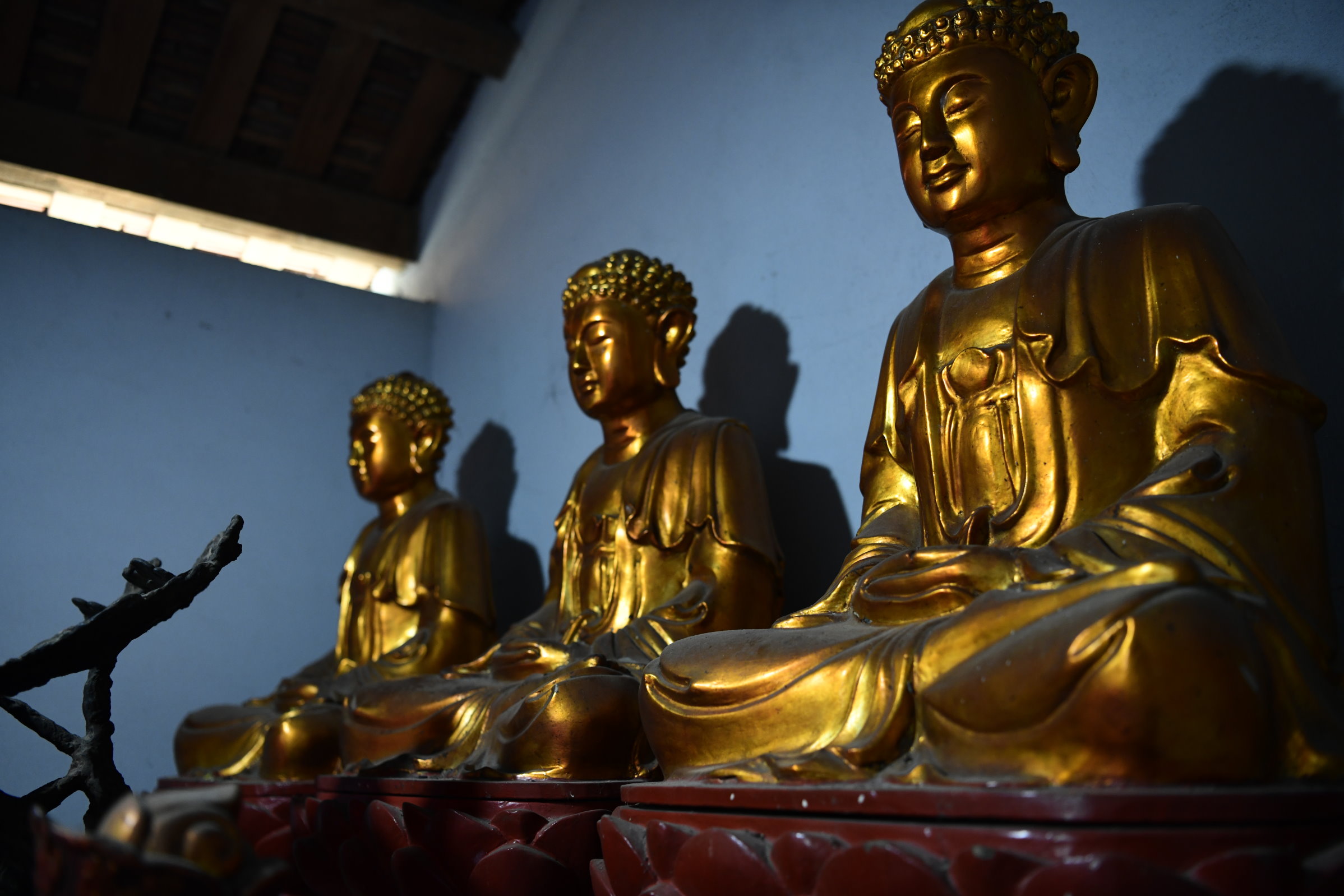 Das erste zeigt eine kleine Ausstellung, im zweiten ist ein Jeep zu sehen, bis dann in der dritten Halle eine Bronzebüste Ho Chi Minhs thront. Während auf den Altären des Tempels am Nachmittag Wasserflaschen und Getränkedosen gestapelt waren, sind es hier sorgfältig in Plastik verpackte Obstkörbe.