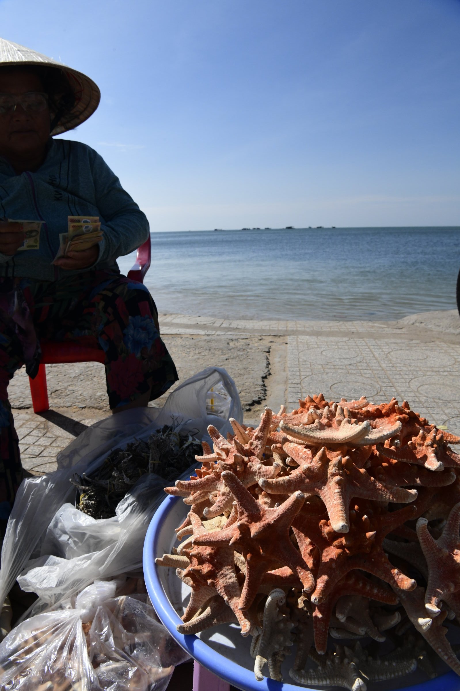 Die Seestern-Verkäuferin vor dem Tempelaufgang bringt uns auf die richtige Fährte. Es soll auf Phú Quốc einen ganz besonderen Strand geben, an dem die roten , fünfarmigen Stachelhäuter zu finden sind. Der Starfish Beach liegt freilich an der Nordspitze der Insel und wir befinden uns in der Mitte. Und Tai willigt ein, uns die 25 Kilometer nach Norden zu bringen und schlägt noch ein paar Zwischenstopps bei weiteren Tempeln und Handwerkern vor.