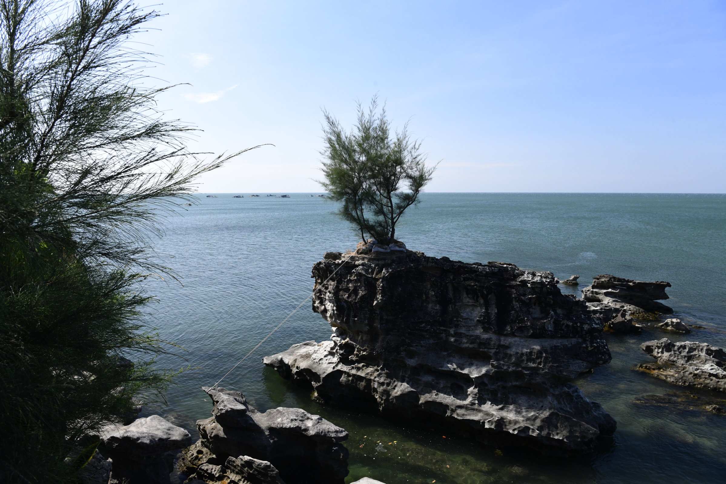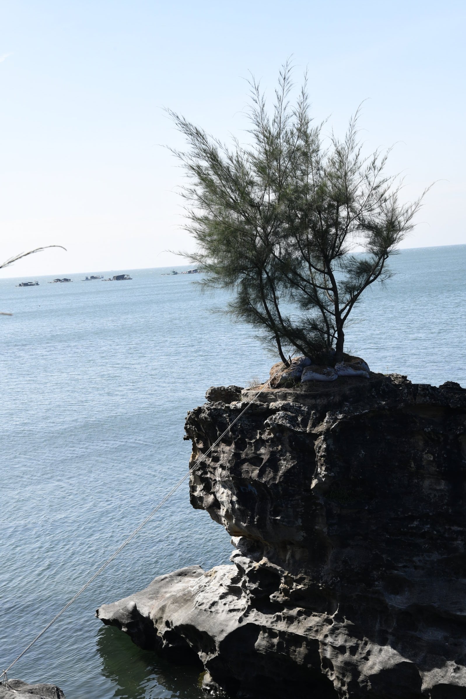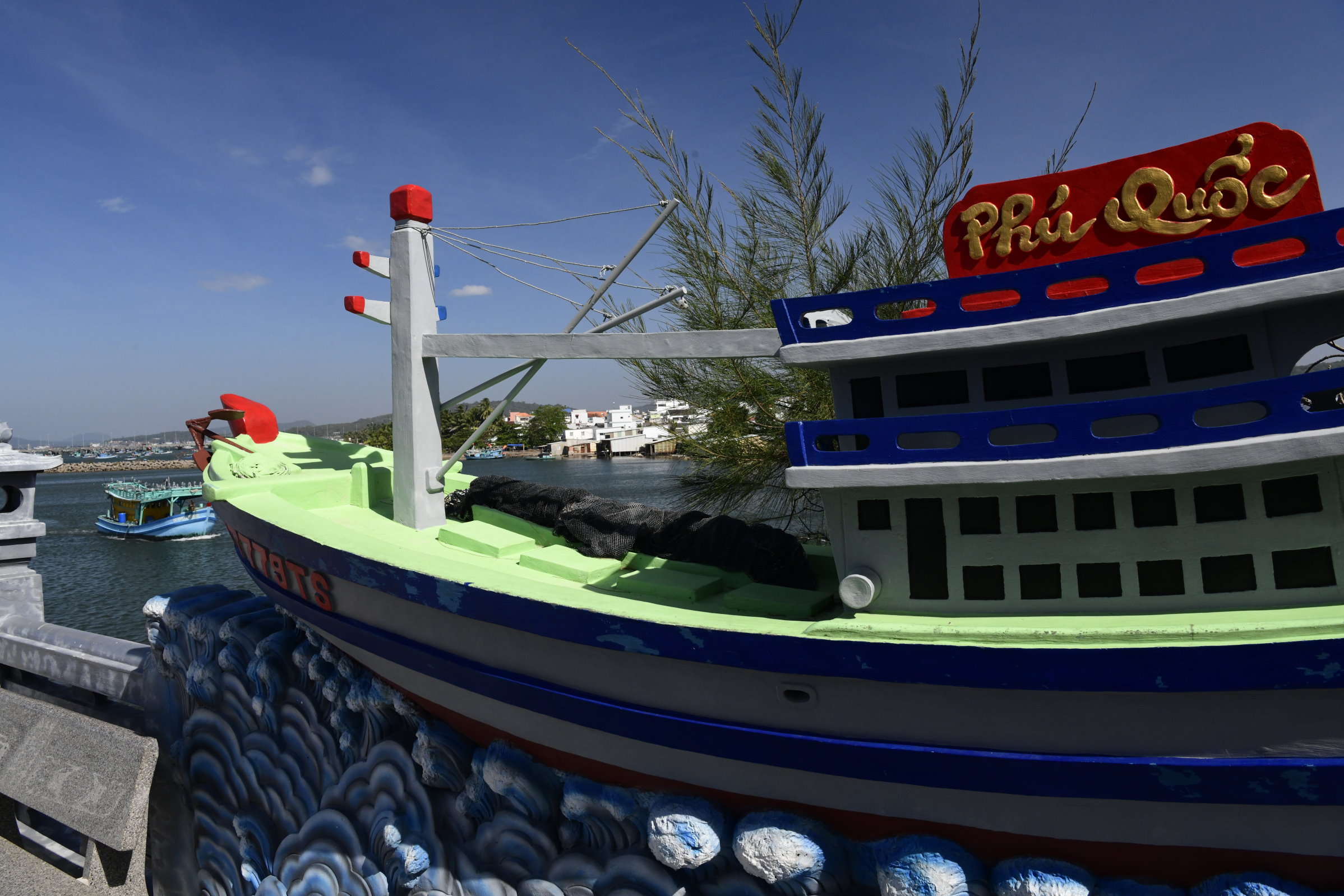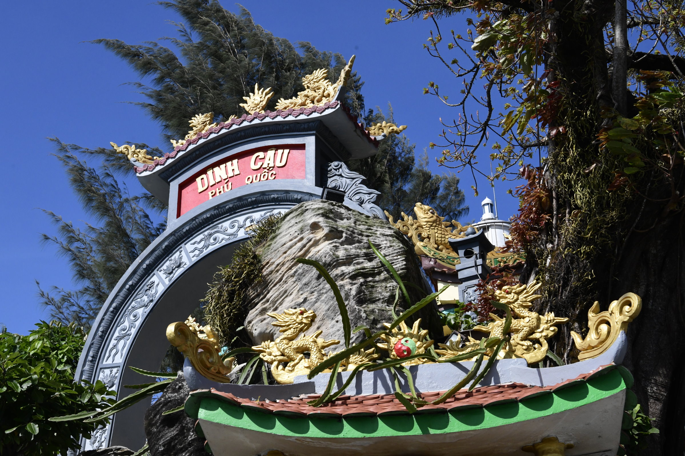 Auch am zweiten Tag sind wir wieder mit Tai Duc unterwegs, der uns gleich nach dem Frühstück am Hotel abholt und zu dem, einer Meeresgöttin gewidmeten kleinen Dinh Cậu Tempel am Fischereihafen bringt, den wir gestern Abend in der Dämmerung beim Essen in ein einem Fischrestaurant auf der anderen Seite der Mole nur schemenhaft erkennen konnten. Heute Morgen haben kräftige Windböen den Himmel leergefegt und der kleine Felsen mit dem blau-weißen Leuchtturm und der kleinen Pagode strahlt grell in der Sonne. Ideales Fotowetter für weitere Entdeckungen auf der Insel.