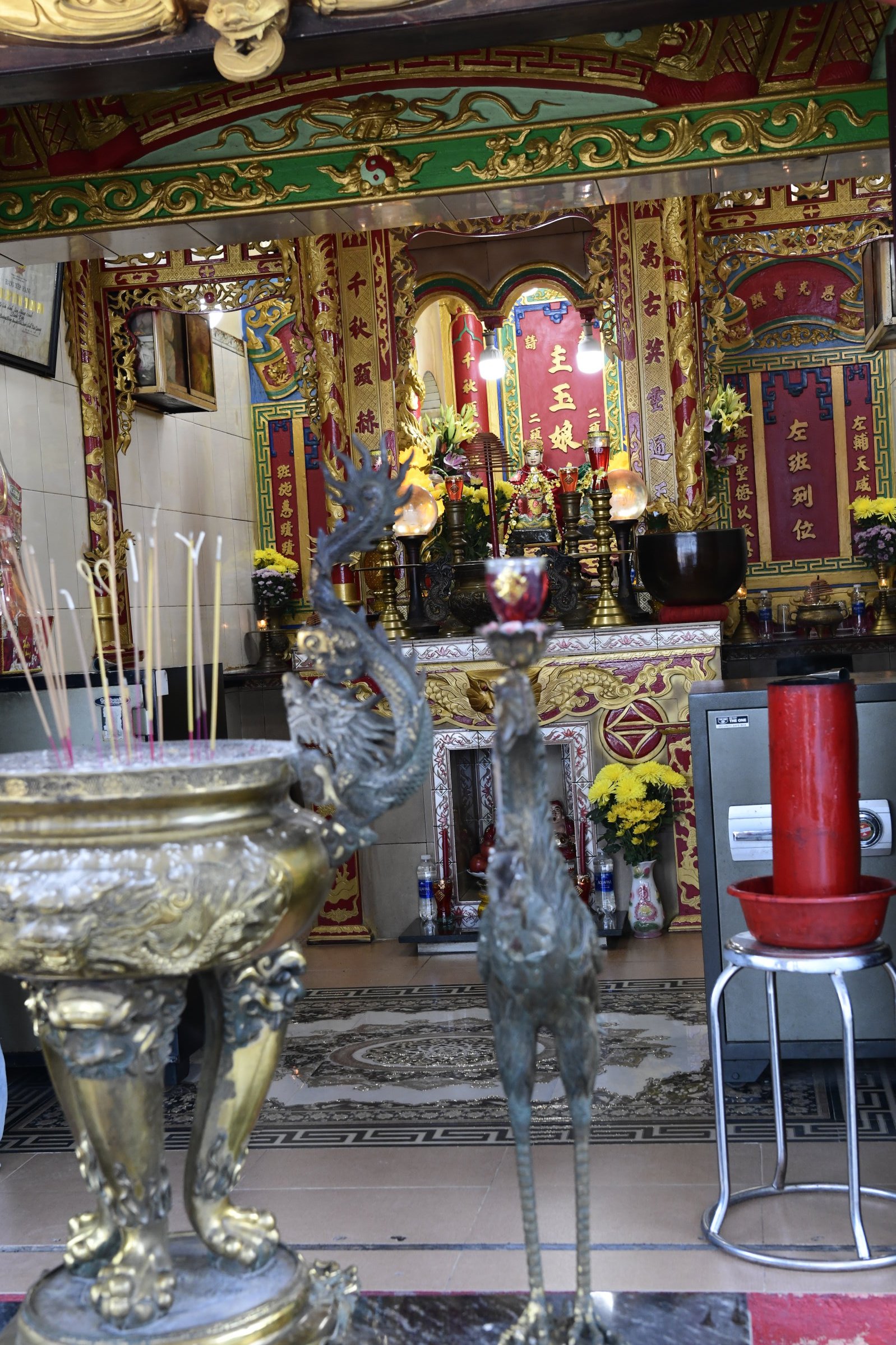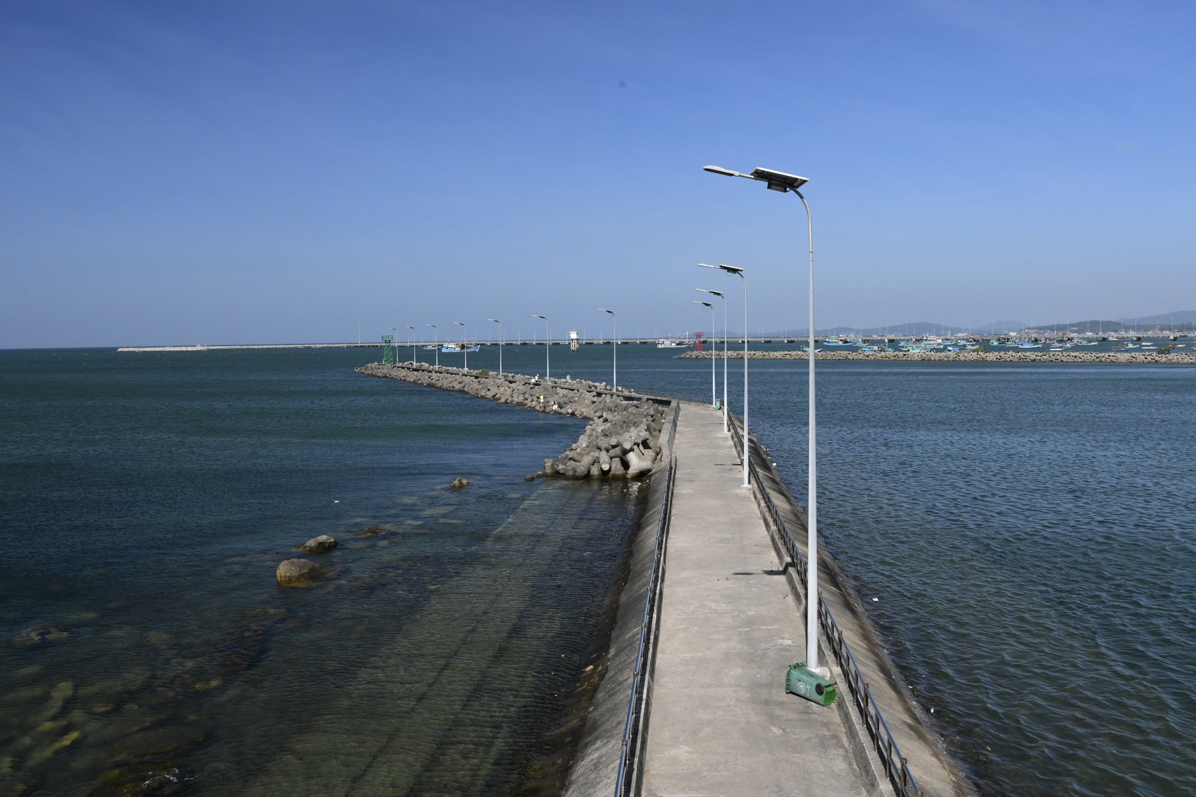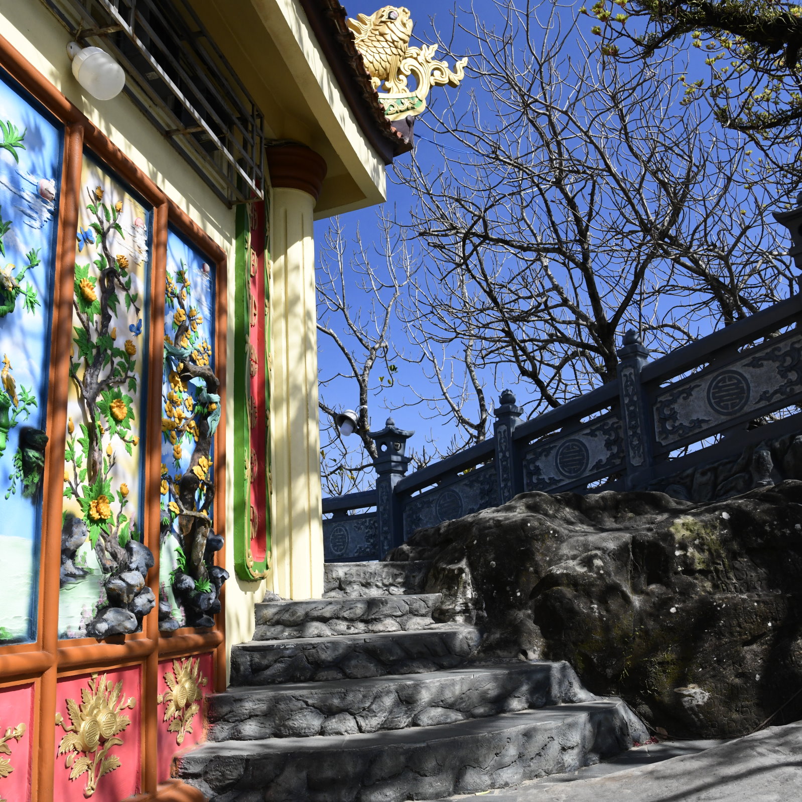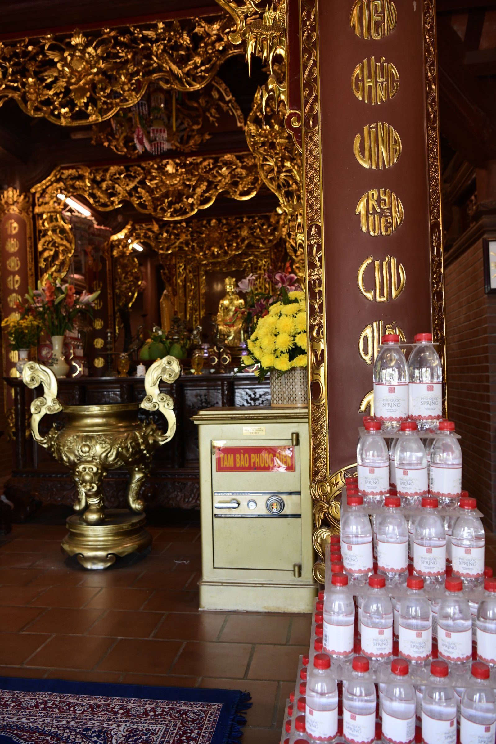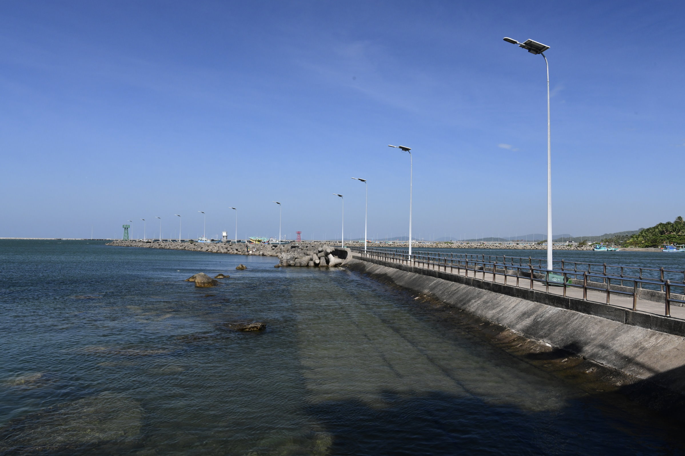 Auch am zweiten Tag sind wir wieder mit Tai Duc unterwegs, der uns gleich nach dem Frühstück am Hotel abholt und zu dem, einer Meeresgöttin gewidmeten kleinen Dinh Cậu Tempel am Fischereihafen bringt, den wir gestern Abend in der Dämmerung beim Essen in ein einem Fischrestaurant auf der anderen Seite der Mole nur schemenhaft erkennen konnten. Heute Morgen haben kräftige Windböen den Himmel leergefegt und der kleine Felsen mit dem blau-weißen Leuchtturm und der kleinen Pagode strahlt grell in der Sonne. Ideales Fotowetter für weitere Entdeckungen auf der Insel.