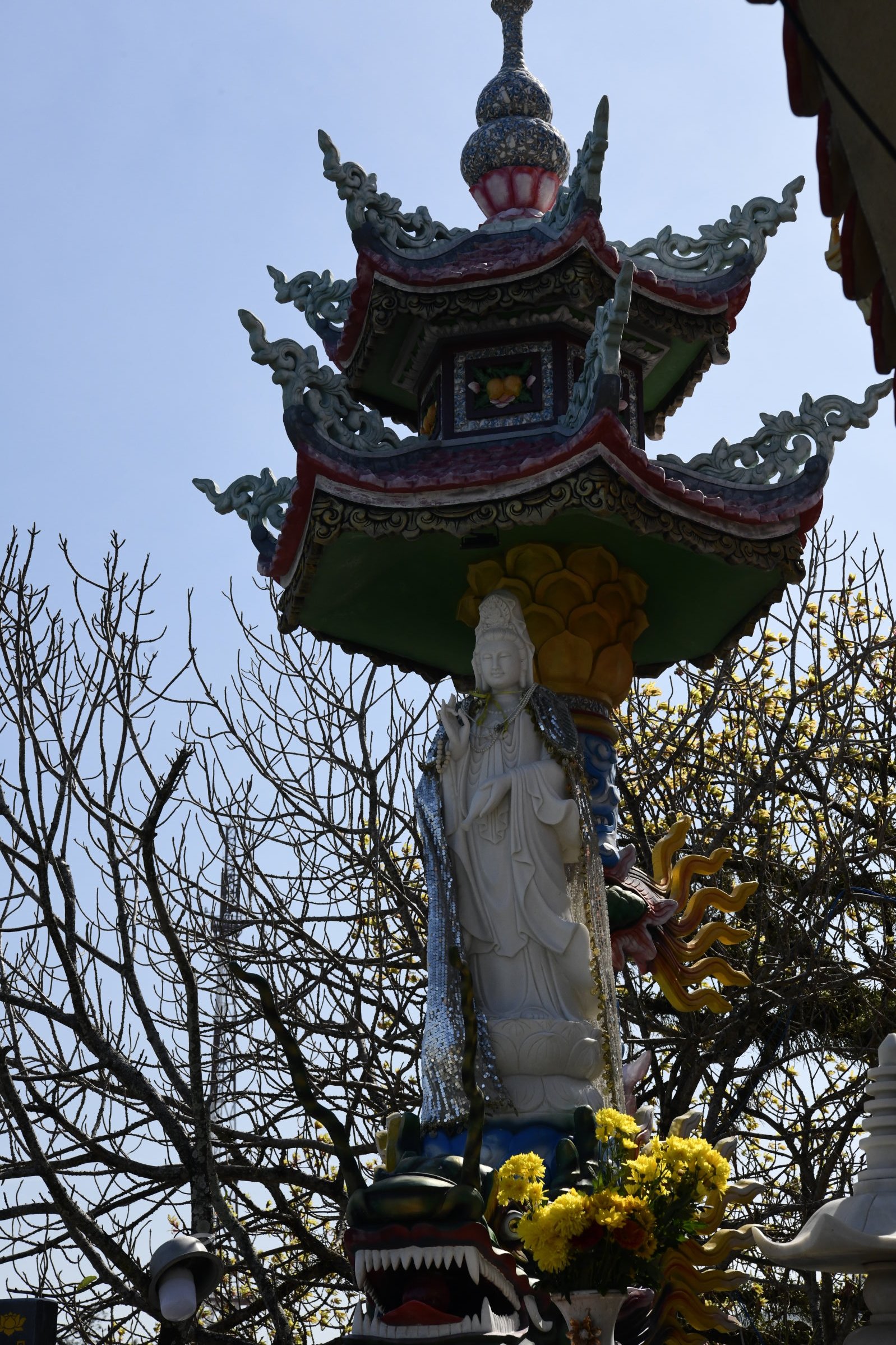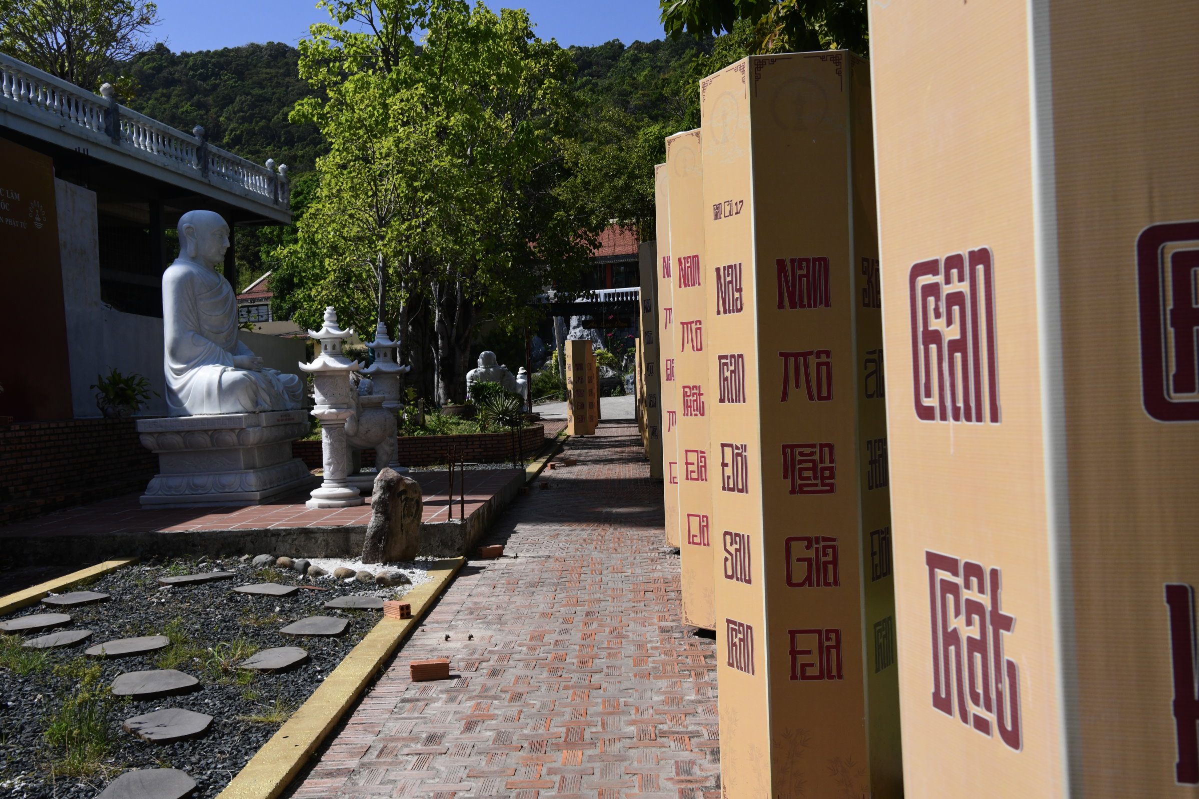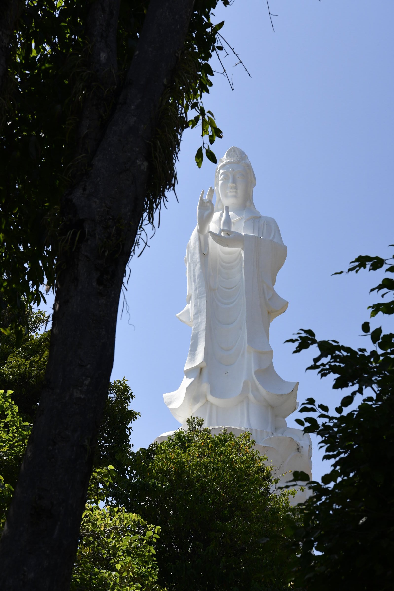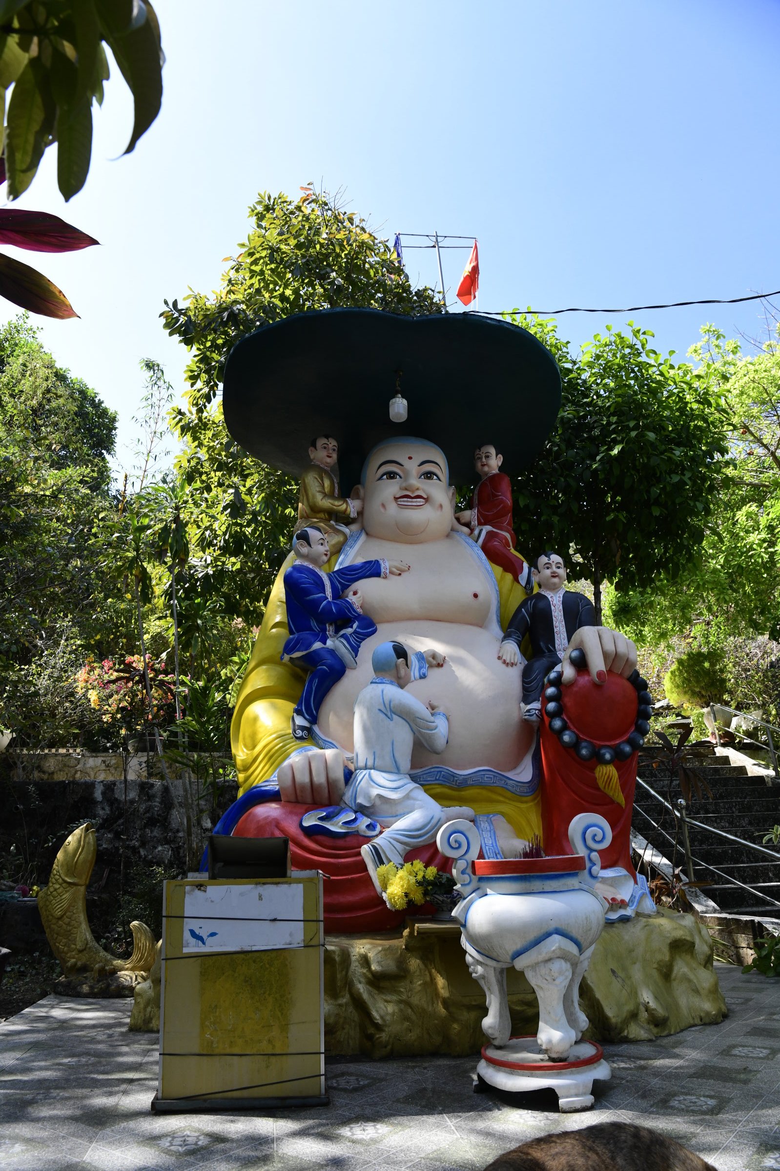 Bevor es dann endgültig Richtung Norden geht, macht Tai noch einen Abstecher zum Hộ Quốc Tempel, wo es einmal mehr treppauf geht, bis man oben bei einer strahlend weißen Lady Buddha Statue angelangt ist, die bei der Anfahrt bereits aus der Ferne zu sehen war. Am Ende der ersten rund 60 Stufen kann man nicht nur kurz verschnaufen, sondern auch gegen eine kleine Spende rote Bänder kaufen und mit seinen Wünschen versehen. Die werden dann an ein Gitter geknotet, damit der Wind sie zu der Gottheit emporträgt. Irgendwie gefällt mir diese Variante besser, als Schlößer an Brückengeländer zu schließen.