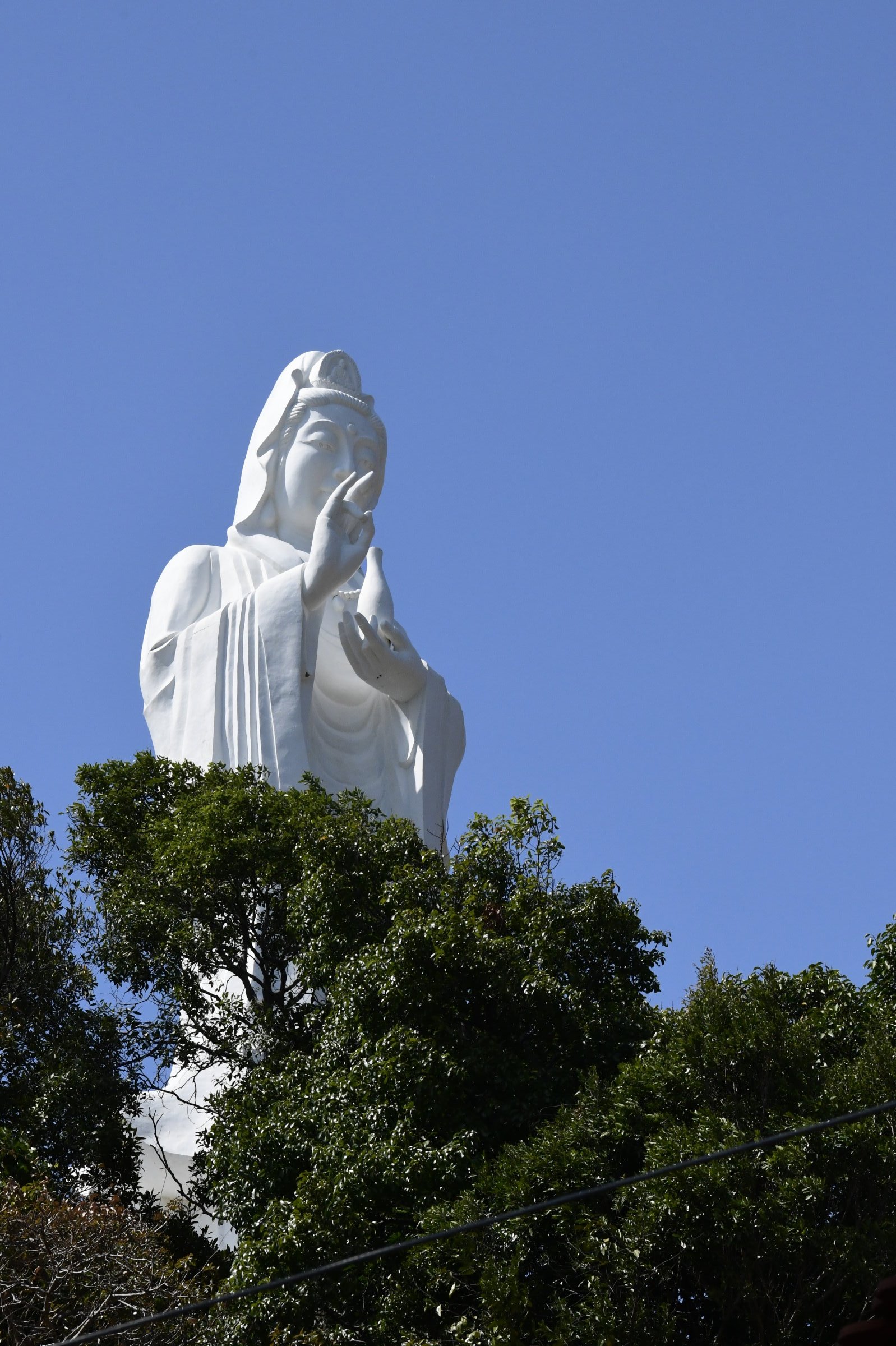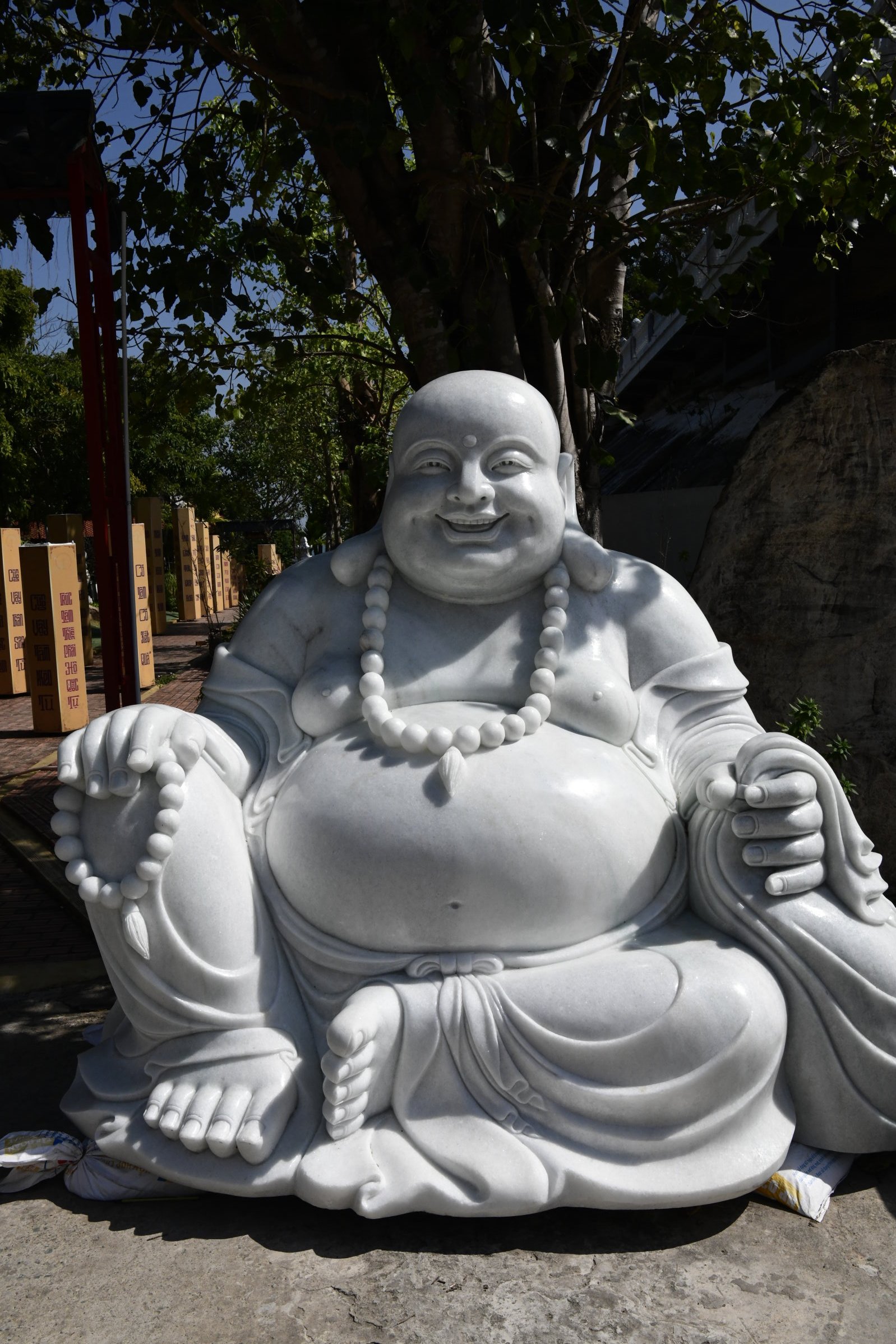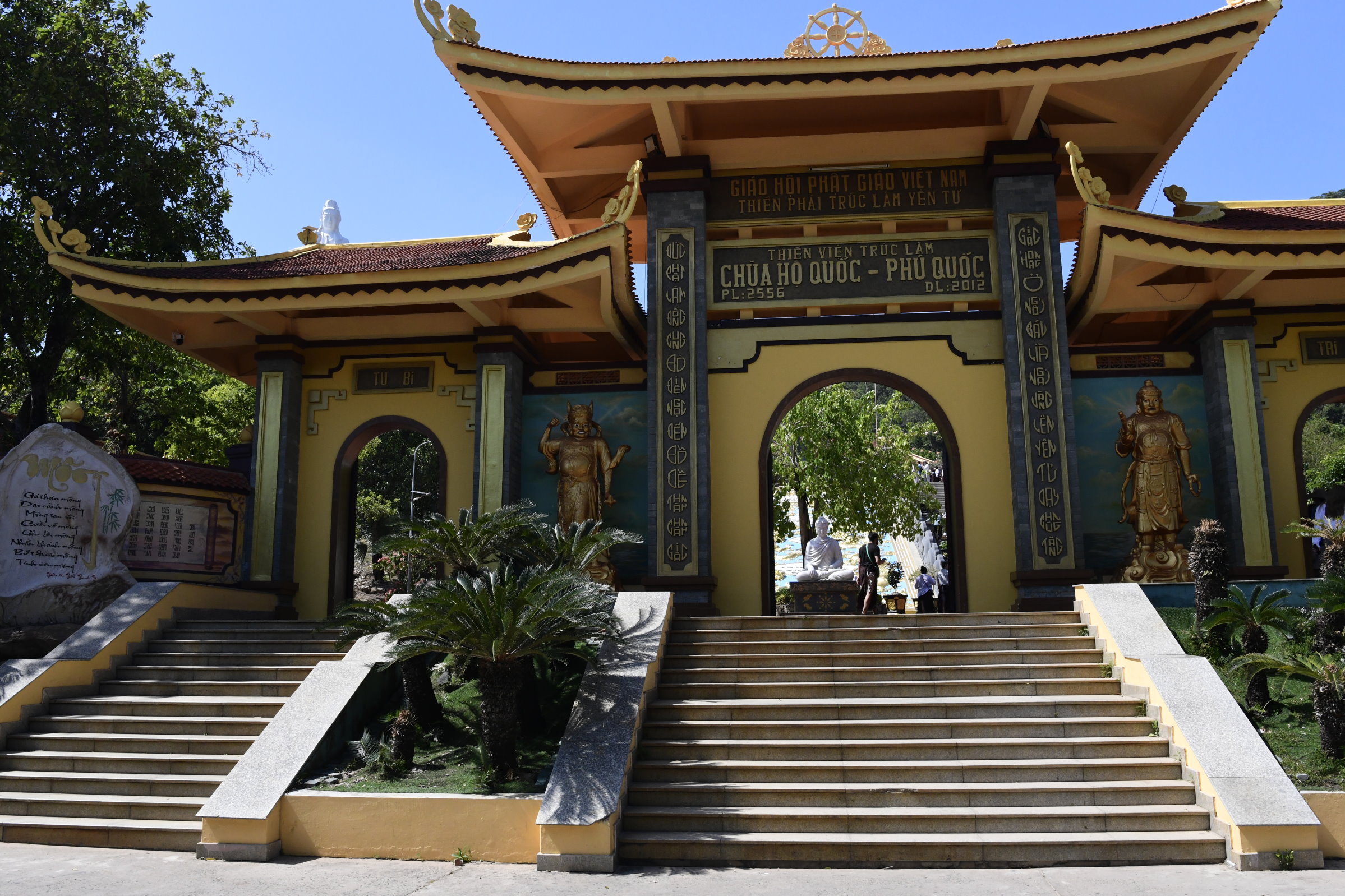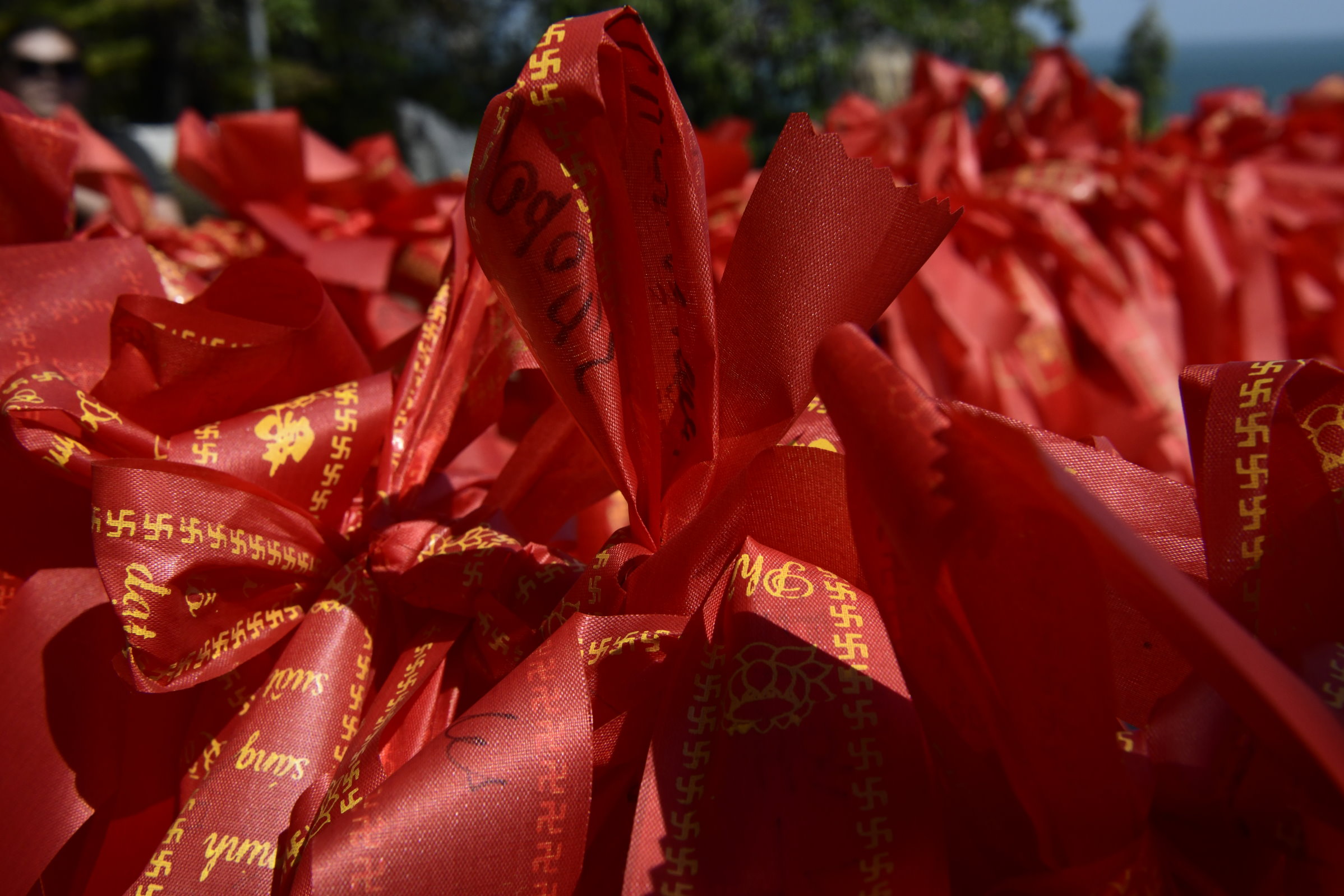 Bevor es dann endgültig Richtung Norden geht, macht Tai noch einen Abstecher zum Hộ Quốc Tempel, wo es einmal mehr treppauf geht, bis man oben bei einer strahlend weißen Lady Buddha Statue angelangt ist, die bei der Anfahrt bereits aus der Ferne zu sehen war. Am Ende der ersten rund 60 Stufen kann man nicht nur kurz verschnaufen, sondern auch gegen eine kleine Spende rote Bänder kaufen und mit seinen Wünschen versehen. Die werden dann an ein Gitter geknotet, damit der Wind sie zu der Gottheit emporträgt. Irgendwie gefällt mir diese Variante besser, als Schlößer an Brückengeländer zu schließen.