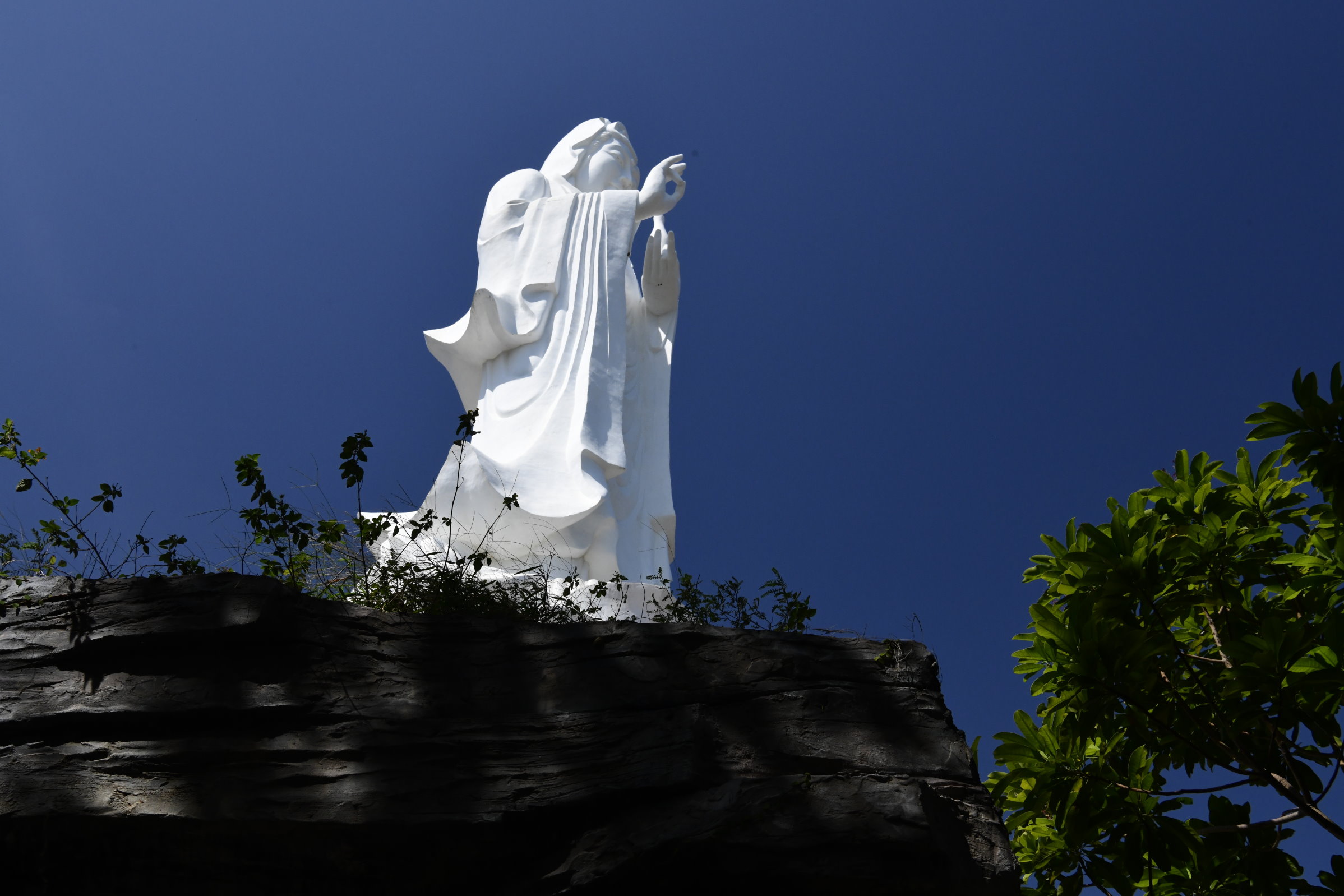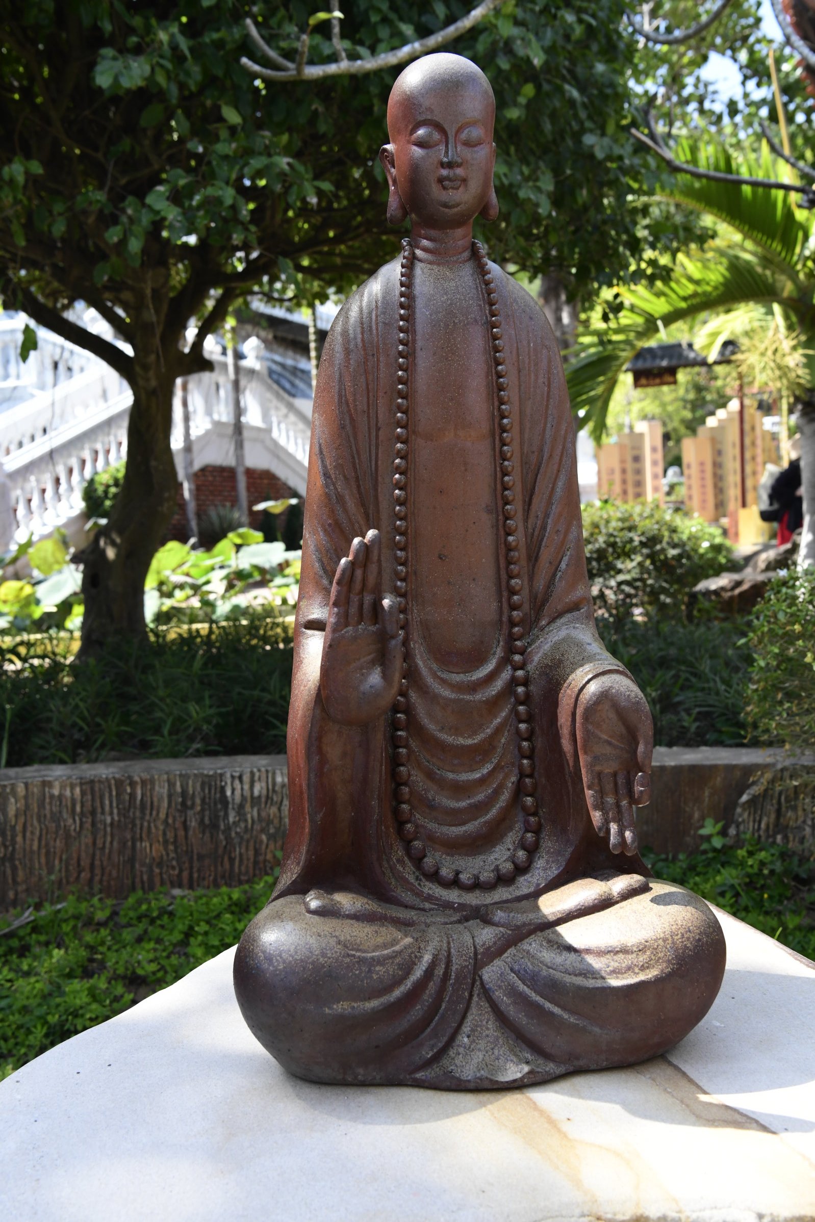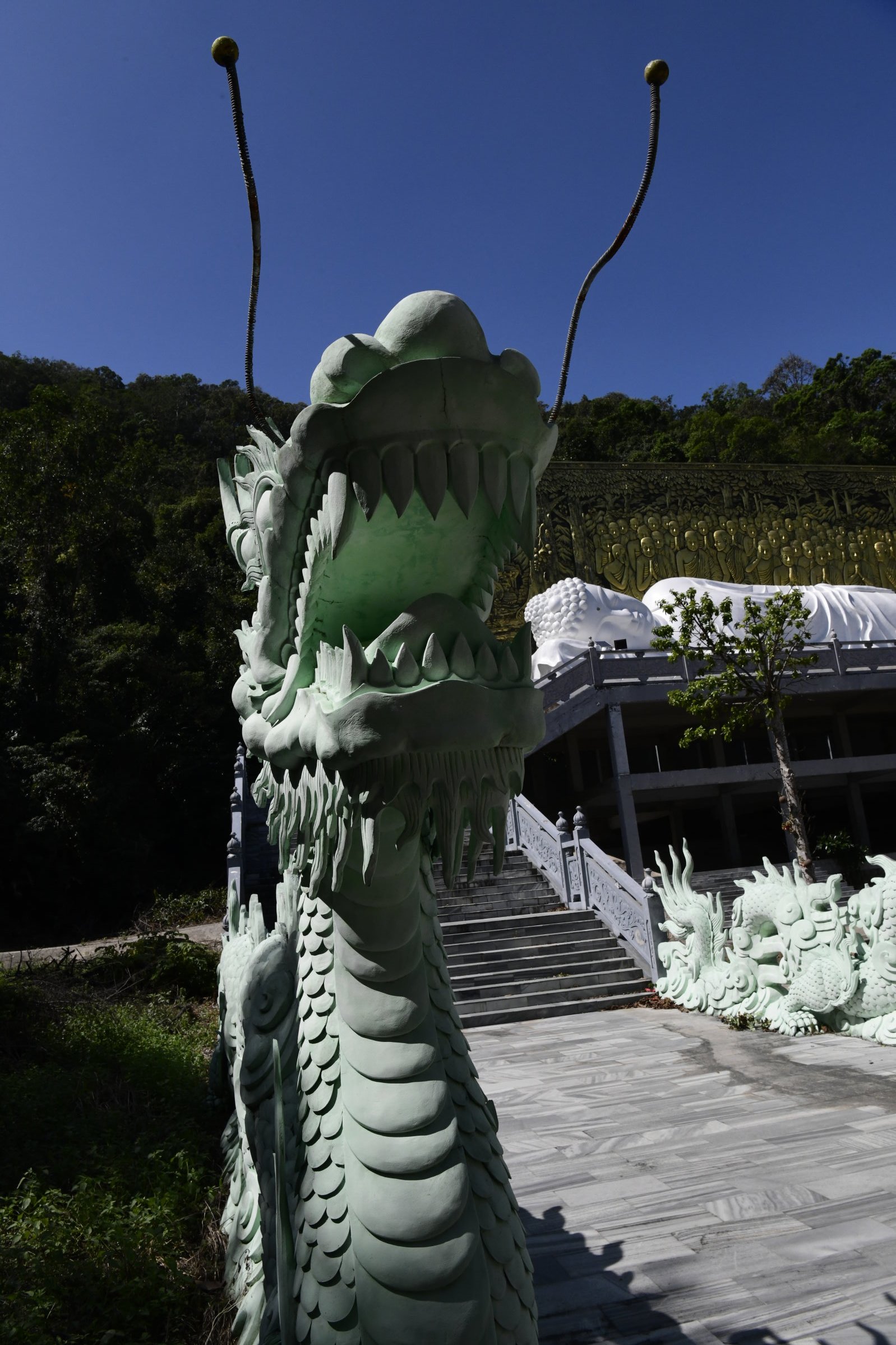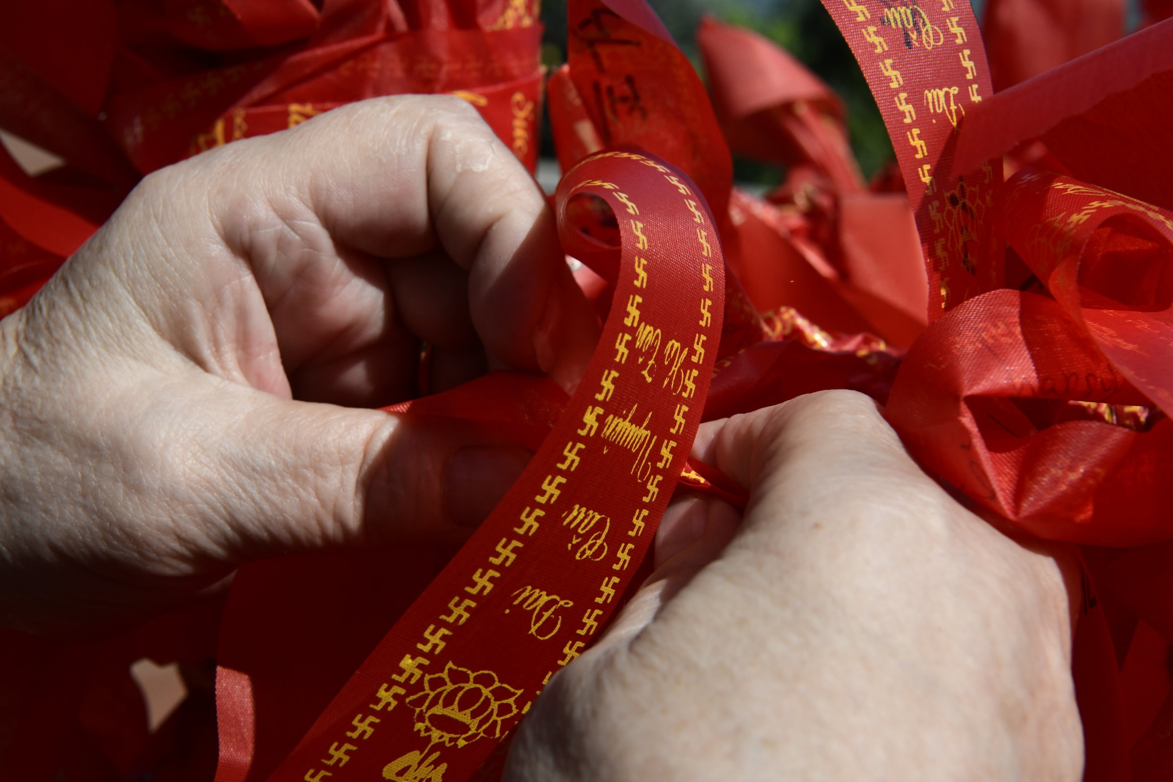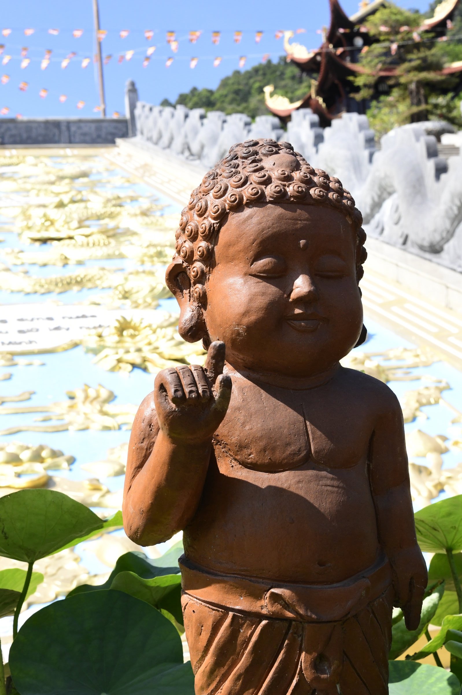 Bevor es dann endgültig Richtung Norden geht, macht Tai noch einen Abstecher zum Hộ Quốc Tempel, wo es einmal mehr treppauf geht, bis man oben bei einer strahlend weißen Lady Buddha Statue angelangt ist, die bei der Anfahrt bereits aus der Ferne zu sehen war. Am Ende der ersten rund 60 Stufen kann man nicht nur kurz verschnaufen, sondern auch gegen eine kleine Spende rote Bänder kaufen und mit seinen Wünschen versehen. Die werden dann an ein Gitter geknotet, damit der Wind sie zu der Gottheit emporträgt. Irgendwie gefällt mir diese Variante besser, als Schlößer an Brückengeländer zu schließen.