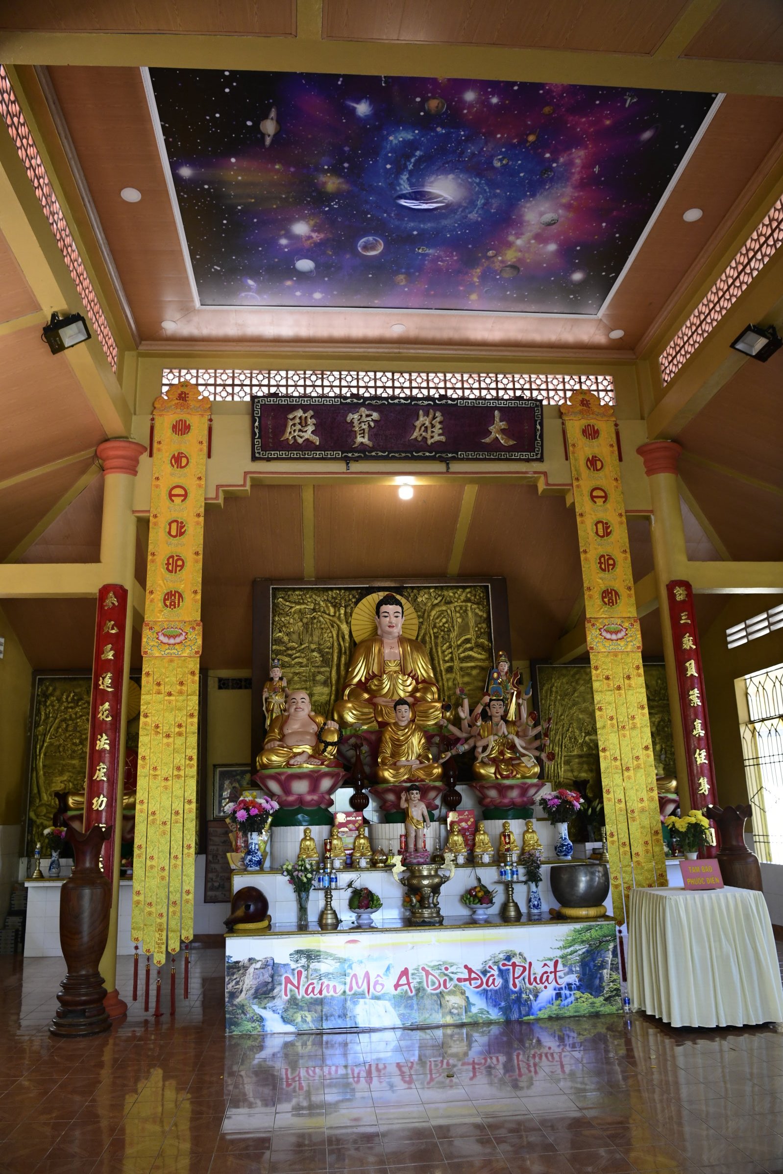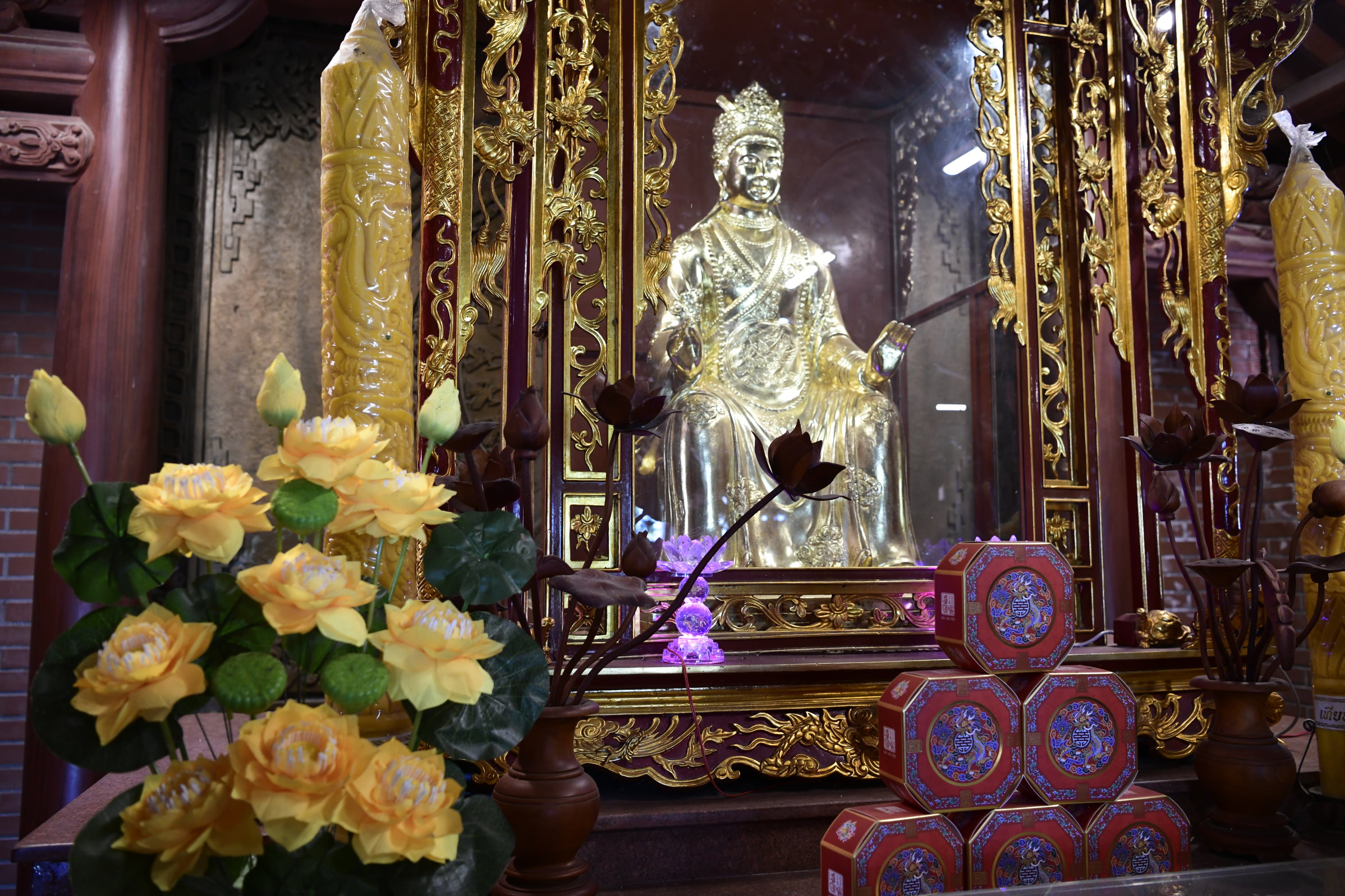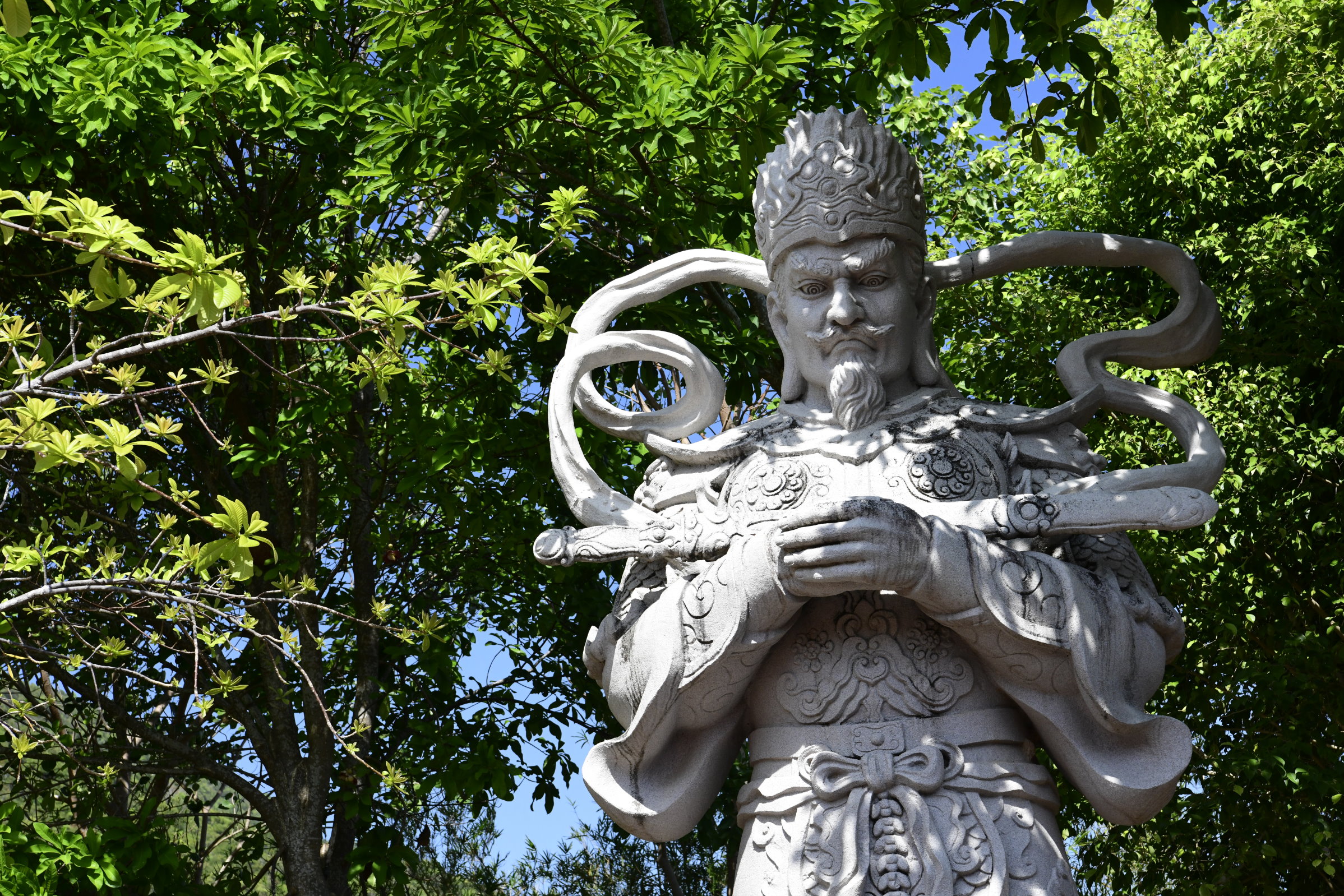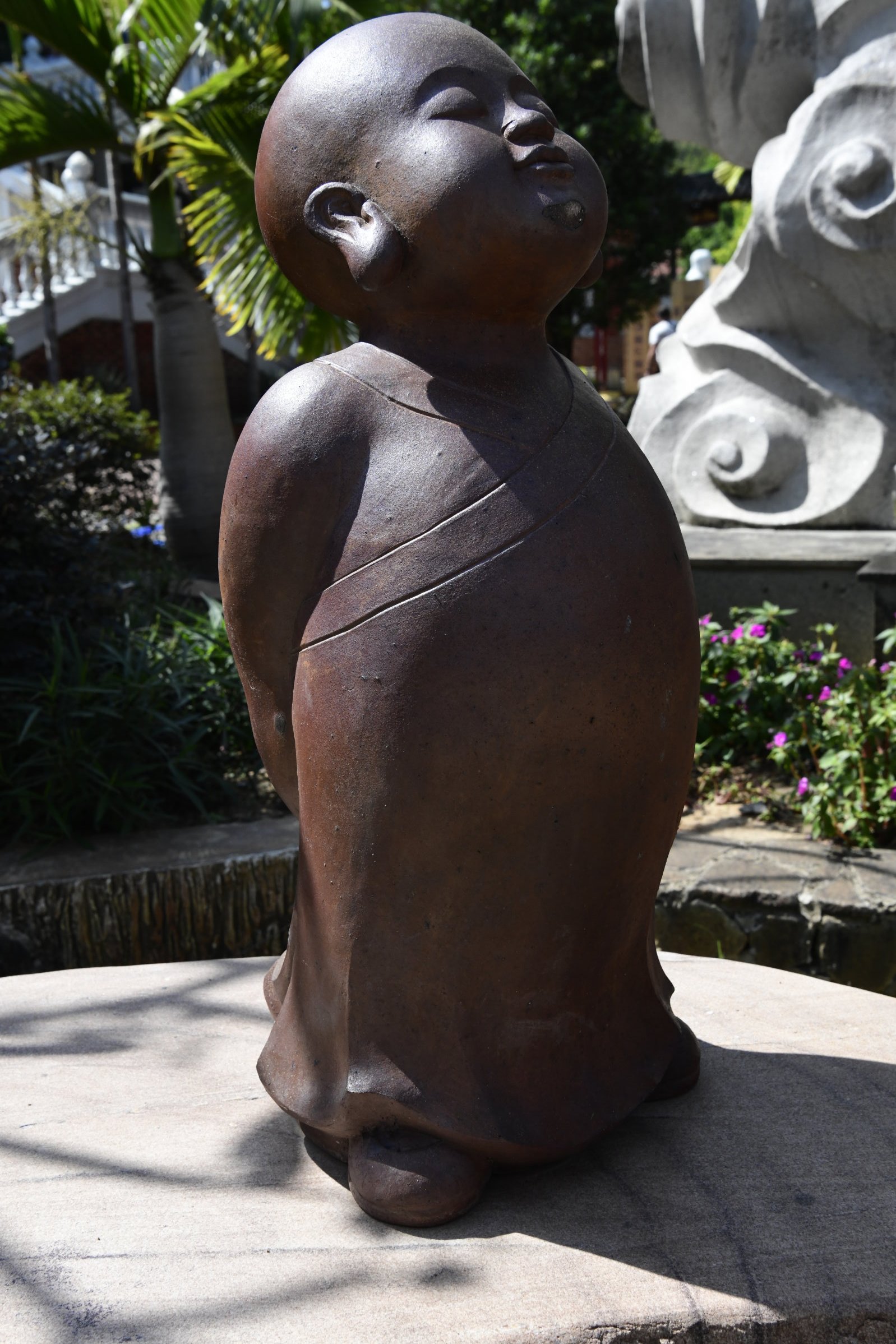 Bevor es dann endgültig Richtung Norden geht, macht Tai noch einen Abstecher zum Hộ Quốc Tempel, wo es einmal mehr treppauf geht, bis man oben bei einer strahlend weißen Lady Buddha Statue angelangt ist, die bei der Anfahrt bereits aus der Ferne zu sehen war. Am Ende der ersten rund 60 Stufen kann man nicht nur kurz verschnaufen, sondern auch gegen eine kleine Spende rote Bänder kaufen und mit seinen Wünschen versehen. Die werden dann an ein Gitter geknotet, damit der Wind sie zu der Gottheit emporträgt. Irgendwie gefällt mir diese Variante besser, als Schlößer an Brückengeländer zu schließen.