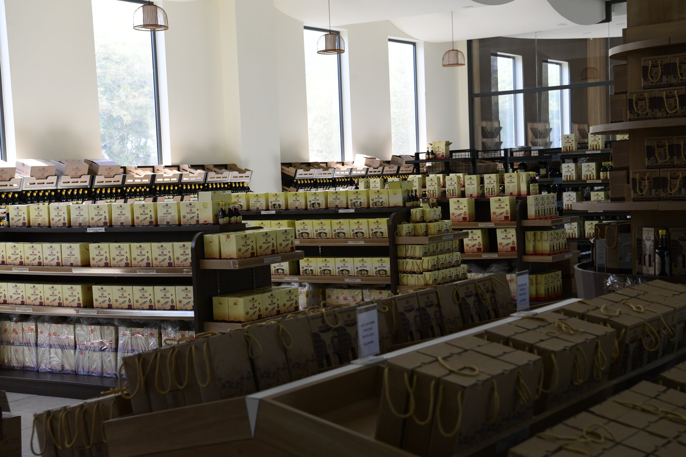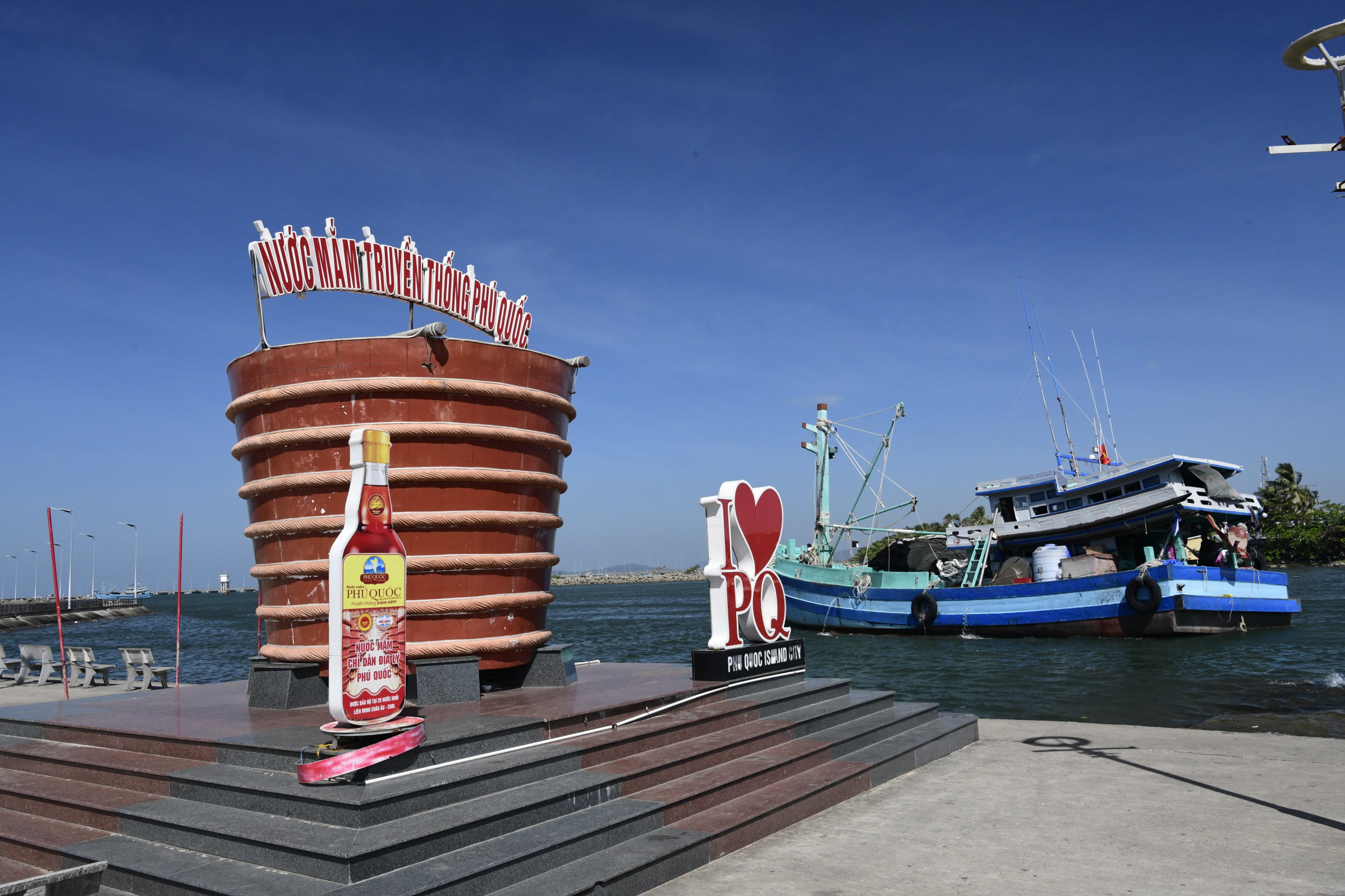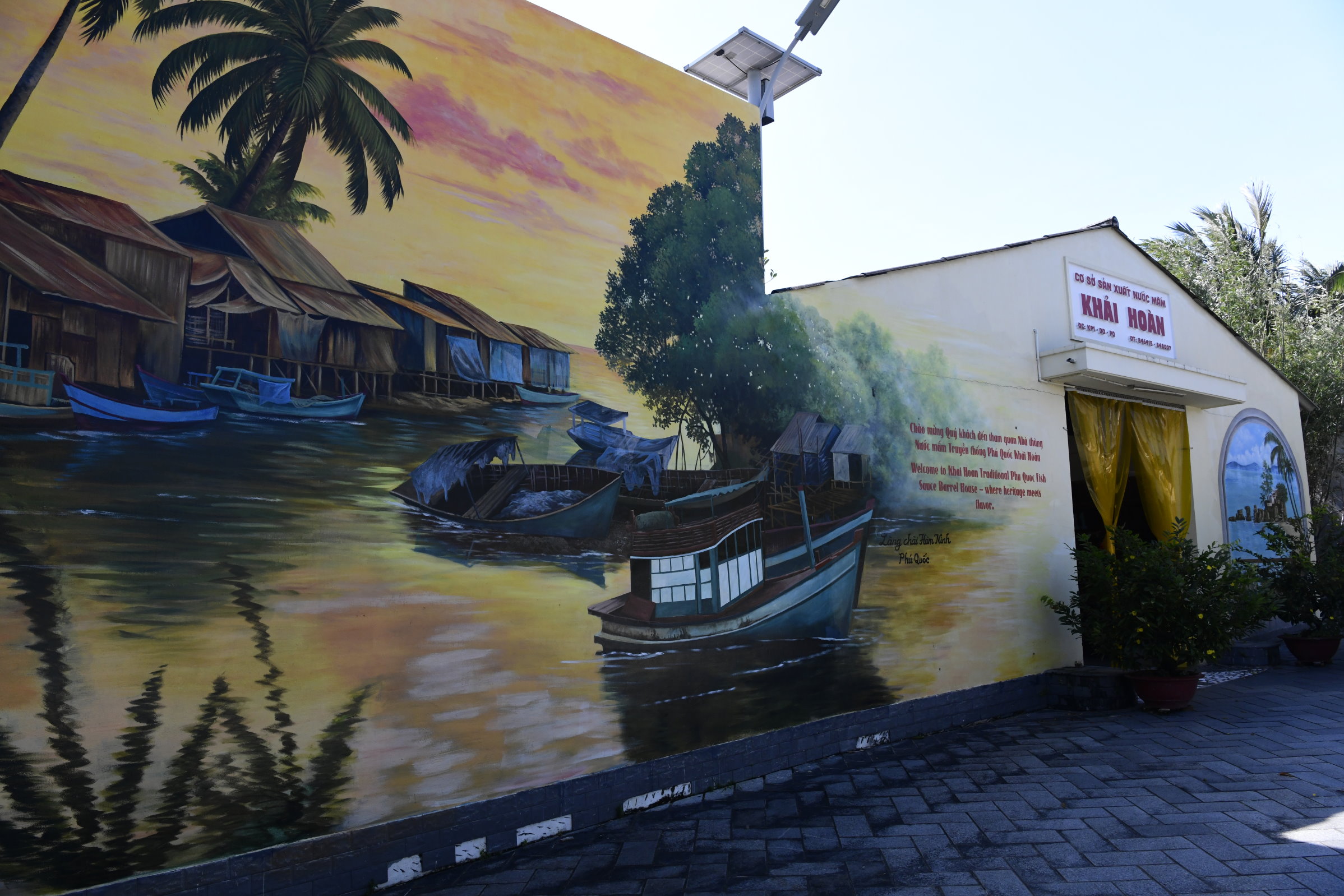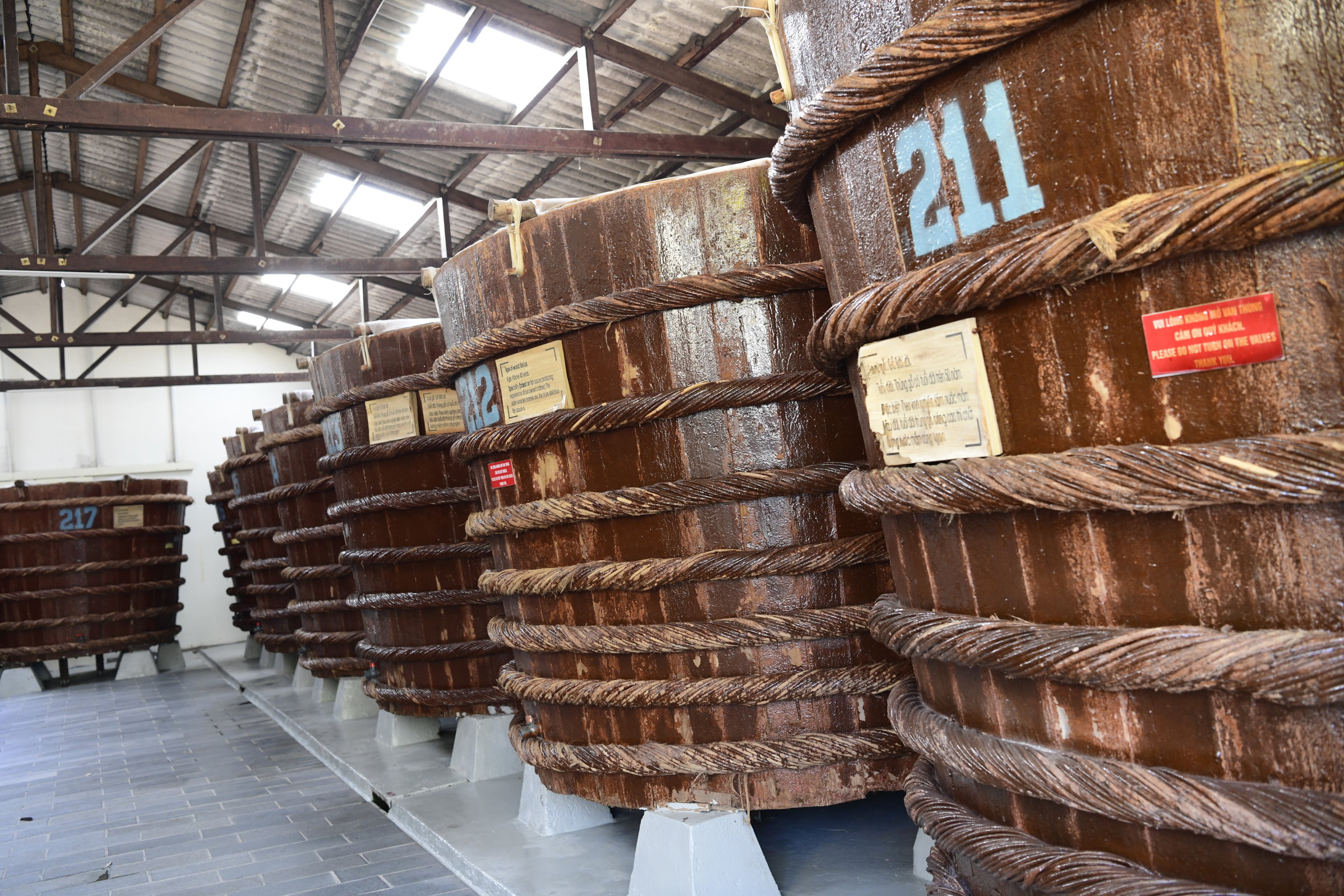 Für eine weitere Spezialität der Insel wird gleich neben dem Tempel ganz direkt geworben. Die für zahlreiche asiatischen Gerichte unabdingbare Fischsauce, die in dieser Gegend produziert wird, gilt als die Beste überhaupt. Also fährt Tai mit uns erst einmal Richtung Süden zu einem bekannten Hersteller. Stolz zeigt uns ein Mitarbeiter von Công ty cổ phần Thương Mại Khải Hoàn die großen Holzfässer, in denen pro Fass 15 Tonnen Anchovis in Salz eingelegt und mindestens ein Jahr lang fermentiert werden.