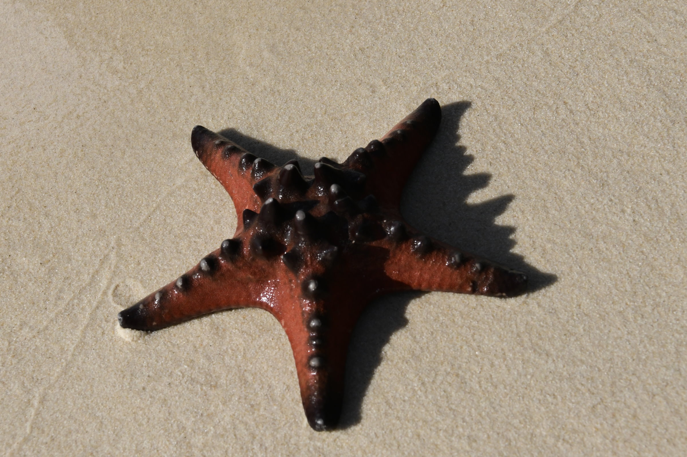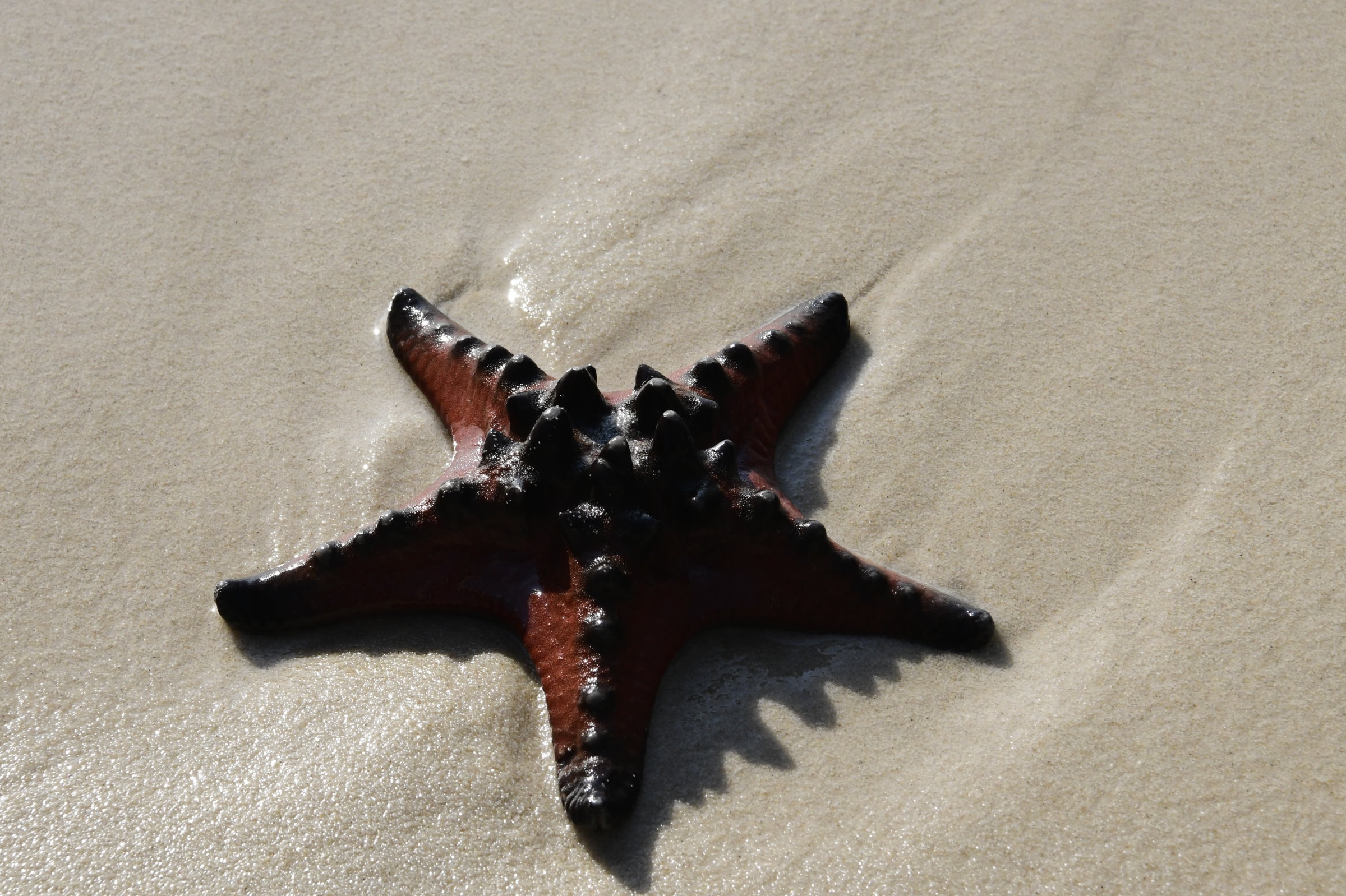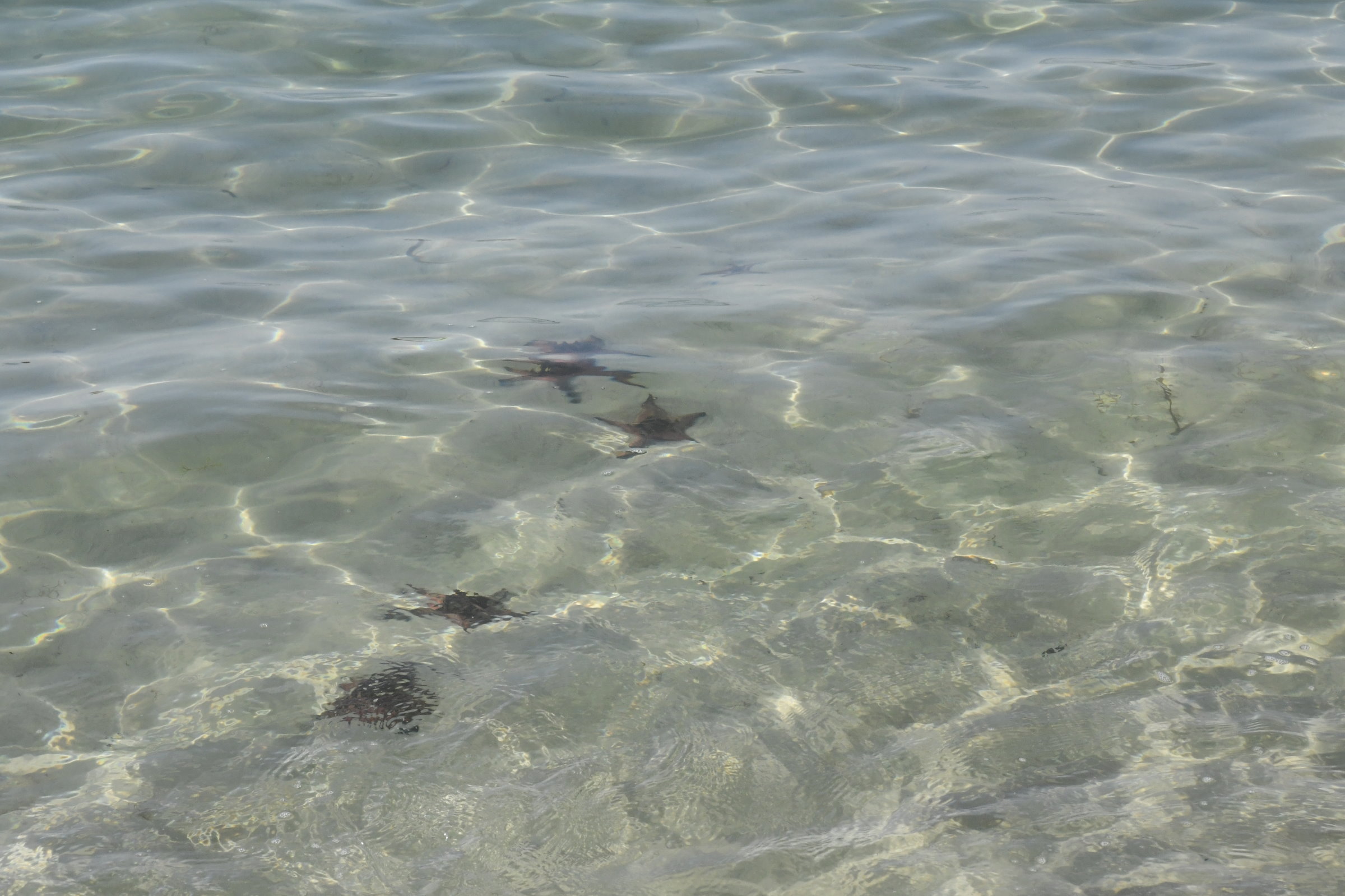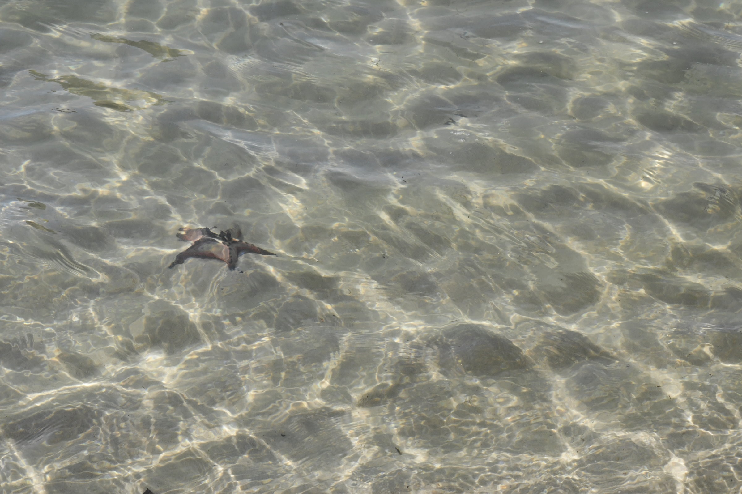Zur Belohnung wartet am anderen Ende ein Strandabschnitt, an dem sich bereits viele Touristen tummeln, die in dem kristallklaren Wasser nicht nur Baden, sondern auch Seesterne entdecken wollen. Die Flut ist kurz vor dem höchsten Wasserstand, so dass man die meisten von Ihnen im glasklaren Wasser sehen kann. Einen hat es allerdings an den Strand gespült und er scheint auf die nächste große Welle zu warten, die ihn wieder mit ins feuchte Nass nimmt.