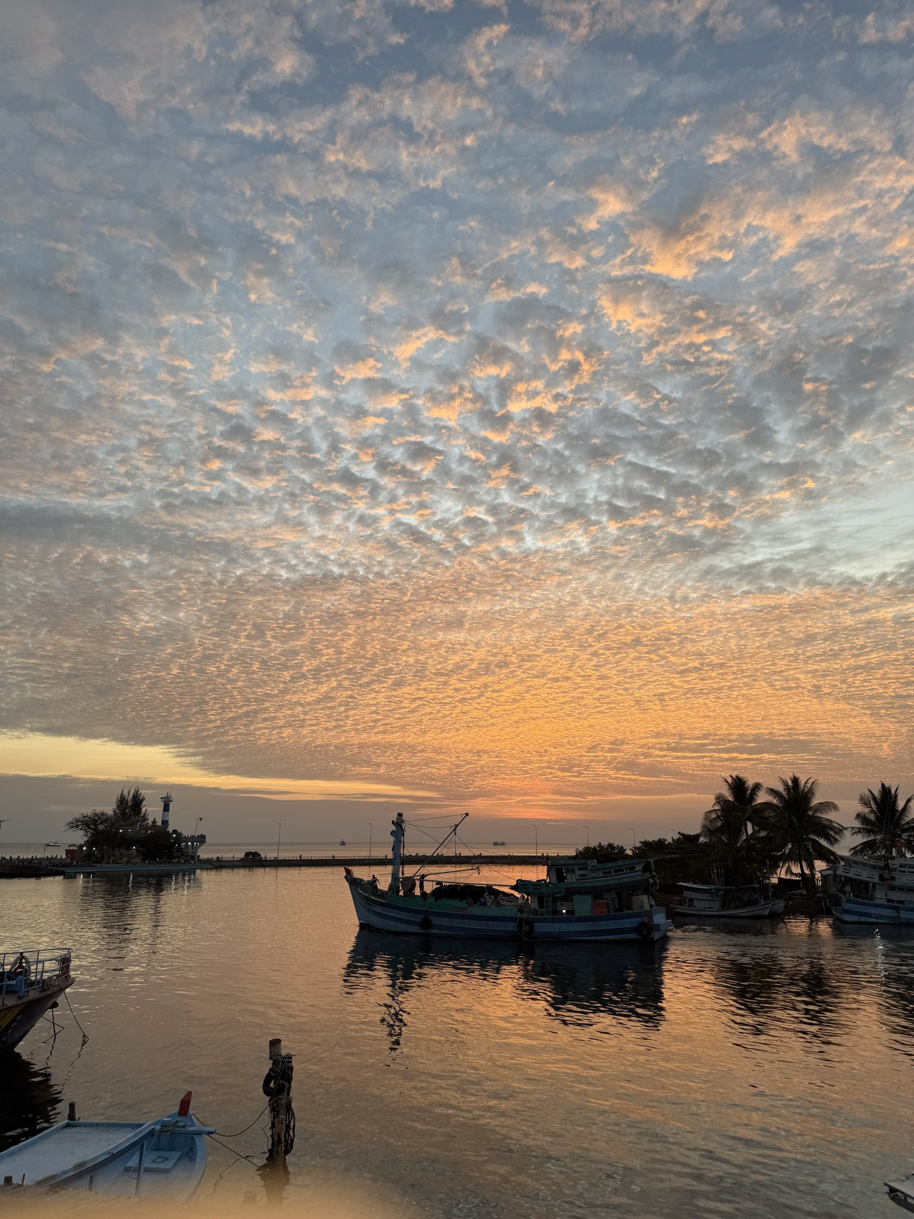Wir haben genug gesehen und balancieren über den Steg wieder zurück zum Transferboot, denn wir wollen noch vor Sonnenuntergang in der Stadt zurück sein. Das Timing ist perfekt. Nachdem wir uns kurz im Hotel frisch gemacht haben, bringt uns Tai in das Fischrestaurant vom Vorabend. Dort erleben wir diesmal einen perfekten Sonnenuntergang, bei dem ein Teil des Himmels von kleinen Schäfchenwolken bedeckt wird und regelrecht zu glühen scheint.