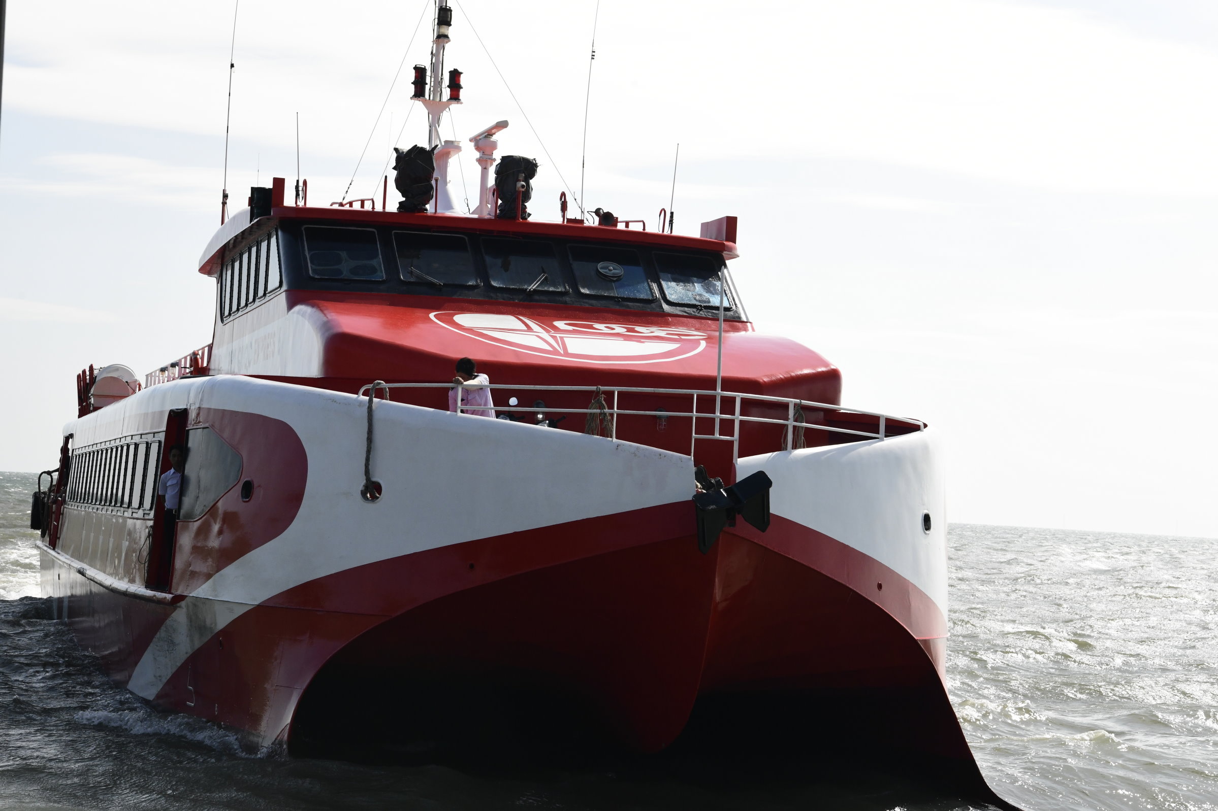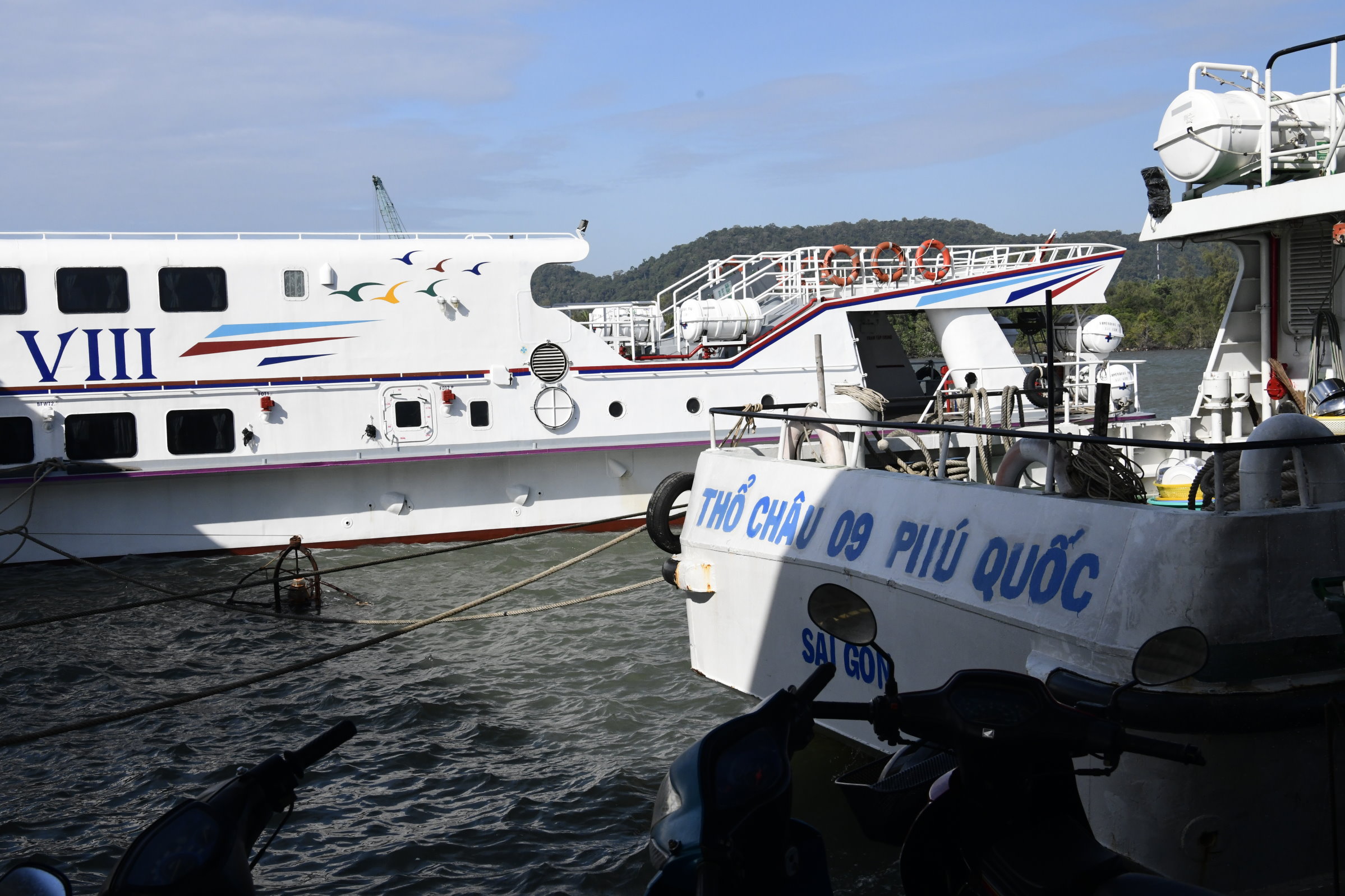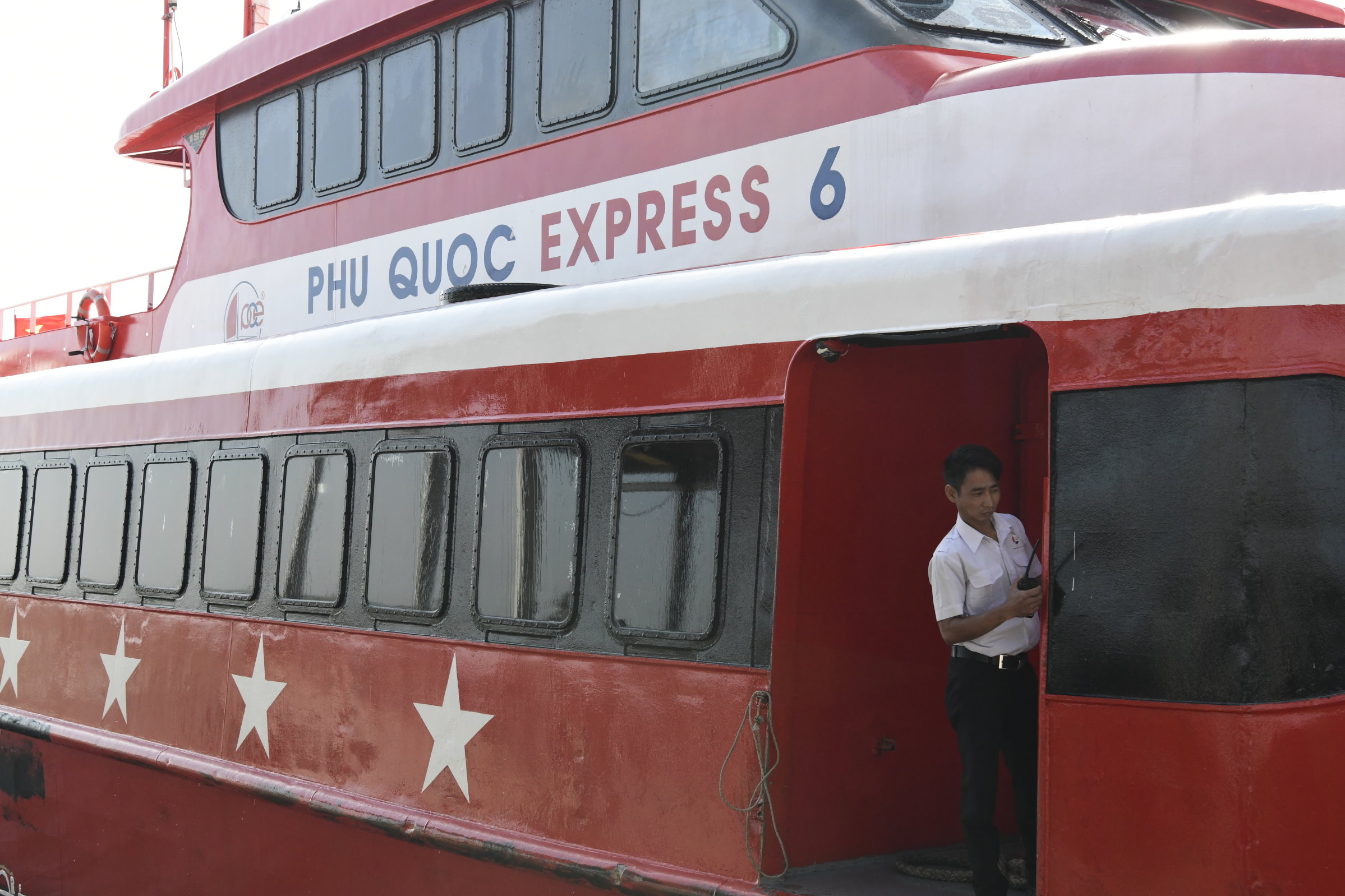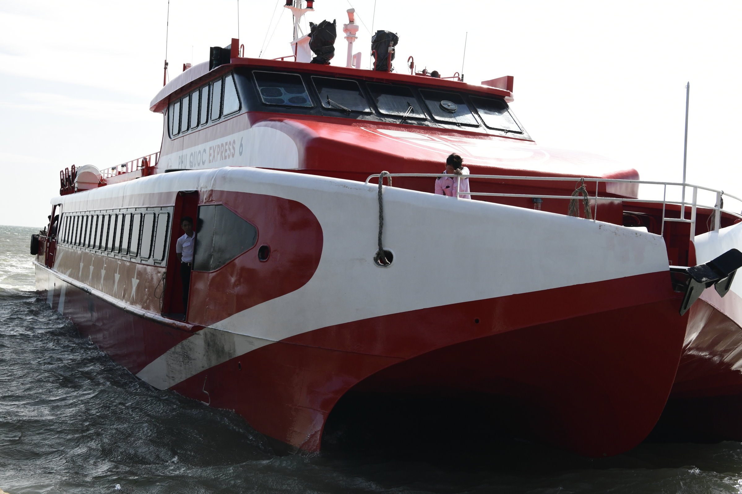Unser Fahrer Tai Duc ist einfach jeden Dong wert. Morgens um halb Neun holt er uns am Hotel ab und bringt uns zum 15 Kilometer entfernten Hafen Bai Vong, auf der gegenüberliegenden Seite der Insel. Von dort aus soll es mit dem Phu Quoc Express aufs Festland nach Rach Gia gehen soll. Auf halber Strecke hält er an einer Verkaufsstelle für die Tickets. Der Vorteil: Da es direkt an der Anlegestelle keine Möglichkeit für den Ticket-Kauf zu geben scheint, kann er direkt aufs Pier zu den Booten fahren und erspart uns so, unsere Rucksäcke bis dorthin zu tragen.