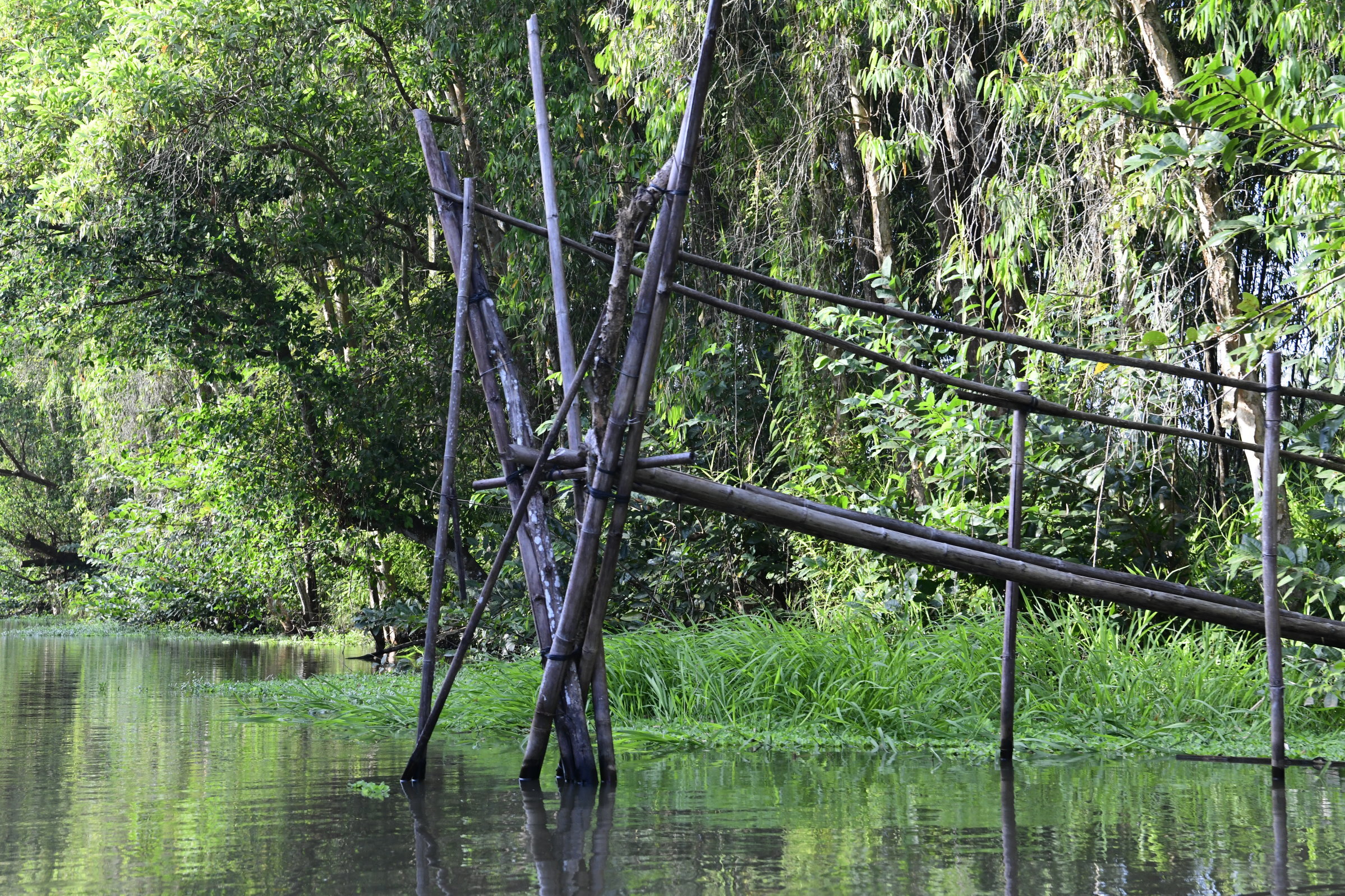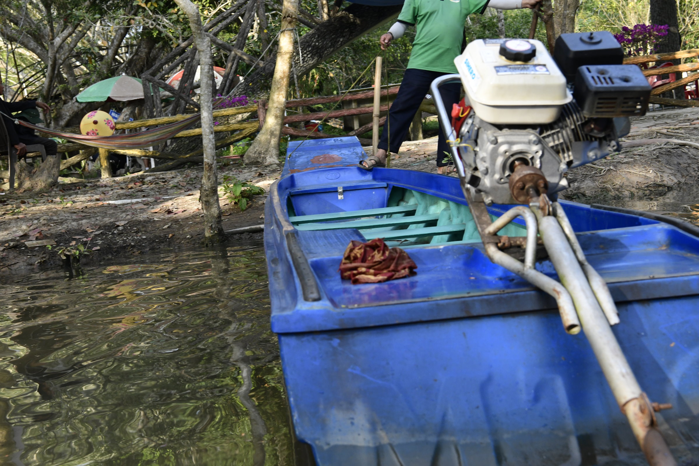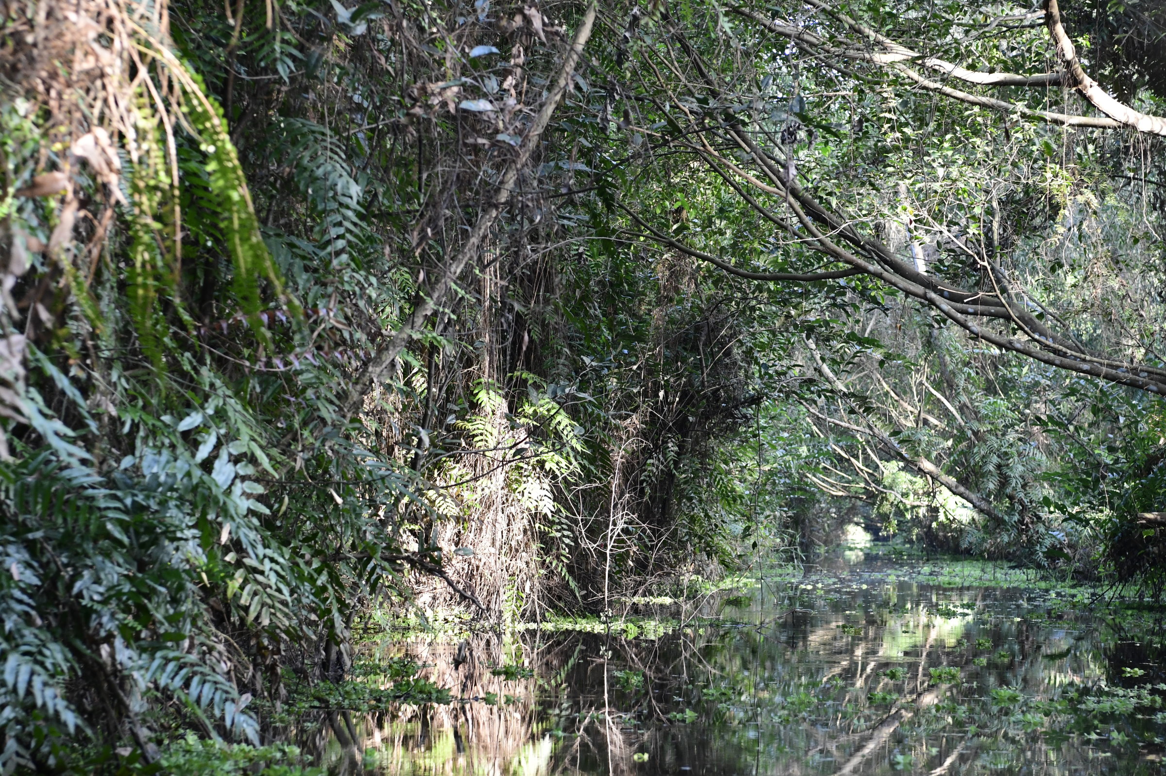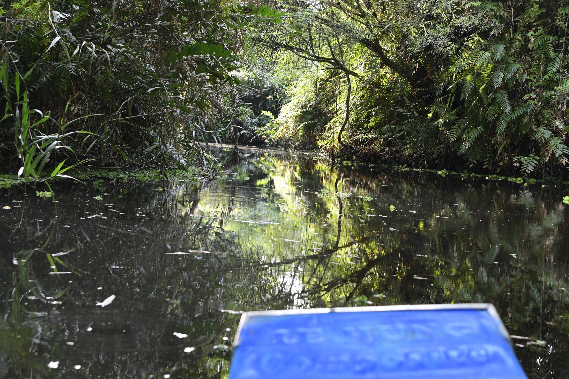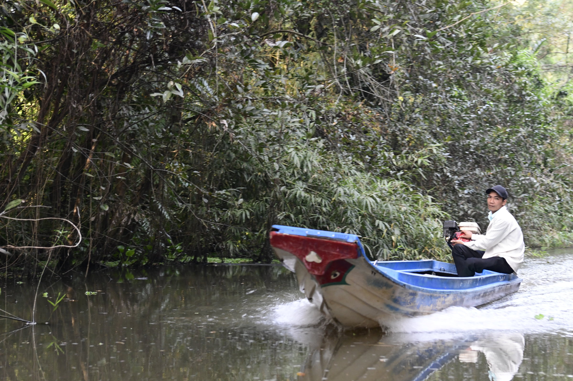 Am Ende unserer Etappe auf dem Rundweg wartet an einem Aussichtsturm ein Langboot auf uns, so dass wir nicht wir den ganzen Weg zurücklaufen müssen. Die moosbedeckten Kajeput-Wälder entlang der Kanäle lassen sich auf diese Weise bequem erkunden, auch wenn sich die seltenen Tiere naturgemäß um diese Tageszeit rarmachen.