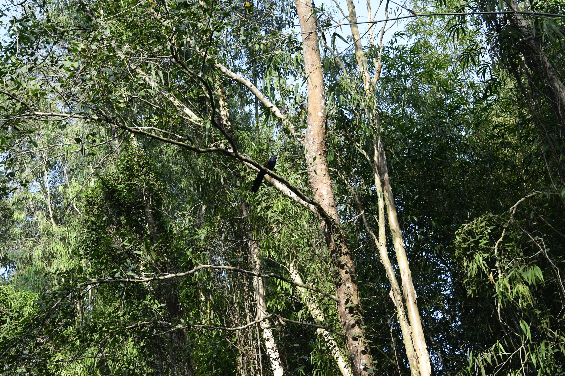 Lediglich ein großer schwarzer Vogel hockt auf einem Ast über dem Wasser. Es handelt sich vermutlich um einen Seidenkuckuck, erkennbar an dem langen Schwanzgefieder und dem mit auffallend großen Schnabel.