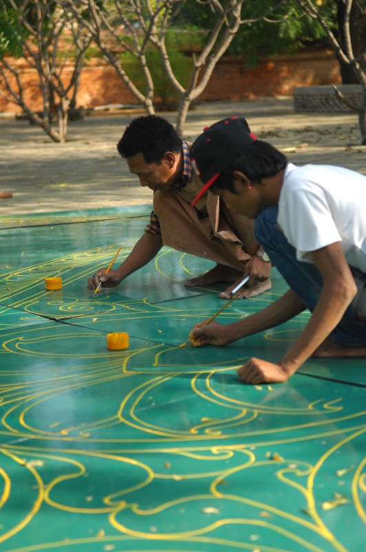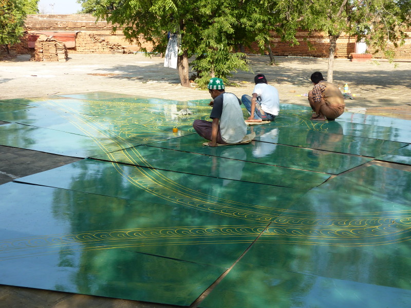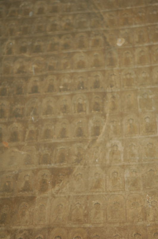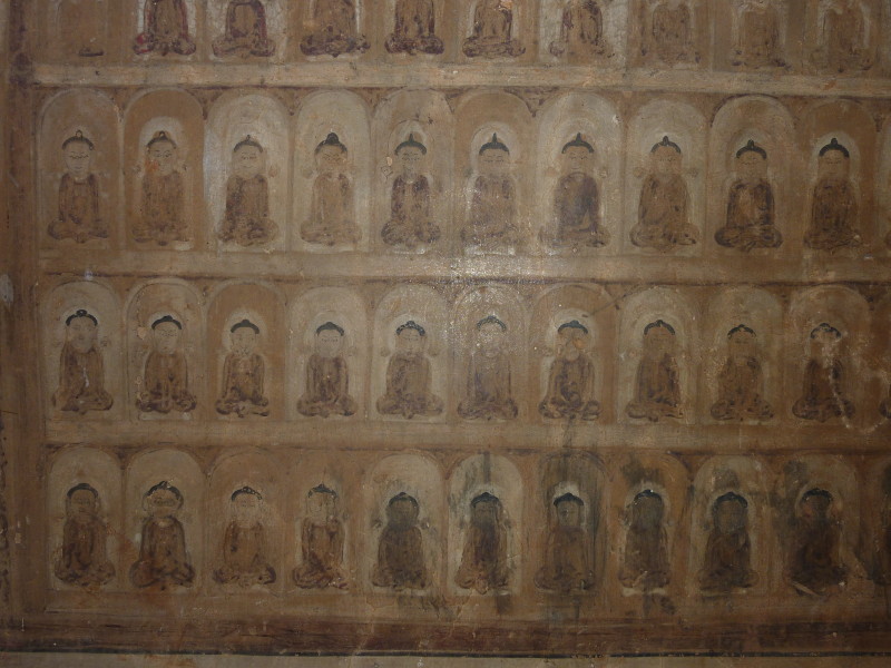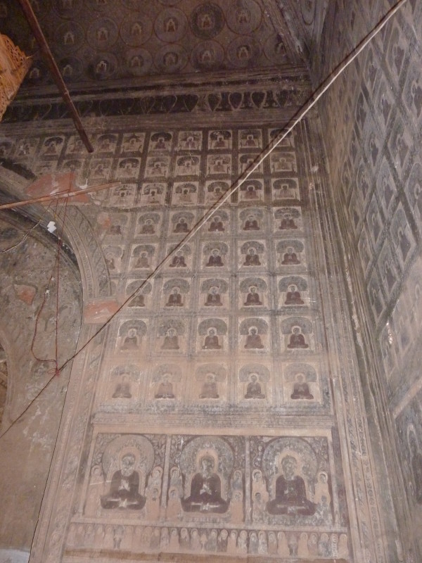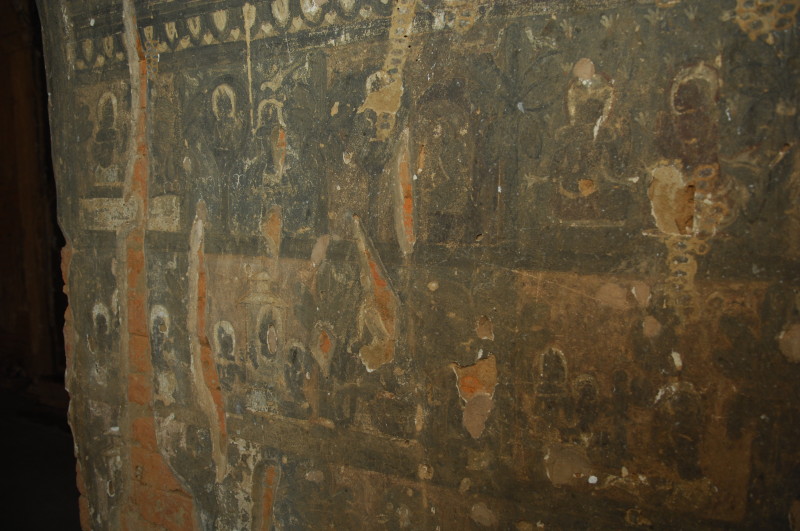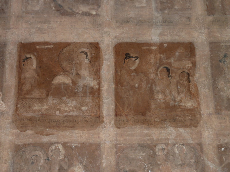 Quadratischer Tempel mit vier gleich gestalteten Seiten in der Nähe des Dorfs Minnanthu. Im Inneren fast vollständig mit Wand- und Deckenmalereien gestaltet. Sie zeigen zahlreiche Szenen aus dem Leben Buddhas und tierische Fabelwesen. - Dhammayazika Tempel (1196 a.D.)