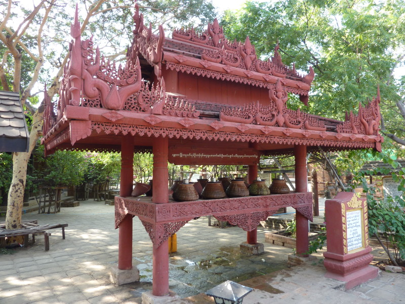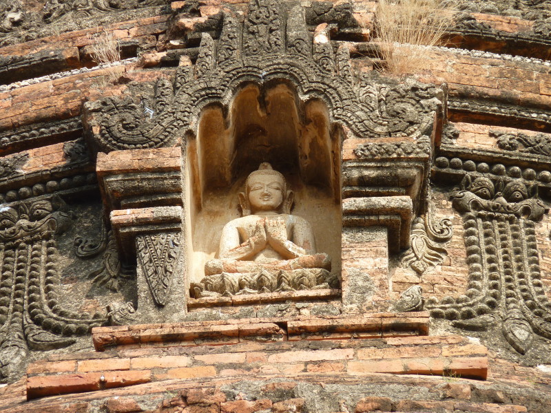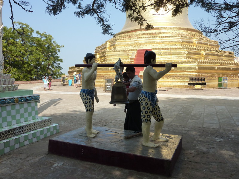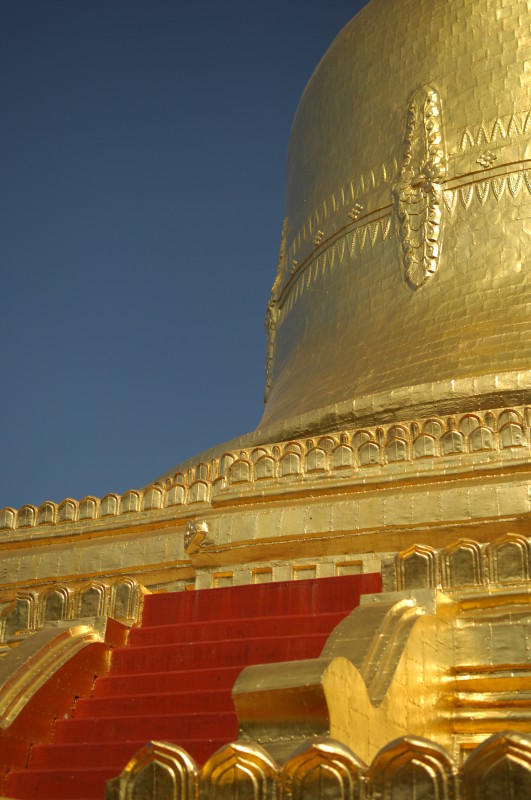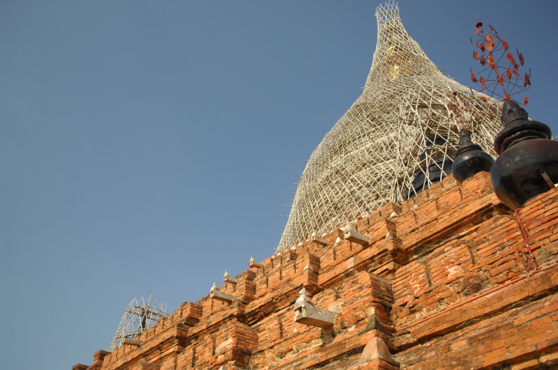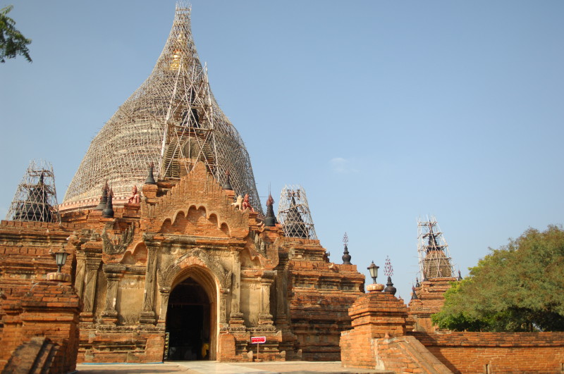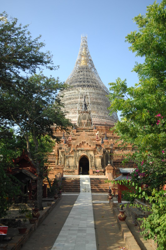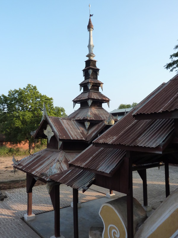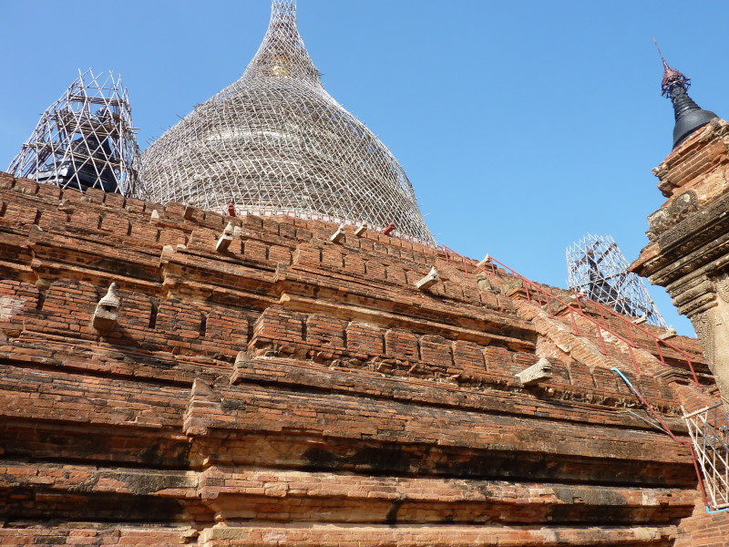 Stupa mit fünfseitigen Terrassen, der derzeit umfangreich restauriert wird. In den vorgelagerten fünf Tazaung werden nicht nur die vier Buddhas des jetzigen Zeitalters verehrt, sondern auch der zukünftige Buddha Metteya. Die Terrassen sind wegen der Bauarbeiten derzeit nicht zugänglich. - Thisawadi Tempel