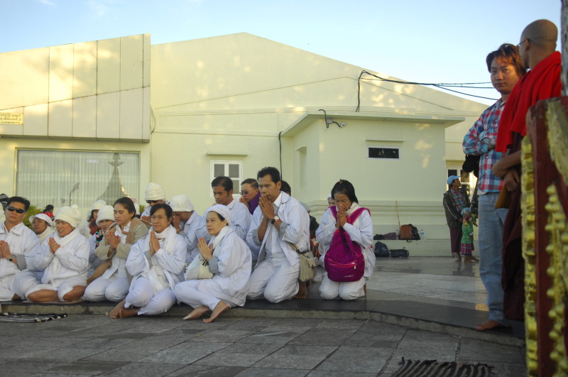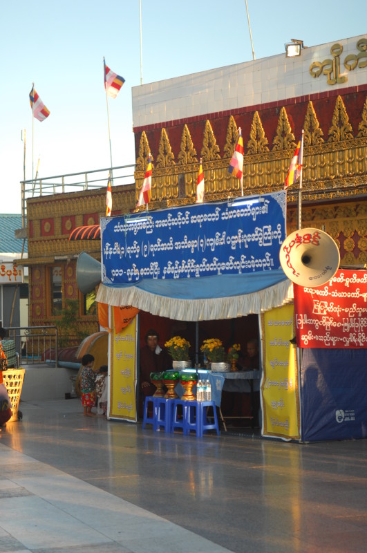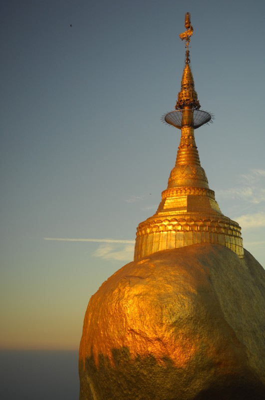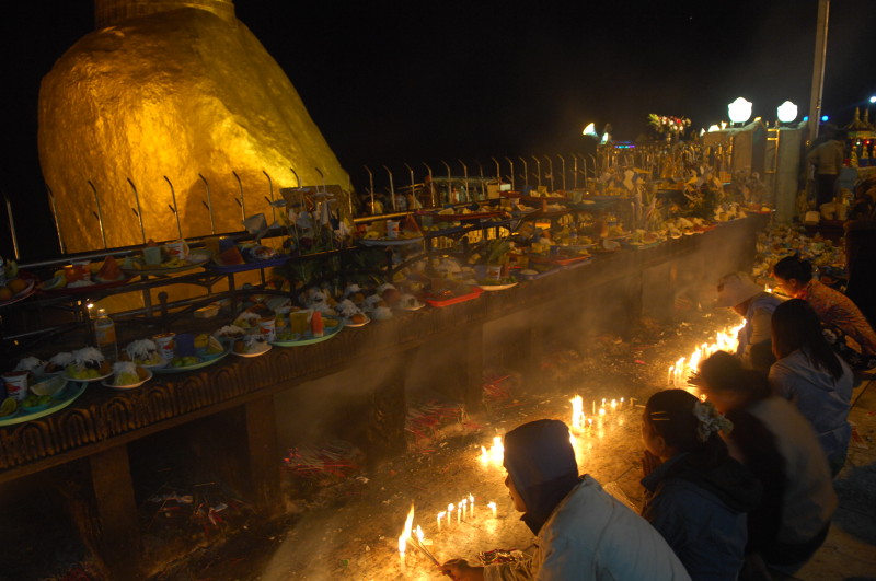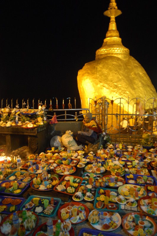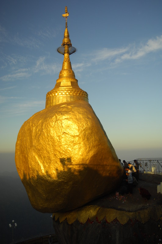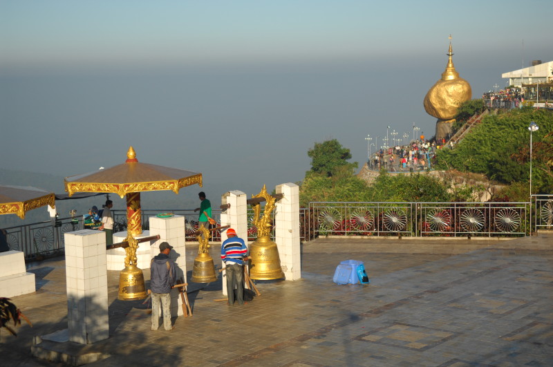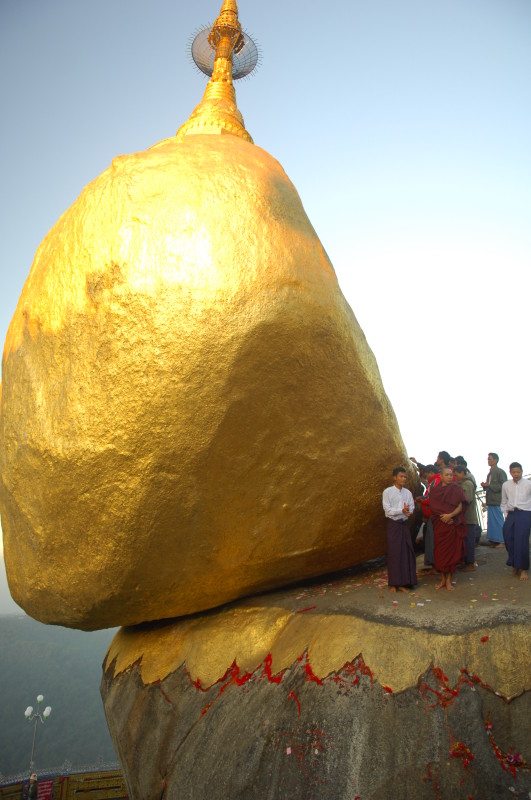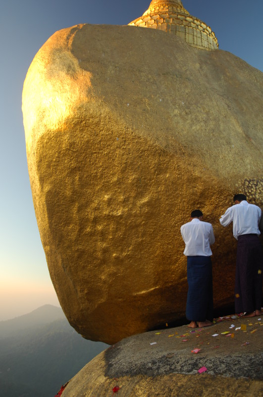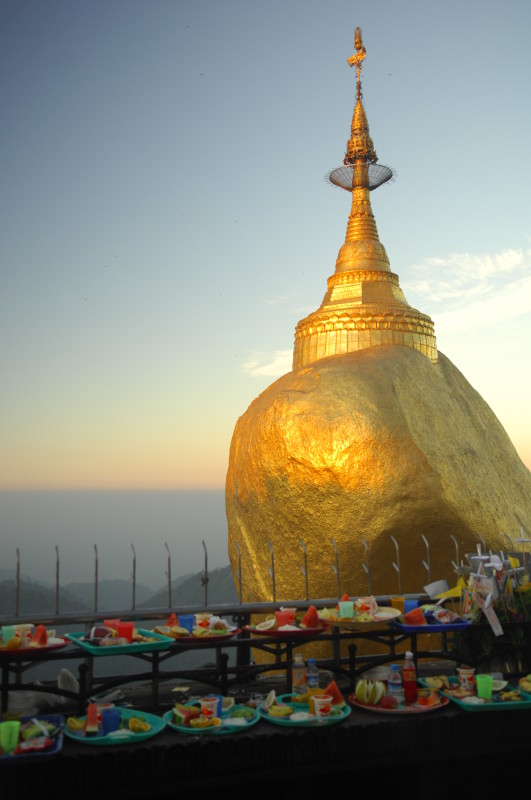Es ist halb sechs auf dem Platz des Heiligtums. Die Nachtlager der Einheimischen sind bereits weggeräumt. Noch immer liest ein Mönch über Lautsprecher verstärkt in melodischem Sprechgesang aus buddhistischen Schriften. An der Balustrade vor der Plattform mit dem goldenen Felsen stapeln sich Tabletts, gefüllt mit Früchten, Reis und Getränken als morgendliche Opfergabe. In der Dämmerung wechselt das Gebet eines einzelnen Mönches mit den Litaneien einer weiß gekleideten thailändischen Pilgergruppe. Als die Sonne aufgeht, dröhnen mächtige Gongschläge über den Platz.