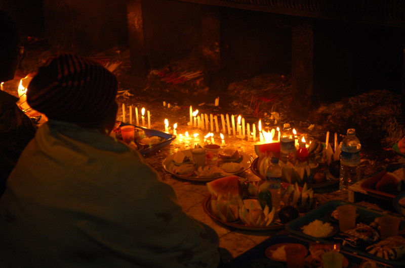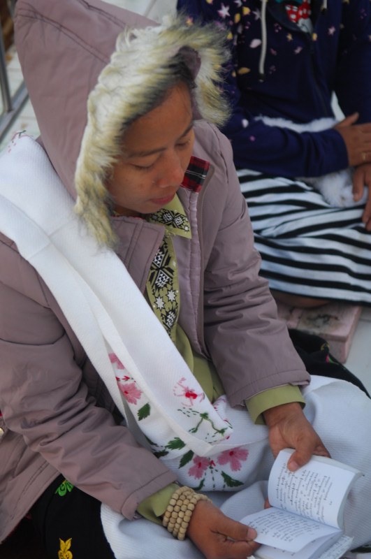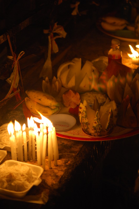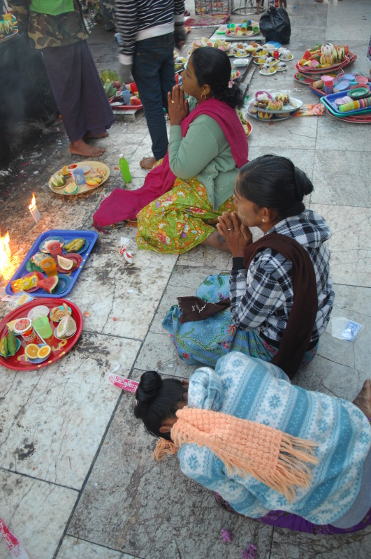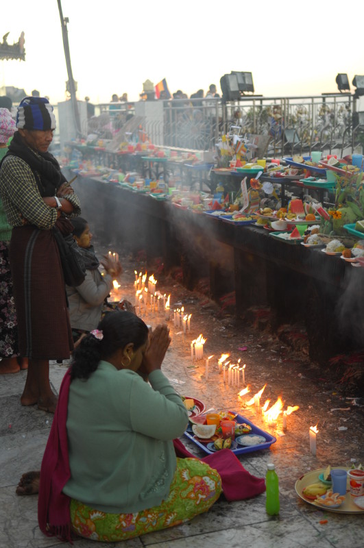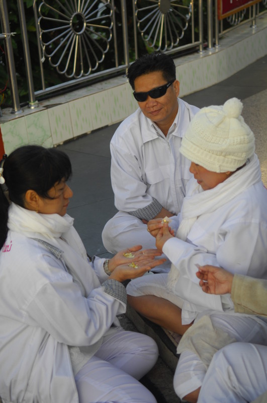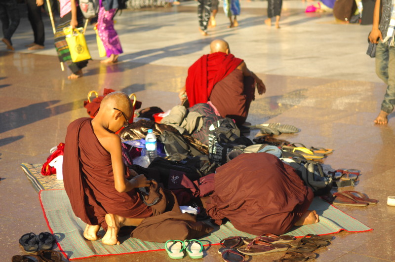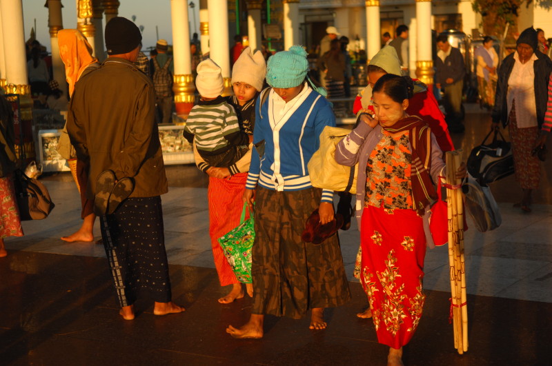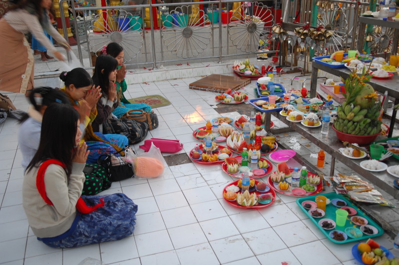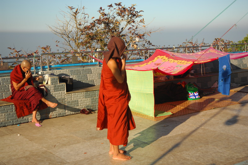 Es ist halb sechs auf dem Platz des Heiligtums. Die Nachtlager der Einheimischen sind bereits weggeräumt. Noch immer liest ein Mönch über Lautsprecher verstärkt in melodischem Sprechgesang aus buddhistischen Schriften. An der Balustrade vor der Plattform mit dem goldenen Felsen stapeln sich Tabletts, gefüllt mit Früchten, Reis und Getränken als morgendliche Opfergabe. In der Dämmerung wechselt das Gebet eines einzelnen Mönches mit den Litaneien einer weiß gekleideten thailändischen Pilgergruppe. Als die Sonne aufgeht, dröhnen mächtige Gongschläge über den Platz.