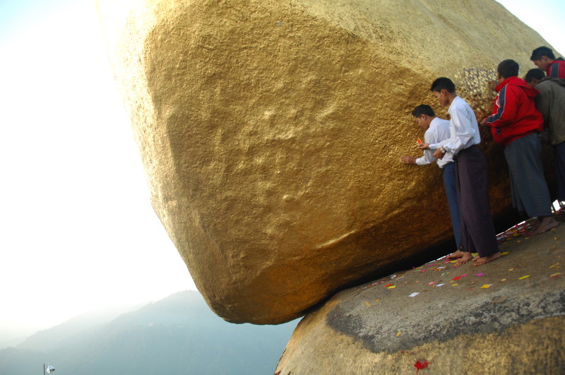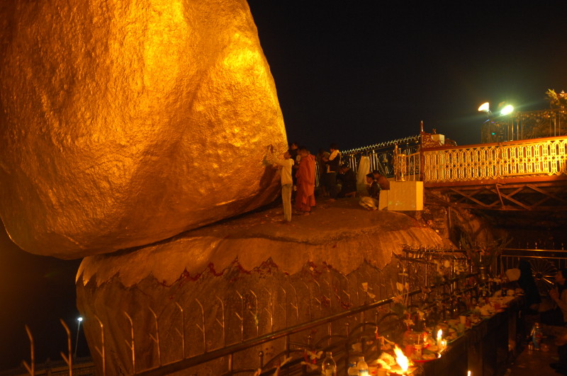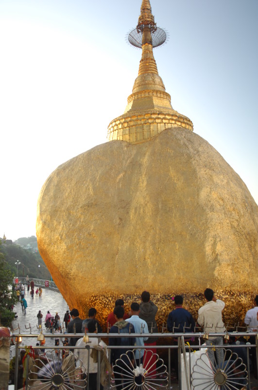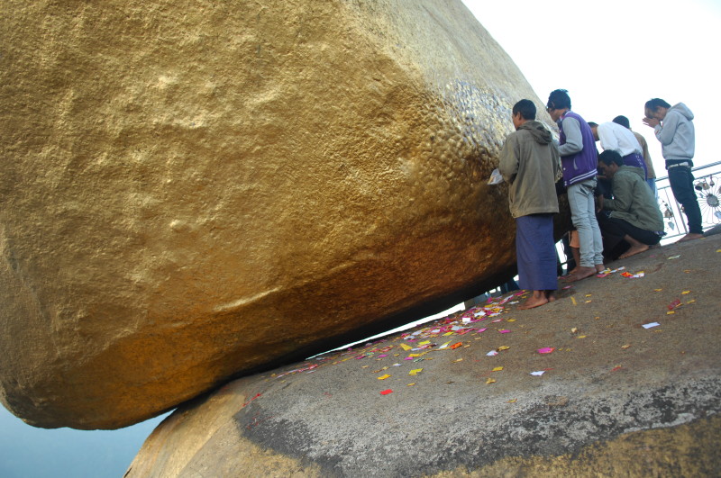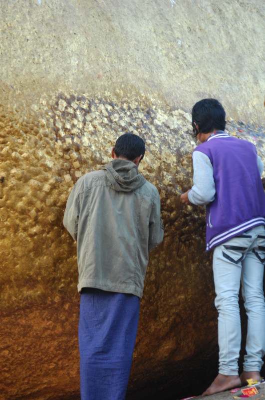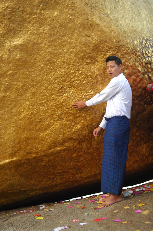 Am goldenen Felsen haben sich erst wenige Pilger eingefunden, um am Ziel ihrer Reise etwas Blattgold zu opfern. Ich kaufe für Cosy und mich bei den gegenüberliegenden Schaltern zwei Briefchen für jeweils etwas mehr als einen Euro. Am Zugang zum Steg zur Plattform mit dem überhängenden Felsen muss ich meine Kamera beim Brückenwächter abgeben. Dann darf auch ich meinen Beitrag an den Felsen kleben.