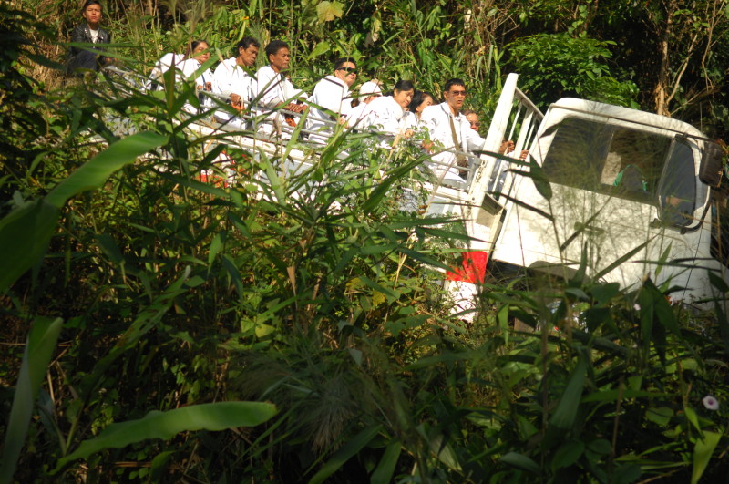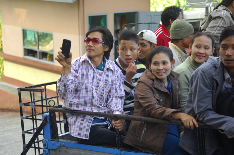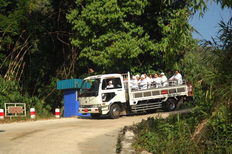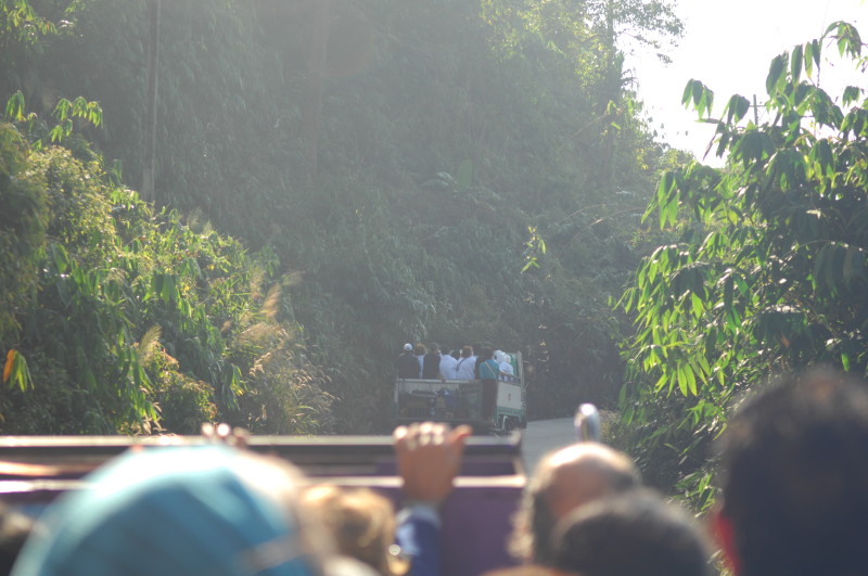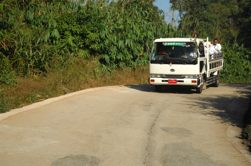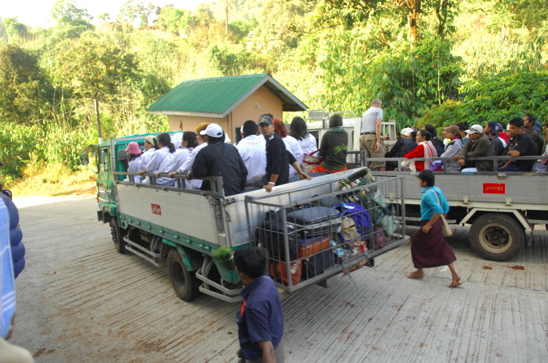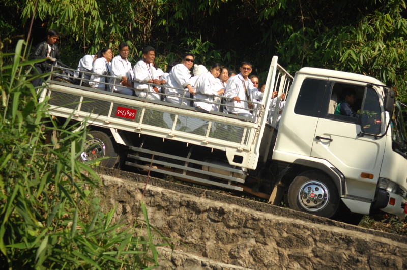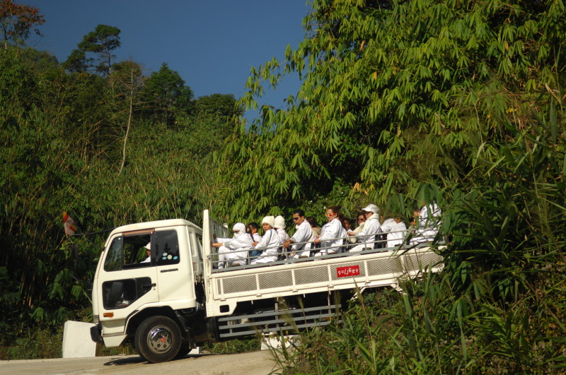 Nach dem Frühstück bringen die zwei Trägerinnen vom Vortag unsere Rucksäcke wieder zum Abfahrtsterminal der Allradtransporter. Sobald alle Bänke mit mindestens sechs Passagieren bestückt sind, startet die Talfahrt. Lediglich die thailändischen Pilger genießen heute eine Sonderstellung und müssen sich nur zu Dritt eine Bank teilen. Von der Basisstation werden wir mit einem Bus in das rund 10 Kilometer entfernte Kyaikto gebracht, von wo es um 12 Uhr mit einem weiteren Bus des Win Express in Richtung Mawlamyine geht. Wo zuletzt noch Gummibaum-Plantagen die Landschaft prägten, bestimmt zunehmend eine üppige tropische Vegetation das Bild. Links von der Strecke wird es immer bergiger, wogegen sich auf der rechten Seite grüne Reisfelder in weiten Ebenen erstrecken. Auf den Kuppen der dicht bewaldeten Hügel blinken immer wieder goldene Stupas.