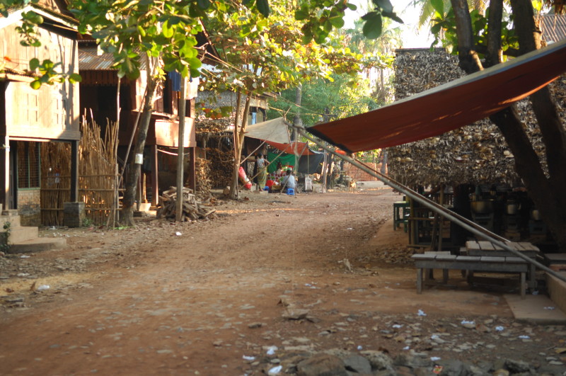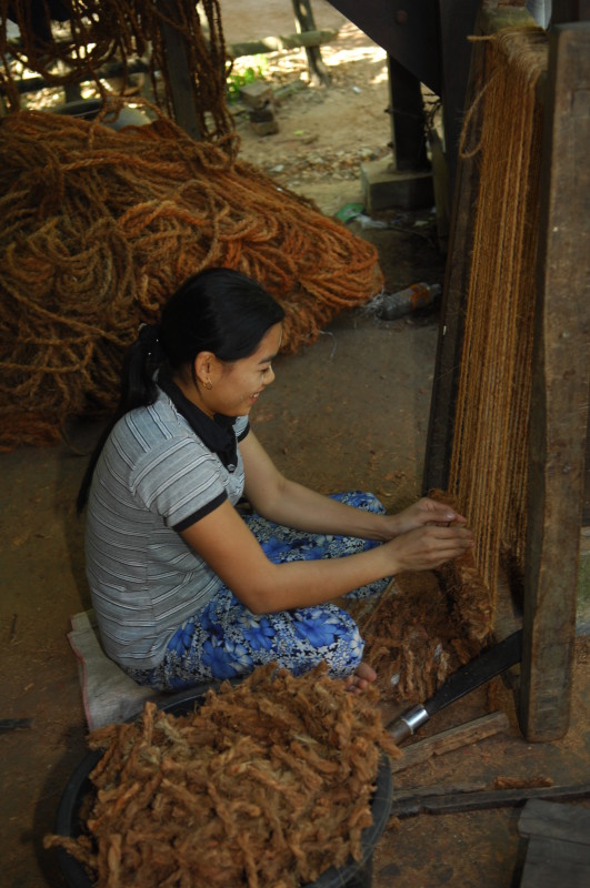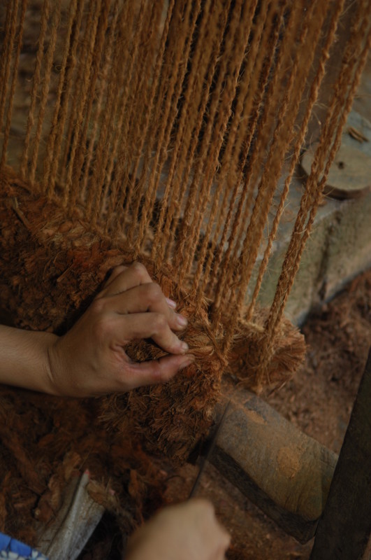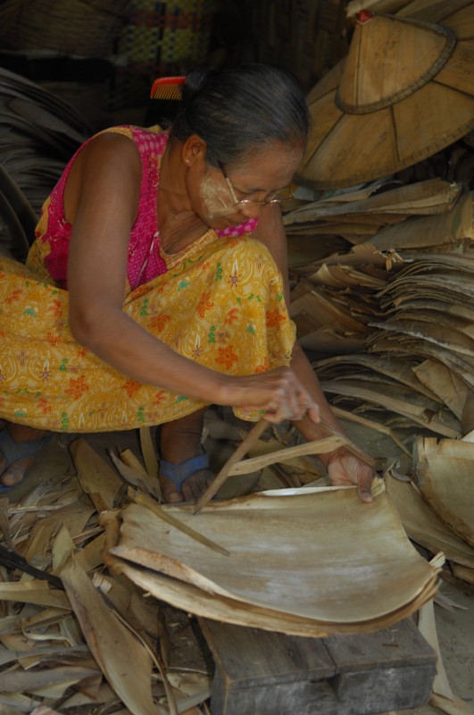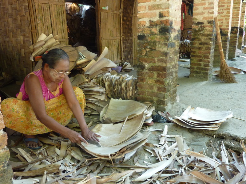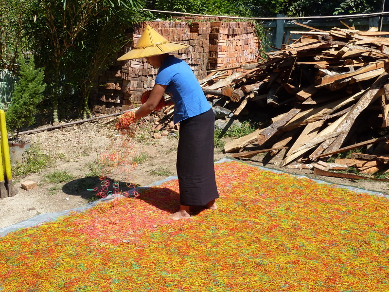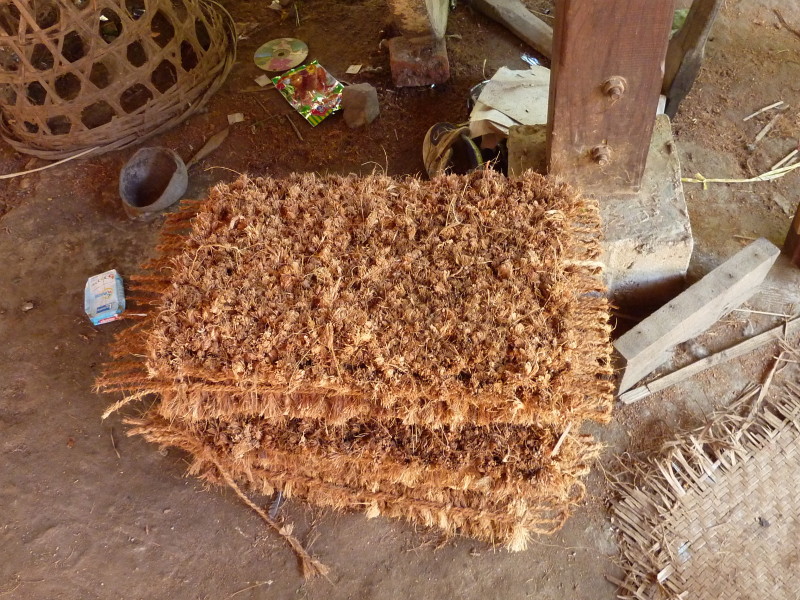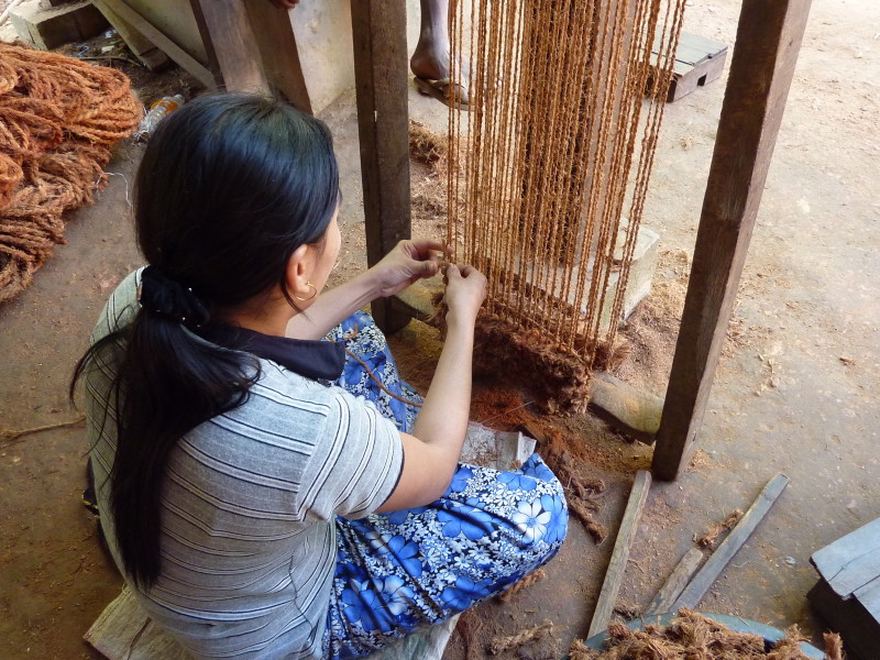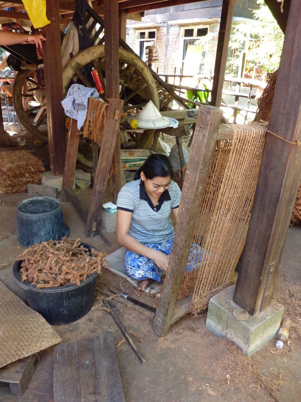 Wir besuchen eine Werkstatt für Fußabtreter aus Kokosfasern. Khin Tha Zar zeigt uns, wie sie die Matten aus Seilstücken in einem Webrahmen anfertigt. Noch lebt sie hier mit ihrem Onkel U Nyut und den Großeltern. Die Eltern arbeiten in Thailand und unterstützen die Angehörigen monatlich mit Geld. Doch die Idylle trügt. Wie uns der Onkel freimütig berichtet, planen Investoren auf dem Areal einen oder mehrere Hotelkomplexe und kaufen bereits großflächig Land auf. Wenn der Preis stimmt, werde er natürlich auch verkaufen. In einem Jahr werde man diese Gegend jedenfalls nicht mehr wiedererkennen. Ihn und seinen Handwerksbetrieb werde es dann in dieser Form nicht mehr geben.
