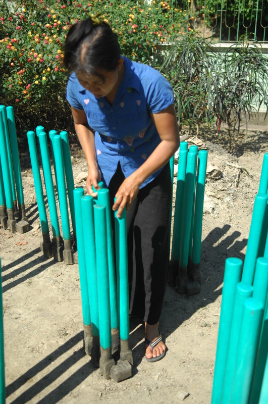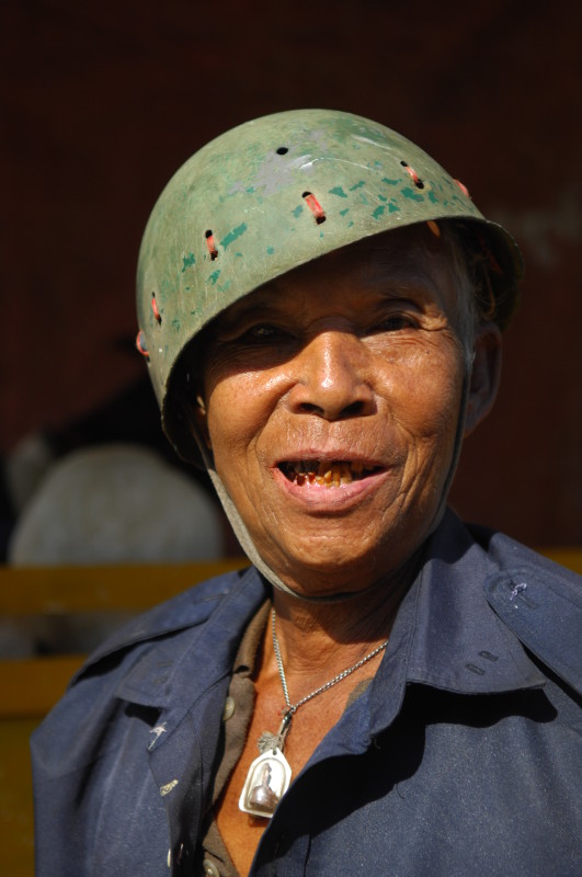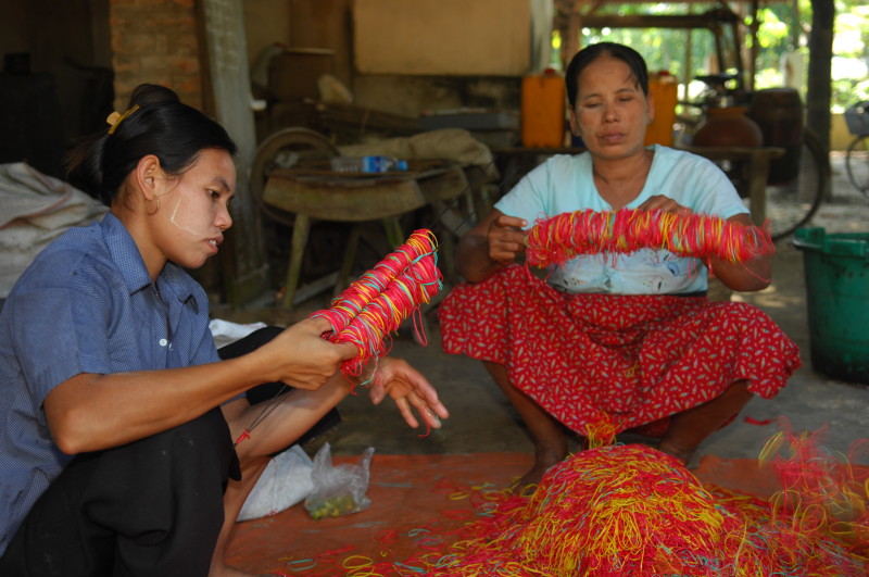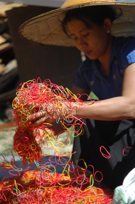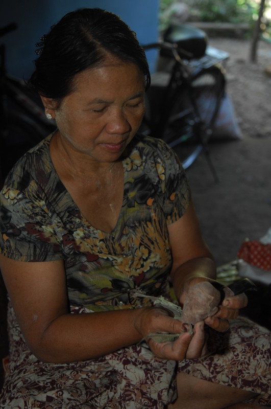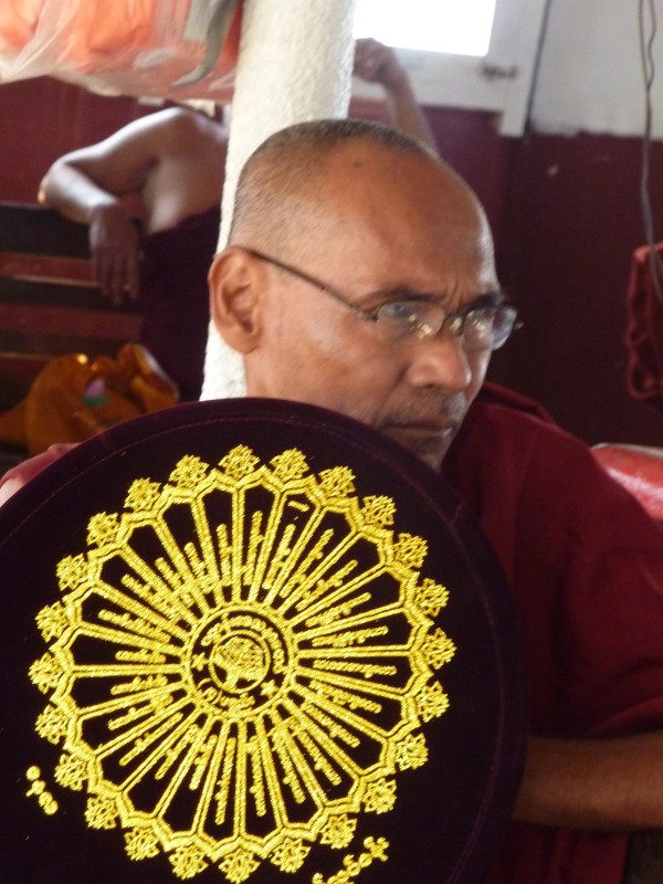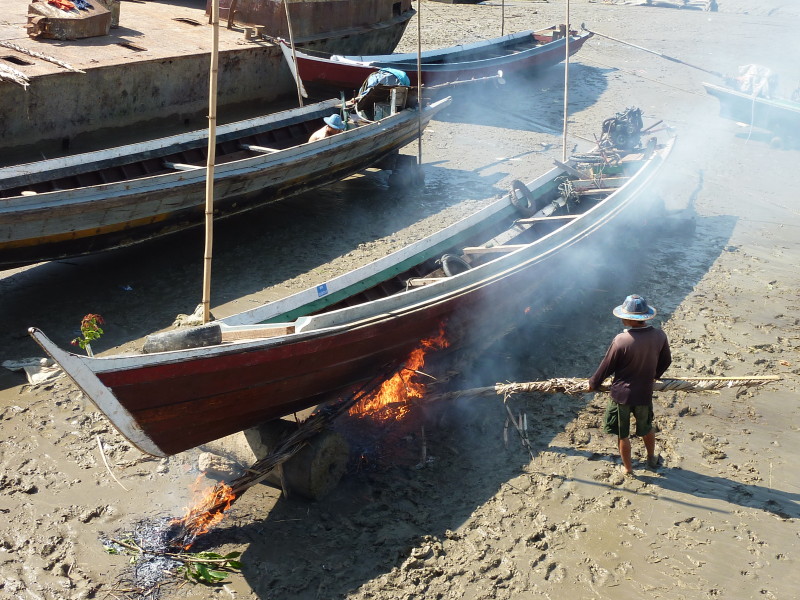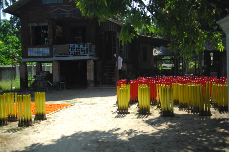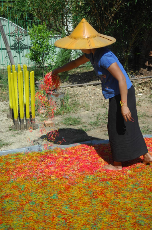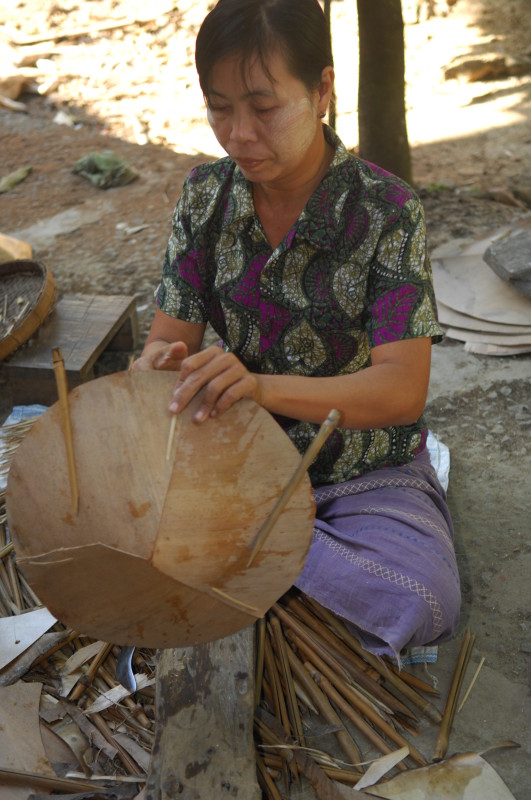Wir besuchen eine Werkstatt für Fußabtreter aus Kokosfasern. Khin Tha Zar zeigt uns, wie sie die Matten aus Seilstücken in einem Webrahmen anfertigt. Noch lebt sie hier mit ihrem Onkel U Nyut und den Großeltern. Die Eltern arbeiten in Thailand und unterstützen die Angehörigen monatlich mit Geld. Doch die Idylle trügt. Wie uns der Onkel freimütig berichtet, planen Investoren auf dem Areal einen oder mehrere Hotelkomplexe und kaufen bereits großflächig Land auf. Wenn der Preis stimmt, werde er natürlich auch verkaufen. In einem Jahr werde man diese Gegend jedenfalls nicht mehr wiedererkennen. Ihn und seinen Handwerksbetrieb werde es dann in dieser Form nicht mehr geben.