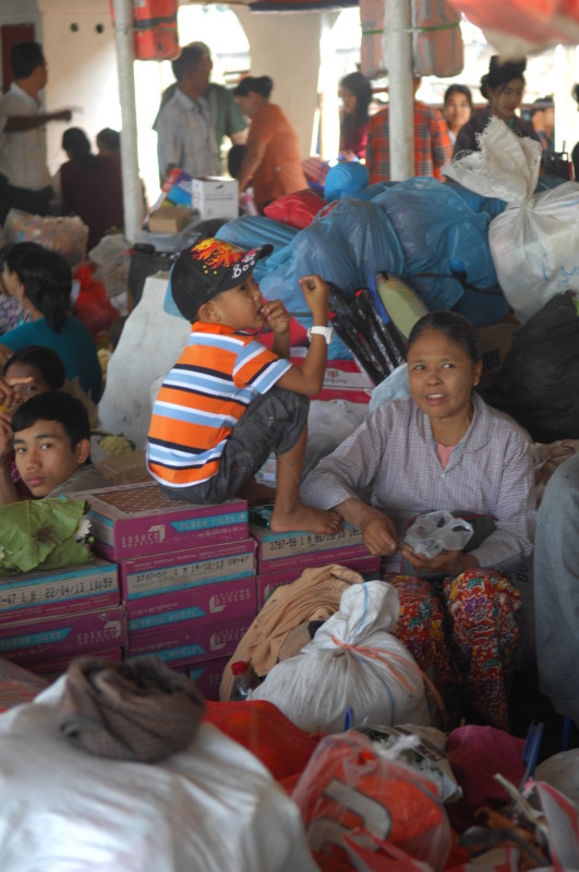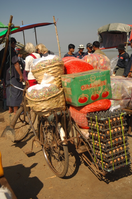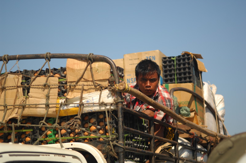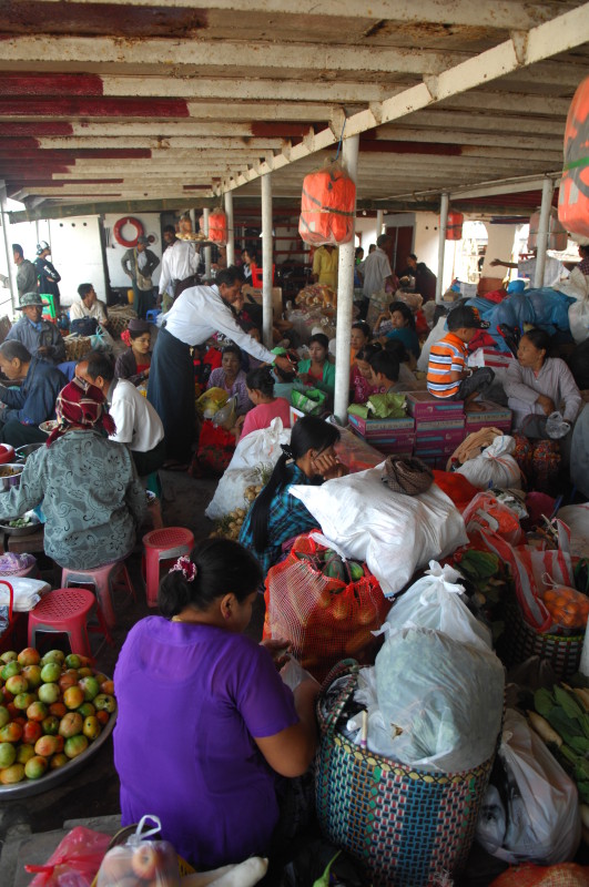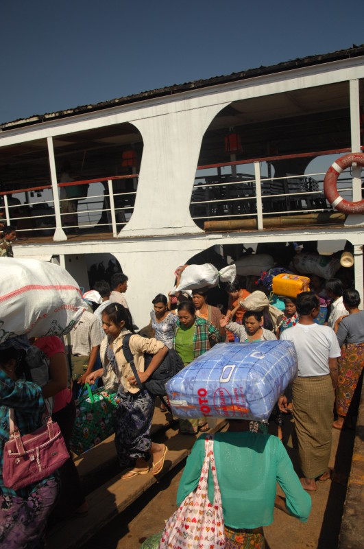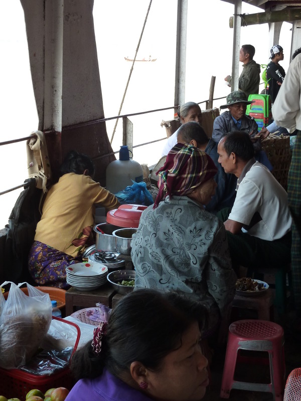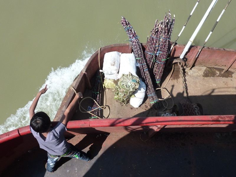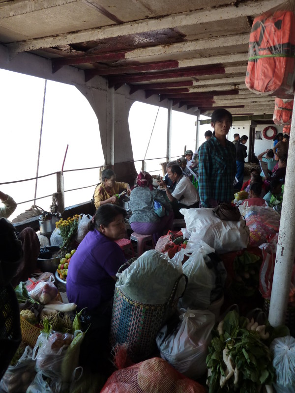 Im Unterdeck auf Wasserhöhe breiten sich die Reisenden mit Sack und Pack auf Bambusmatten aus. Mittendrin wird gekocht, geratscht und die Einkäufe gegenseitig begutachtet. Das Mitteldeck ist schon bequemer und verfügt über einfache Holzbänke. Wir klopfen vorsichtig an die Tür zum Oberdeck. Der Kapitän ist ein Freund unseres Guides. Nachdem wir unsere Schuhe ausgezogen haben, dürfen wir sein „Wohnzimmer“ betreten.