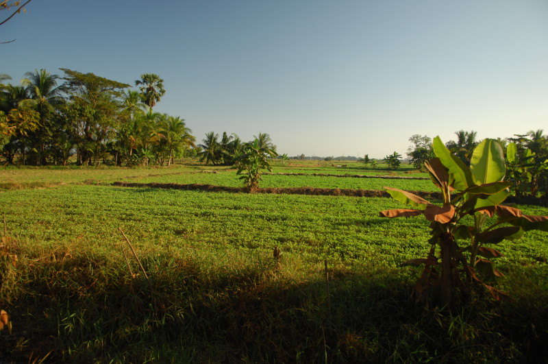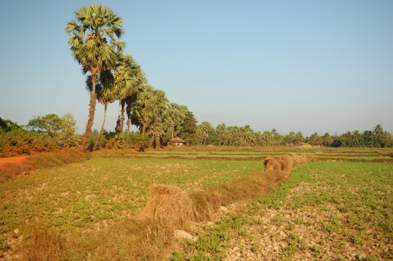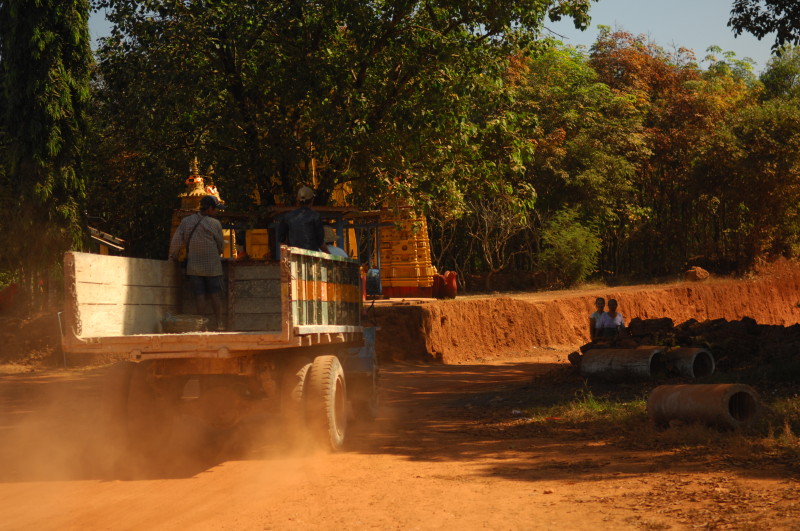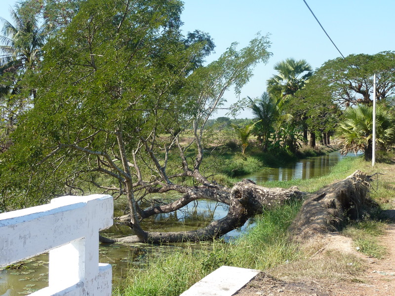 Auf dem Weg zum nördlichen Jetty fahren wir durch weite Reisfelder, die gerade geerntet werden. Auf der ungeteerten Straße staubt die rote Erde gewaltig. Das wird sich bis zum Ende des Jahres noch ändern. Die Trasse wurde erst im letzten Jahr verbreitert und frisch aufgeschüttet. Jetzt werden die breiteren Brücken über Kanäle und Bäche gebaut. Bis zum Jahresende folgt dann die Teerauflage.