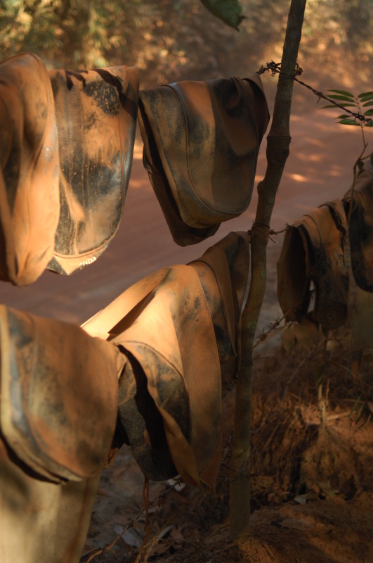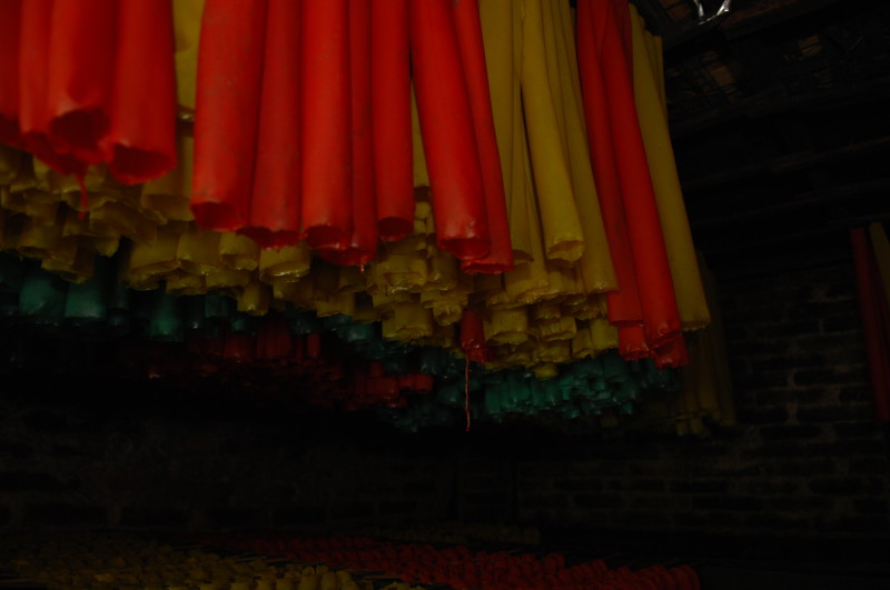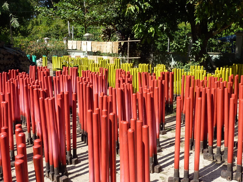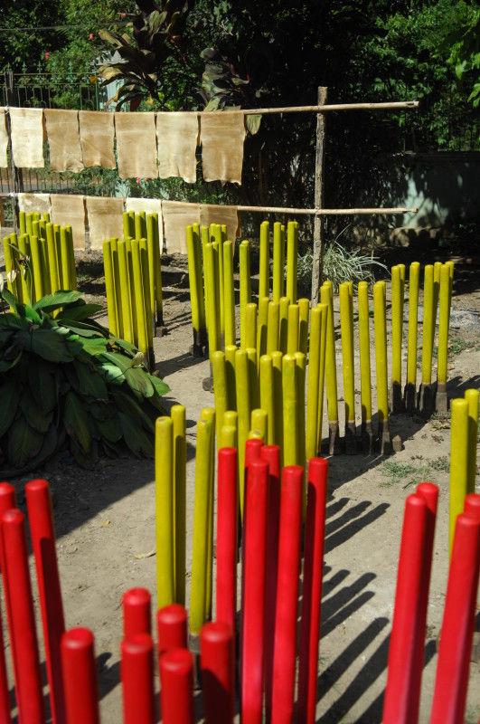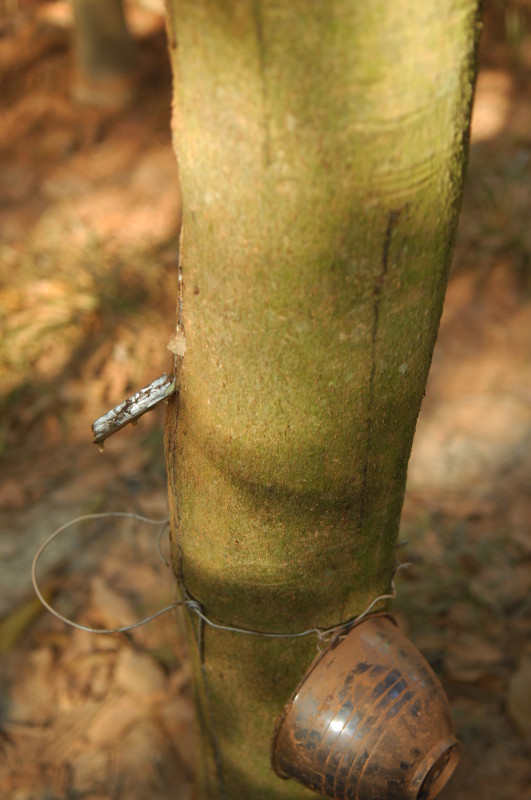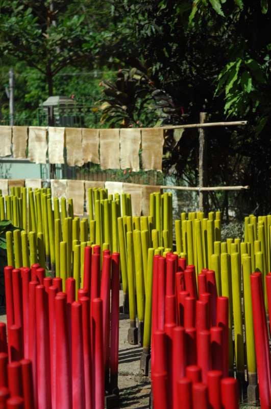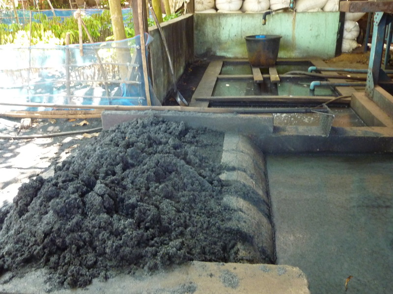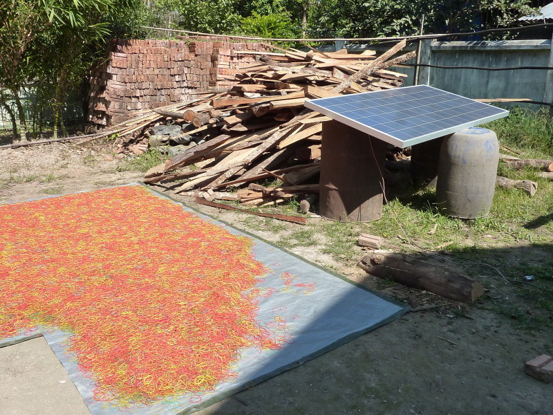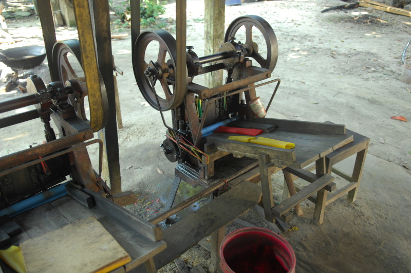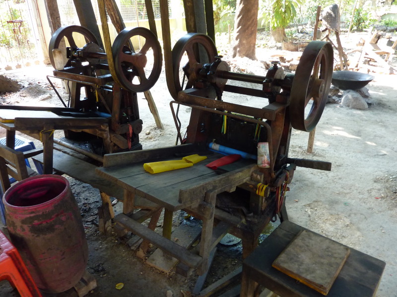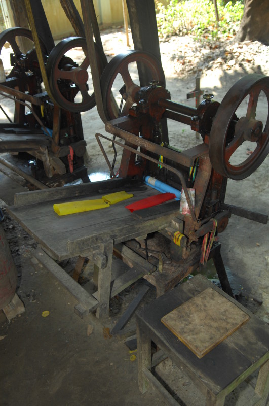 Im Dorf Yua-Lat besuchen wir einen Hersteller von Gummibändern. Kautschukplantagen gibt es zahlreich auf dem Eiland. Da liegt es nahe, einen Teil der Weiterverarbeitung direkt vor Ort anzusiedeln. In den aufbereiteten, gefärbten und verflüssigten Kautschuk werden Holzpflöcke getaucht und zum Trocknen in die Sonne gestellt. Dieser Vorgang wiederholt sich dreimal, bis die „Verhüterlis“ abgezogen und in einer Art Räucherkammer getrocknet werden. Dann können die Schläuche in dünne Ringe geschnitten werden, die dann von Hand vereinzelt werden müssen, da sie häufig zusammenkleben. Es folgt ein letzter Trockendurchgang in der Sonne. Fertig sind die echten Gummiringe.