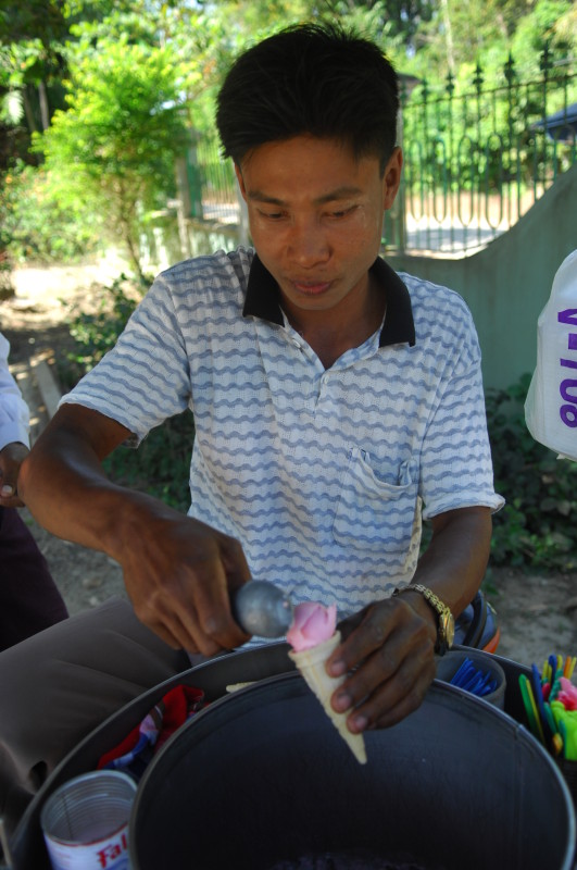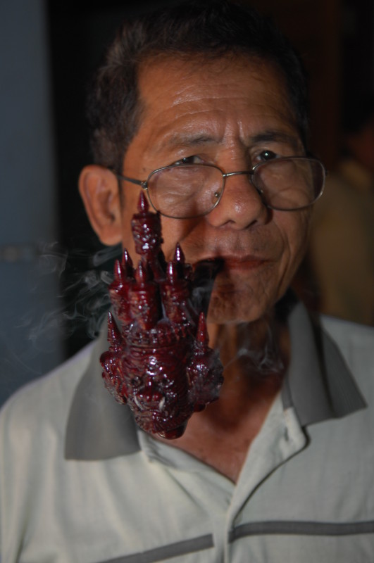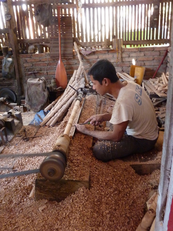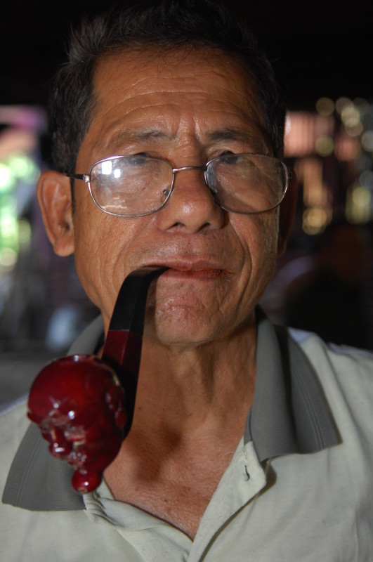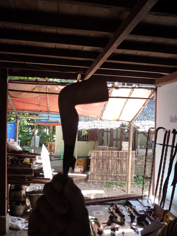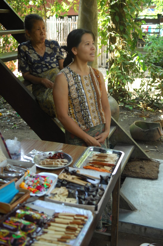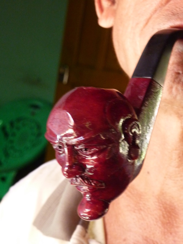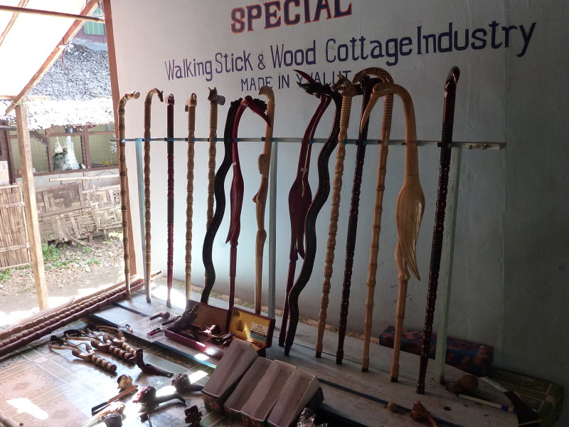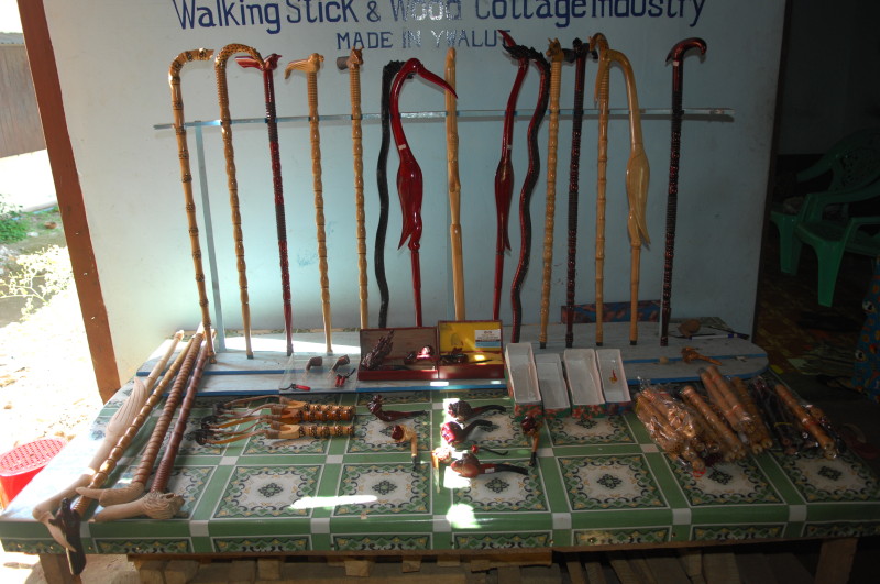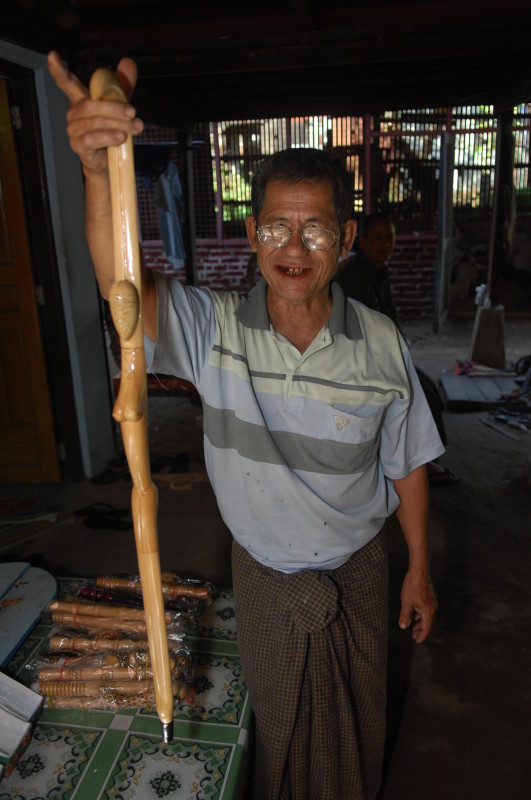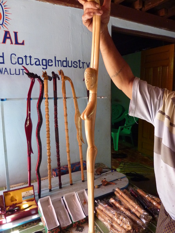 Im Viertel Theinpine des Dorfes Ywalut haben sich mehrere Holzschnitzer angesiedelt. Ein besonderer ist U Mann Ngwe Wynn, der Pfeifen und Spazierstöcke herstellt. Neben Pfeifen mit Pagoden- und Tierköpfen hat er auch welche mit Lenin- und Obamakopf im Sortiment. Stolz zeigt er uns eine kleine Büste des russischen Revolutionärs, die als Vorbild diente. Den amerikanischen Präsidenten hat er wohl einem Foto nachempfunden. Auch die Spazierstöcke haben keine simplen Griffe. Sie sind wie Tiere, Vögel oder Schlangen geformt. Ein besonderer Clou ist ein Exemplar in Form eines nackten, langgestreckten Frauenkörpers.