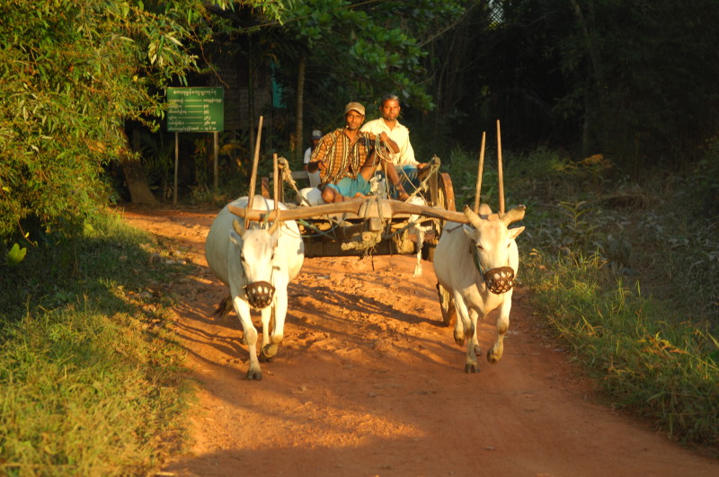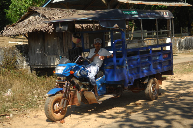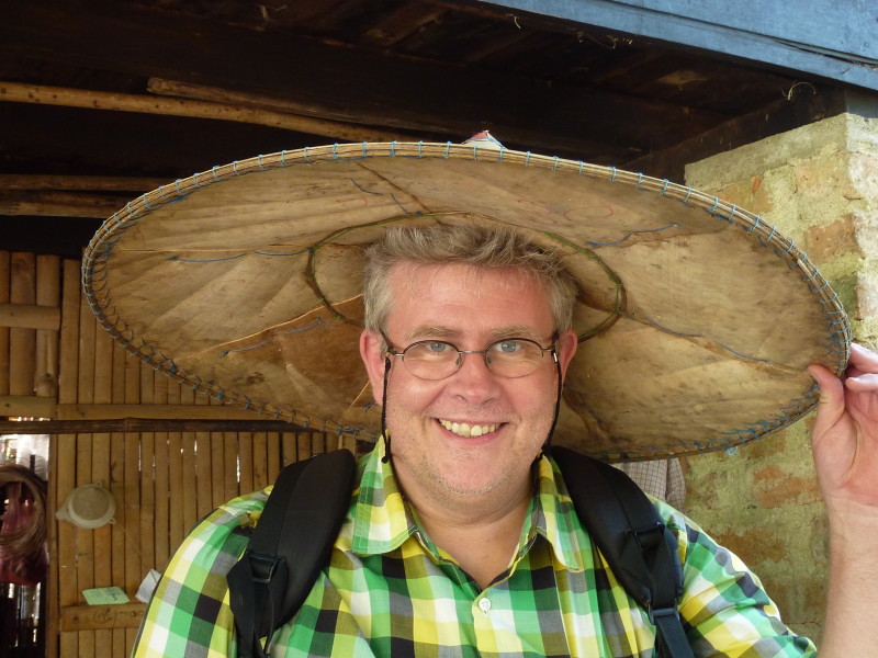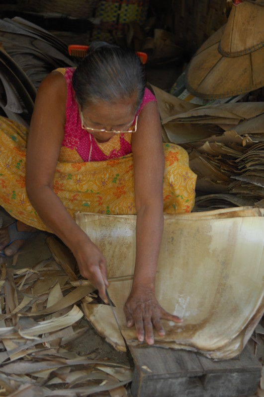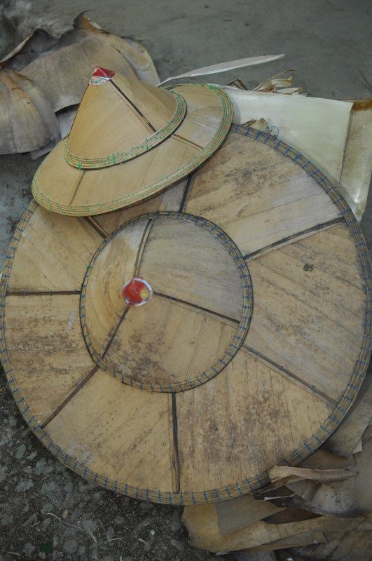Nach dem Mittagessen in einem kleinen Restaurant mit handgeschriebener Speisekarte fahren wir in das Dorf Nhee Mhout. Dort besichtigen wir eine Werkstatt für Bambushüte. Die Kopfbedeckungen werden mit einfachen Werkzeugen aus dem Naturstoff geschnitten.