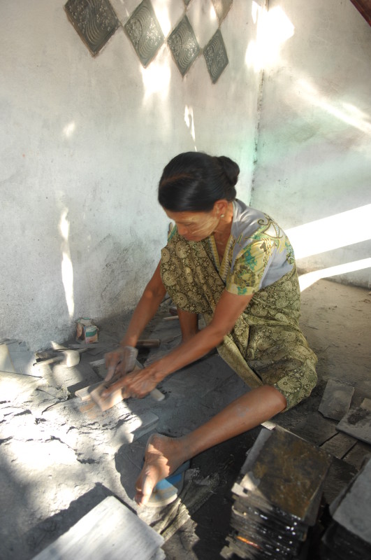 Im Nachbardorf Kama-Mha wartet ein ganz besonderer Handwerker auf uns. Der landesweit einzige Hersteller von Schiefertafeln fertigt das Schulutensil samt Steingriffel noch genauso wie seit hunderten Jahren. Noch heute lernen viele Kinder in Burma das Schreiben mit Hilfe dieses klassischen Tablets.