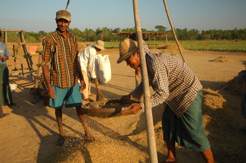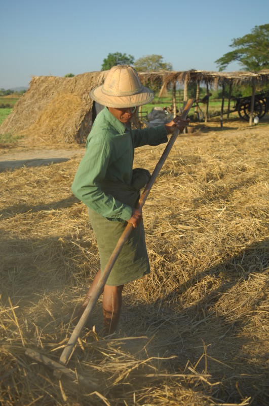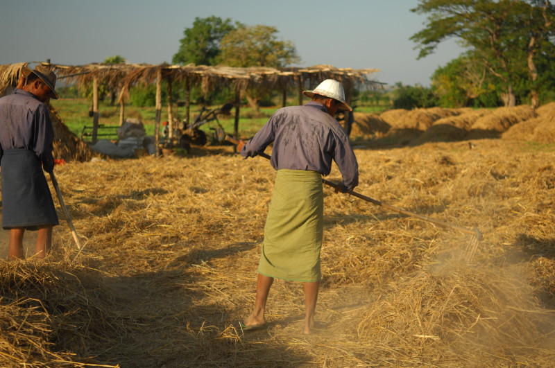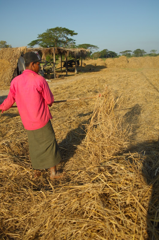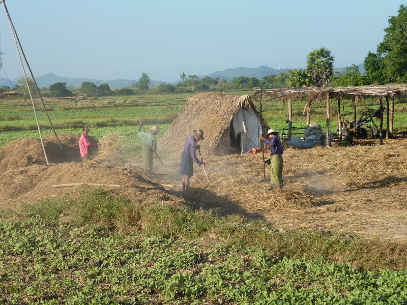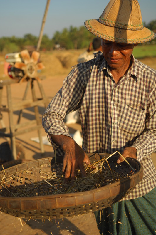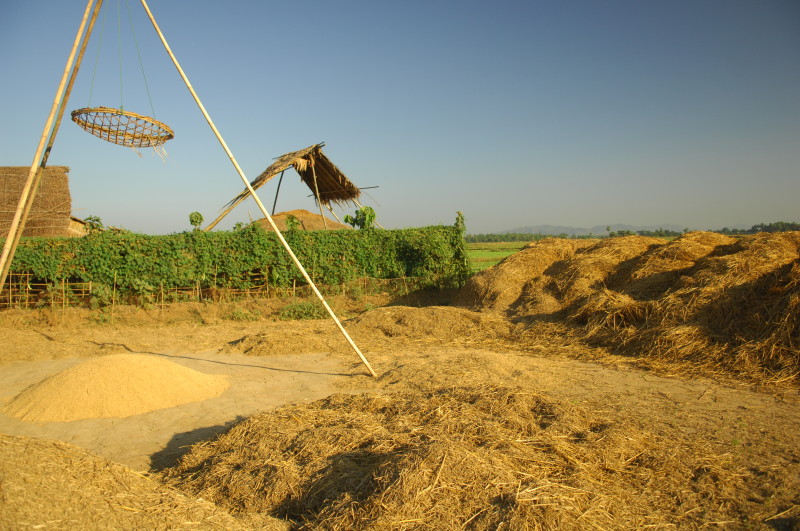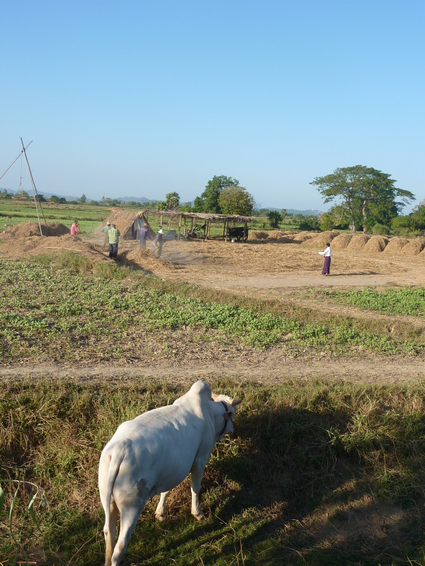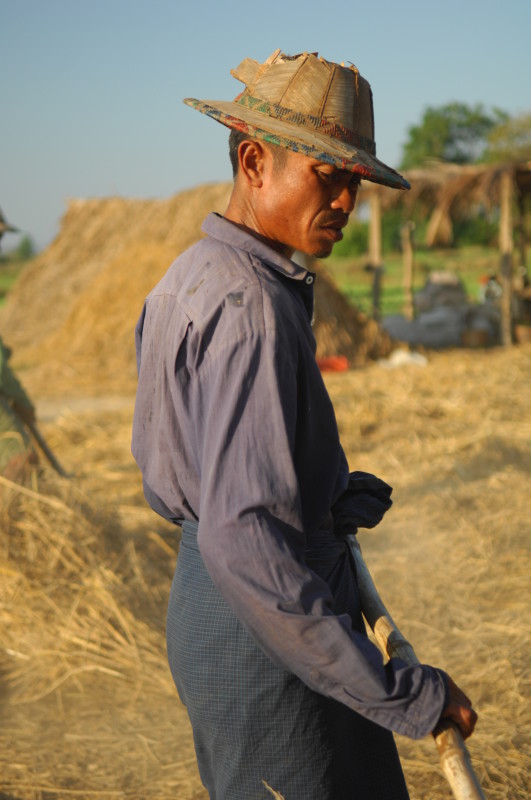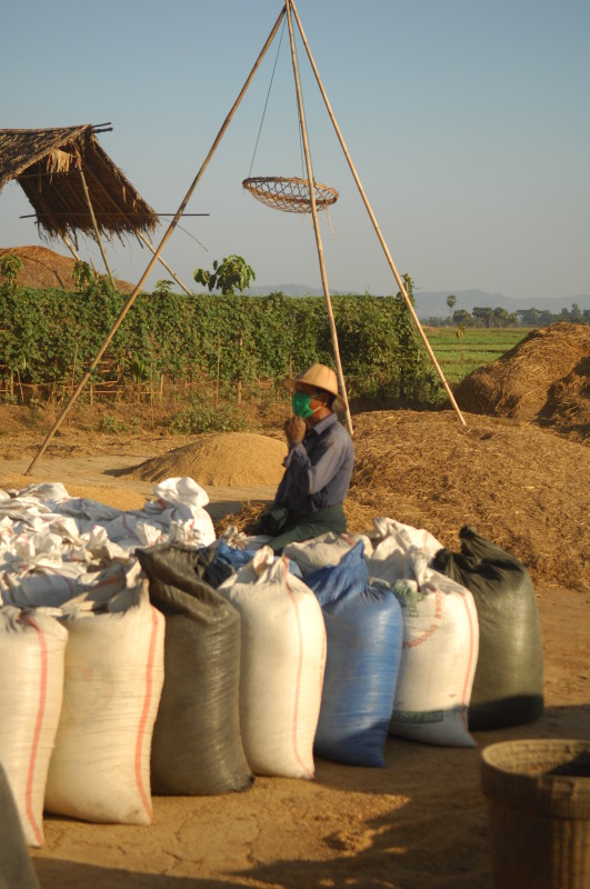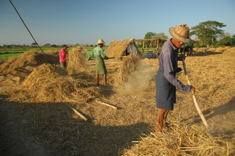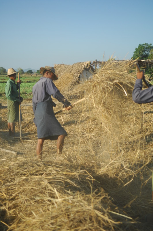 Wir nötigen den Fahrer unseres Tuktuks mehrfach zum Halten, da sich auf der Fahrt durch die Reisfelder in der Abendsonne immer neue Fotomotive ergeben. Bei jedem Stopp erläutert unser Guide ausführlich die einzelnen Schritte der Reisernte und erklärt den Bauern, woher wir kommen und wo in Burma wir schon waren. Im Gegenzug übersetzt er uns ihre Reaktionen. Sie freuen sich sehr über das Interesse der Langnasen an ihrer Arbeit.