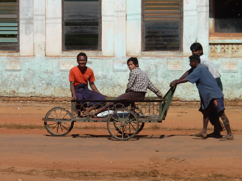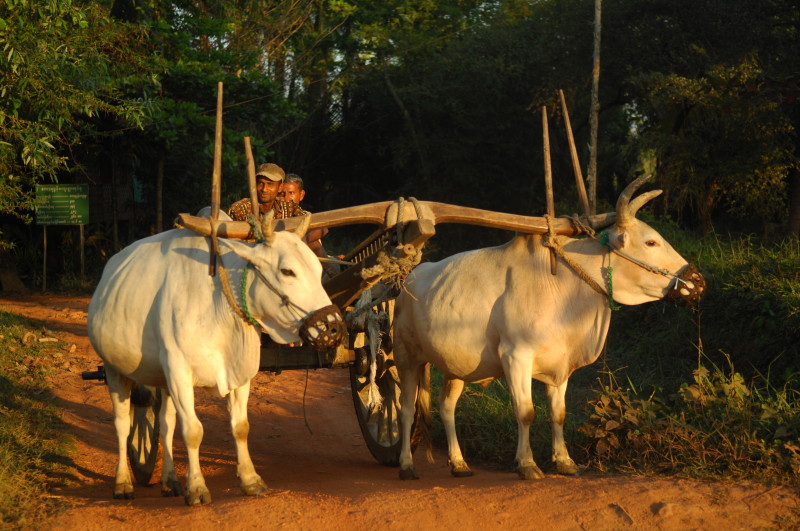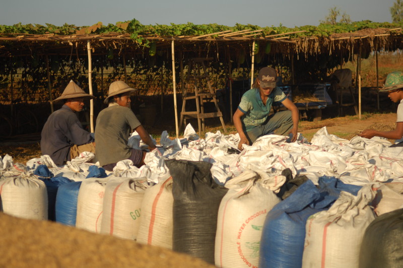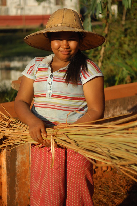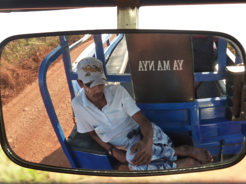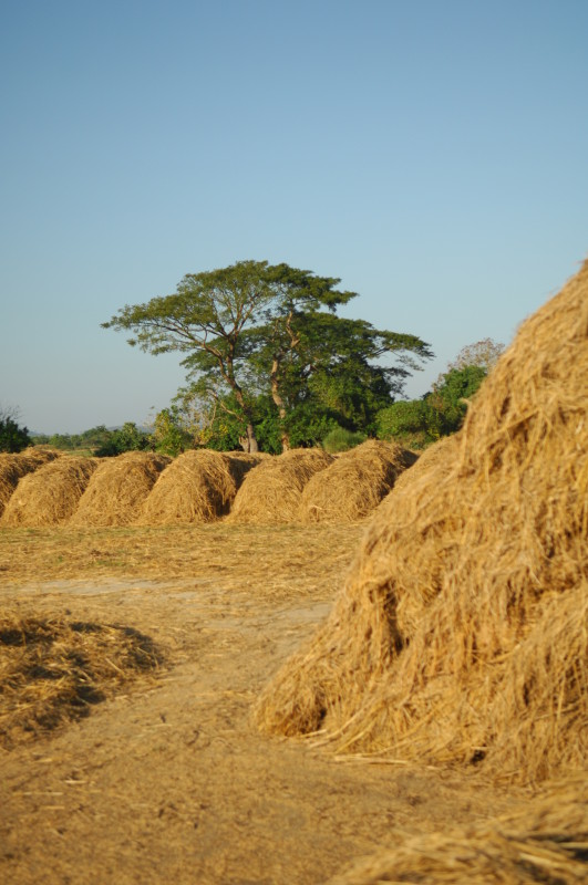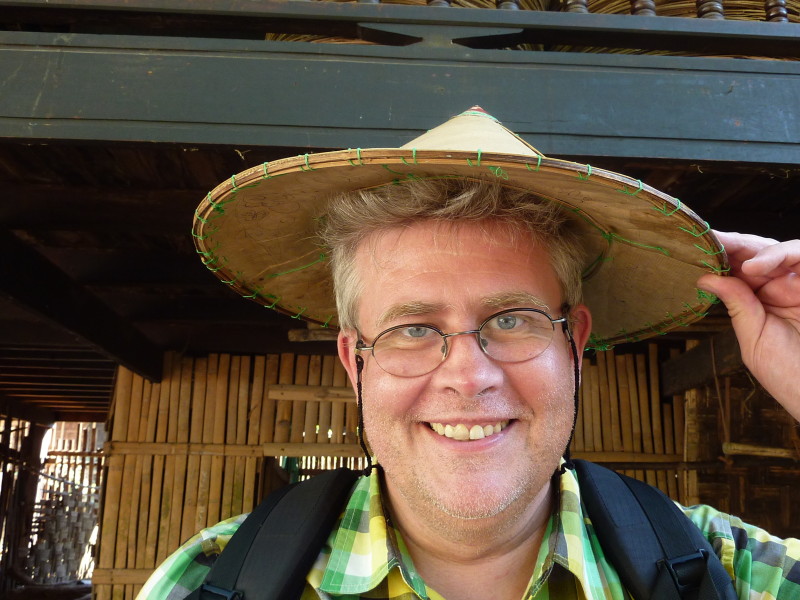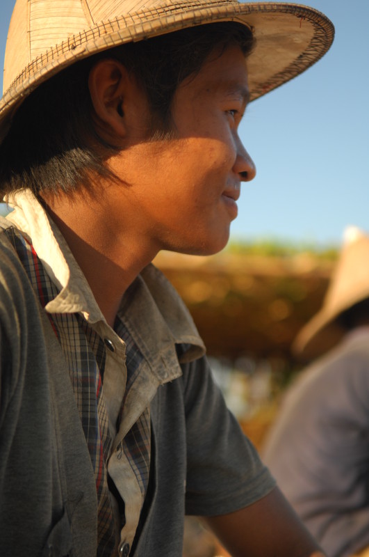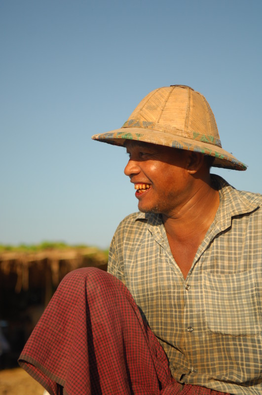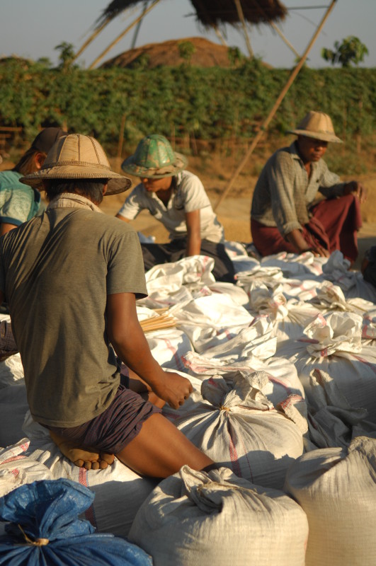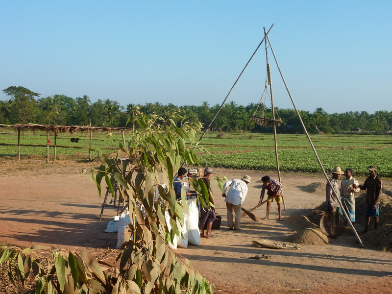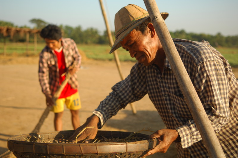 Wir nötigen den Fahrer unseres Tuktuks mehrfach zum Halten, da sich auf der Fahrt durch die Reisfelder in der Abendsonne immer neue Fotomotive ergeben. Bei jedem Stopp erläutert unser Guide ausführlich die einzelnen Schritte der Reisernte und erklärt den Bauern, woher wir kommen und wo in Burma wir schon waren. Im Gegenzug übersetzt er uns ihre Reaktionen. Sie freuen sich sehr über das Interesse der Langnasen an ihrer Arbeit.