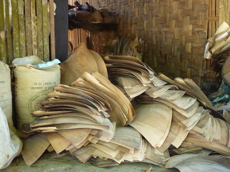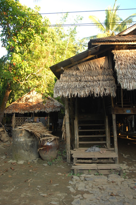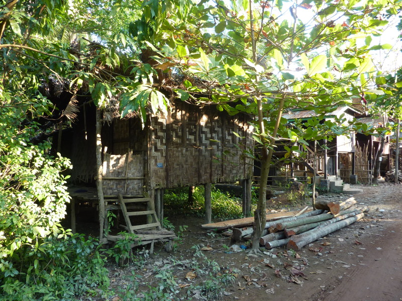 Im pittoresken Dorf Kaw Mu Poen halten wir ein letztes Mal. Keines der Häuser und Hütten auf Stelzen gleicht dem anderen. Sie scheinen in eine große Plantage aus Palmen und Bananenstauden eingebettet zu sein. Alles sieht sehr gepflegt aus. Fremde tauchen hier offensichtlich selten auf. So sind wir bald umringt von Kindern, die ihre Englischkenntnisse demonstrieren wollen und uns nach Herkunft, Namen und Länge des Aufenthalts in ihrem Land befragen. Eine ältere Frau erklärt, dass die Blätter der Palmen für die Dächer der Hütten gebraucht werden. Außerdem wird aus dem männlichen Kolben der Zuckerpalmen der Saft für den Palmwein gewonnen.