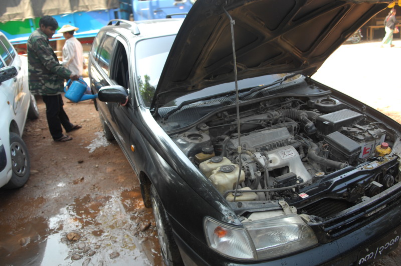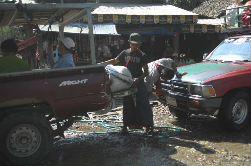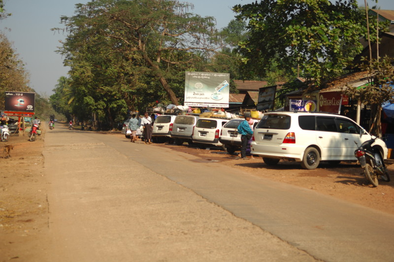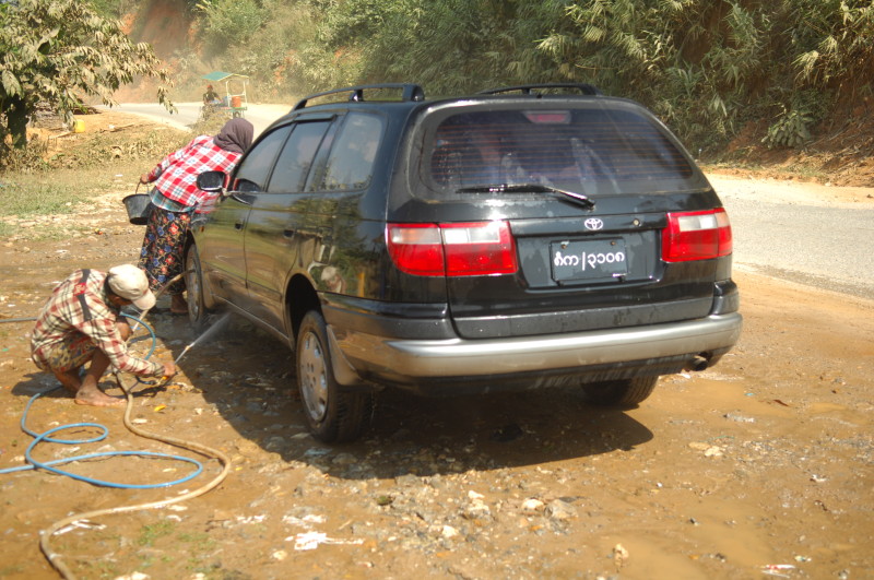 Nach einer Viertelstunde und der Bezahlung von 500 Kyat (0,50 US$) machen wir uns mit dem jetzt wieder blitzsauberen Auto auf den Rest der Strecke, die jetzt auch wieder asphaltiert ist. Die letzten Kilometer gleichen fast schon einem mehrspurigen Highway. Kurz vor 14 Uhr werden wir an der Zollstation in Myawaddy abgeliefert.