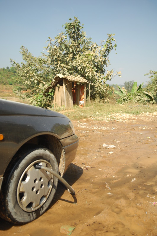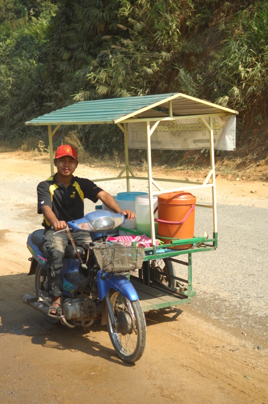 Von der Grenze aus landeinwärts sind im Moment nur ein paar Mopeds und zwei Eisverkäufer mit ihren beiwagenbestückten Motorrädern unterwegs. Sie fädeln sich in zum Teil haarsträubenden Manövern an uns und einigen mit Ausbesserungsarbeiten beschäftigten Straßenarbeitern vorbei. Der Zustand der Straße wechselt ständig zwischen zumindest einspurig asphaltiert bis haarsträubender Schotterpiste.