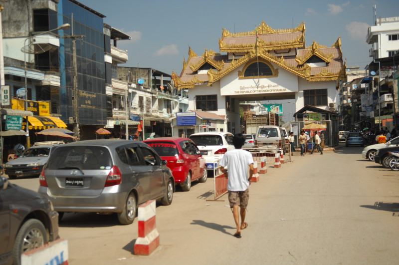 Für Ausländer gibt es einen eigenen Abfertigungsschalter. Wir werden in ein Zimmer gegeben und aufgefordert die Rücksäcke abzusetzen. Eine Kontrolle des Gepäcks findet aber nicht statt. Im Nebenzimmer erledigen drei weiß uniformierte Beamten die eigentlichen Formalitäten. Wie schon bei der Einreise am Flughafen von Mandalay sind die großen Bücher von vor zwei Jahren durch Computer ersetzt worden. Das Prozedere inklusive Foto mit der grenztypischen Logitech-Webcam unterscheidet sich nicht von dem an anderen internationalen Grenzen. Außer vielleicht mit dem Unterschied, dass man mit den Beamten hinter dem Schreibtisch sitzt und ihnen bei der Arbeit am Monitor zuschauen kann. Das geht alles recht fix, da wir die einzigen Ausreisewilligen um diese Zeit sind.