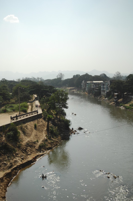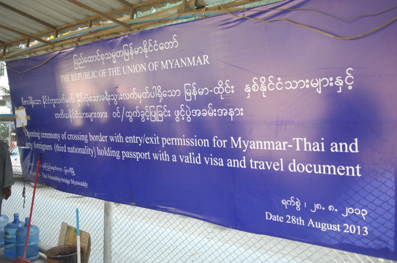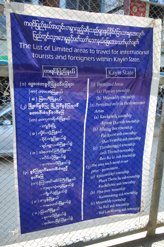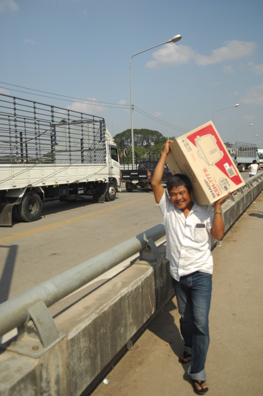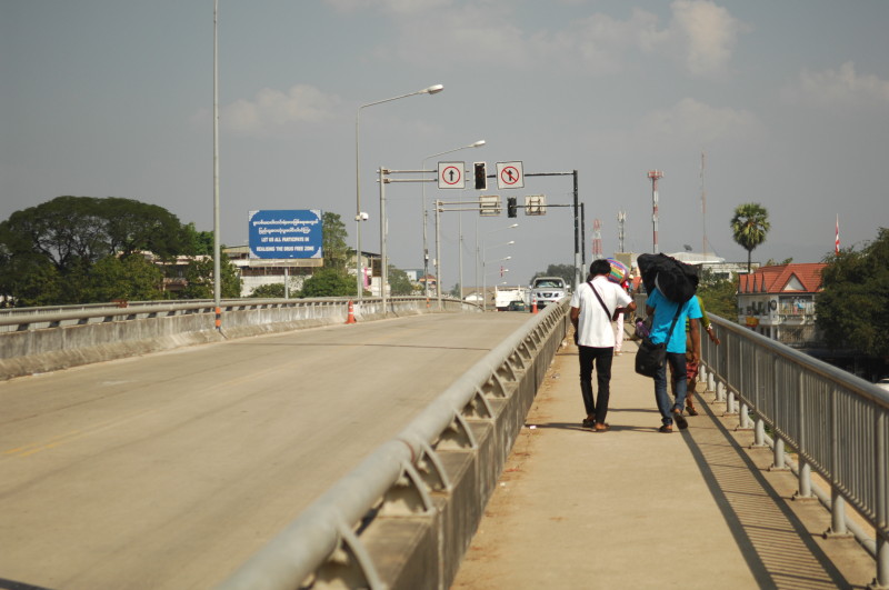 Einige Meter weiter finden wir auf einem Plakat die Erklärung für die beiden Kontrollstationen im Grenzgebiet. Wir haben zwei Bereiche passiert, die zu den Gegenden gehören, die nach wie vor nur mit Sondergenehmigung besucht werden dürfen. Ohne uns weiter aufzuhalten gehen wir zu Fuß über die Friendship Bridge. Die Brücke über den Taungyin Fluss verbindet Myawaddy mit der am östlichen Ufer gelegenen thailändischen Stadt Mae Sot. Nach zehn schweißtreibenden Minuten sind wir am Grenzposten auf der anderen Seite. Auch dort ist die Wartezeit nur kurz, da es hier für Ausländer ebenfalls einen speziellen Schalter gibt. Die Schlange für den kleinen Grenzverkehr ist deutlich länger.
