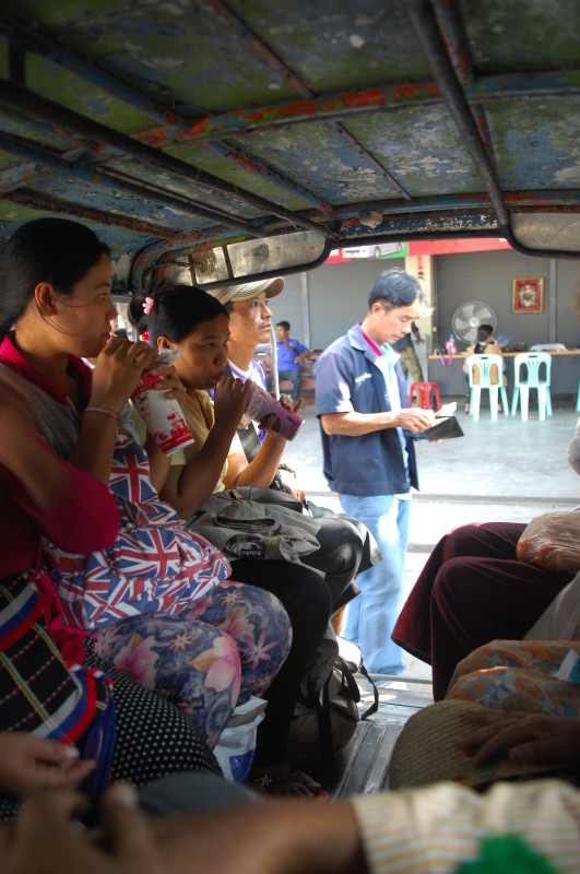 Auf Nachfrage, wie viele Ausländer seit der hiesigen Grenzöffnung am 28. August 2013 die Möglichkeit zum Übertritt nach Thailand genutzt haben, erklärt man uns, etwa 3.000 seien es wohl bislang gewesen. Allerdings zählen dazu auch Thailänder im kleinen Grenzverkehr. Kein Wunder also, dass wir unterwegs als Rarität bestaunt wurden. Auf die erstaunte Feststellung, dass in unseren Pässen bereits zwei Visa für Myanmar sind, bekunden wir unsere Begeisterung für dieses Land und zeigen stolz unsere gewonnene Myanmar-Bier-Jacke. Das sorgt zusätzlich für Wirbel. Da wir zum Schluss nicht mehr genug Kronkorken für ein T-Shirt ertrinken konnten, verschenken wir zur Freude aller kurzerhand den Rest unserer Deckelsammlung.