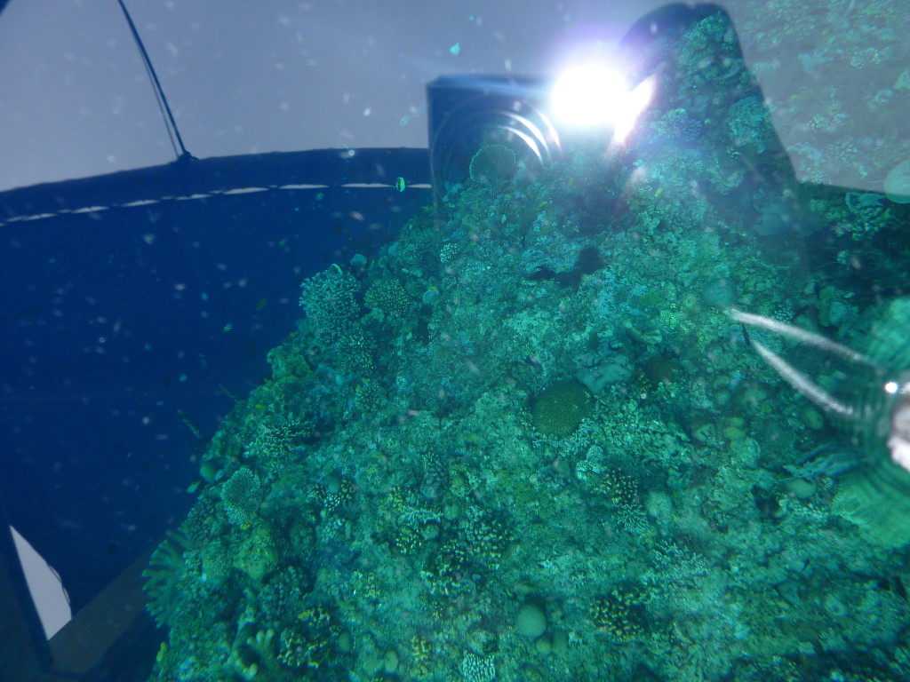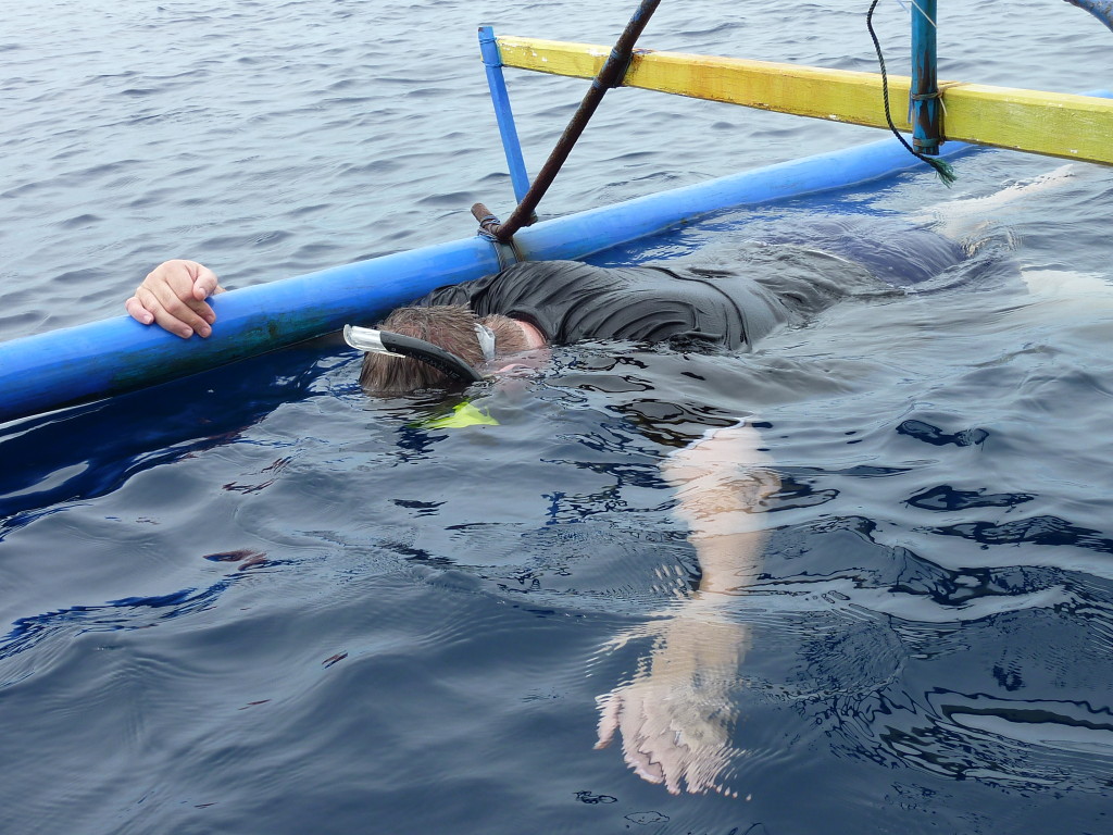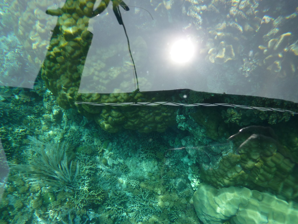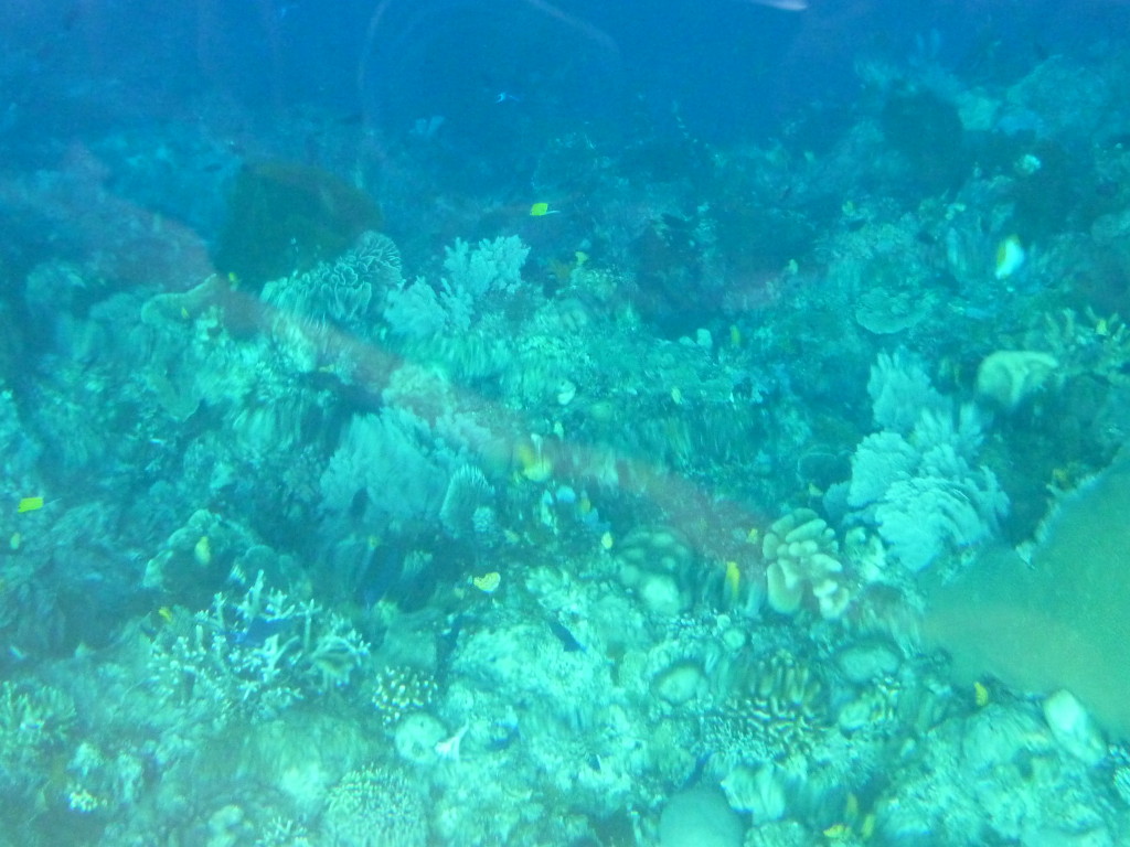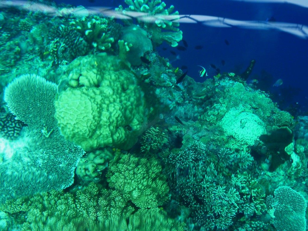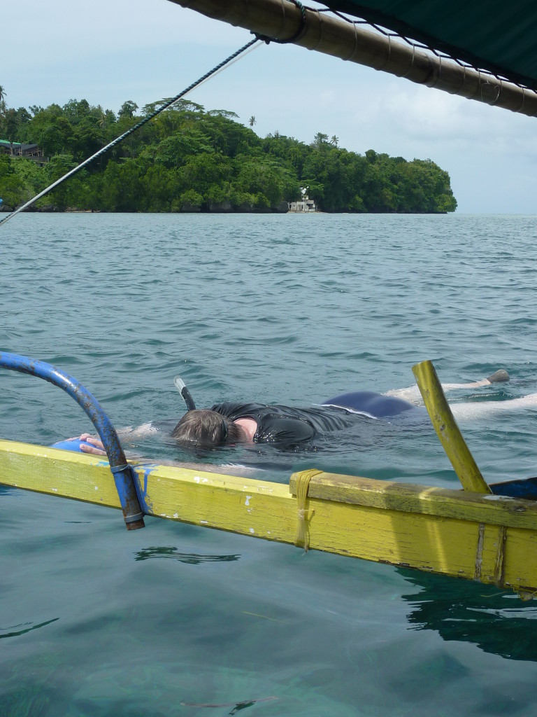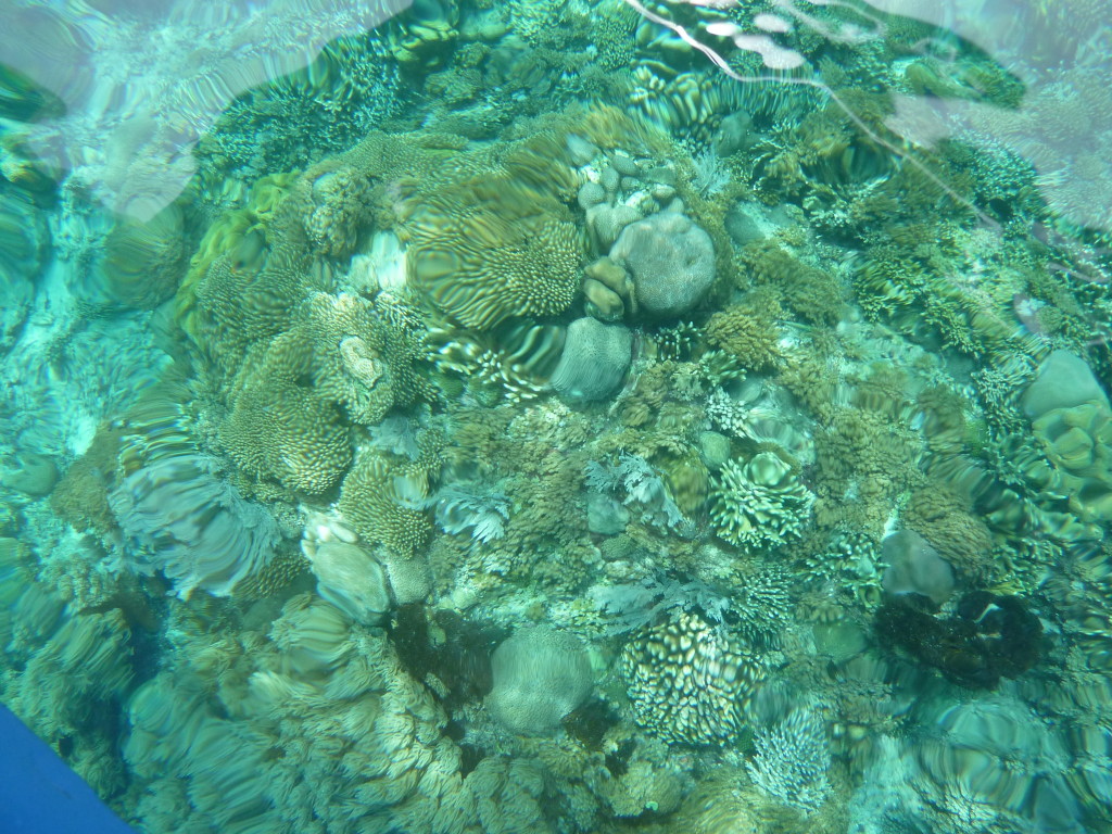 Kurz nach Neun holt uns Papa Lorenso mit seinem kleinen Dingi zu einer Schnorcheltour ab. Wir fahren zunächst auf die andere Seite der Insel. An der Abrisskante des Riffs ankern bereits einige Boote der örtlichen Tauchschulen. Um die Wasserschildkröten zu beobachten reicht aber eine einfache Schnorchelausrüstung, die wir für ein paar Euro im Resort gemietet haben. Und Papa Lorenso kennt sich hervorragend aus. Er weiß, wo man garantiert Wasserschildkröten findet. Dazu muss man nicht unbedingt ins Wasser. Selbst vom Boot aus kann man dank des klaren Wassers einen Blick in die Unterwasserwelt werfen. Gleich mehrmals kreuzen Wasserschildkröten unseren Kurs. Ansonsten sind die Korallen und Fische dieses Riffteils relativ unspektakulär.