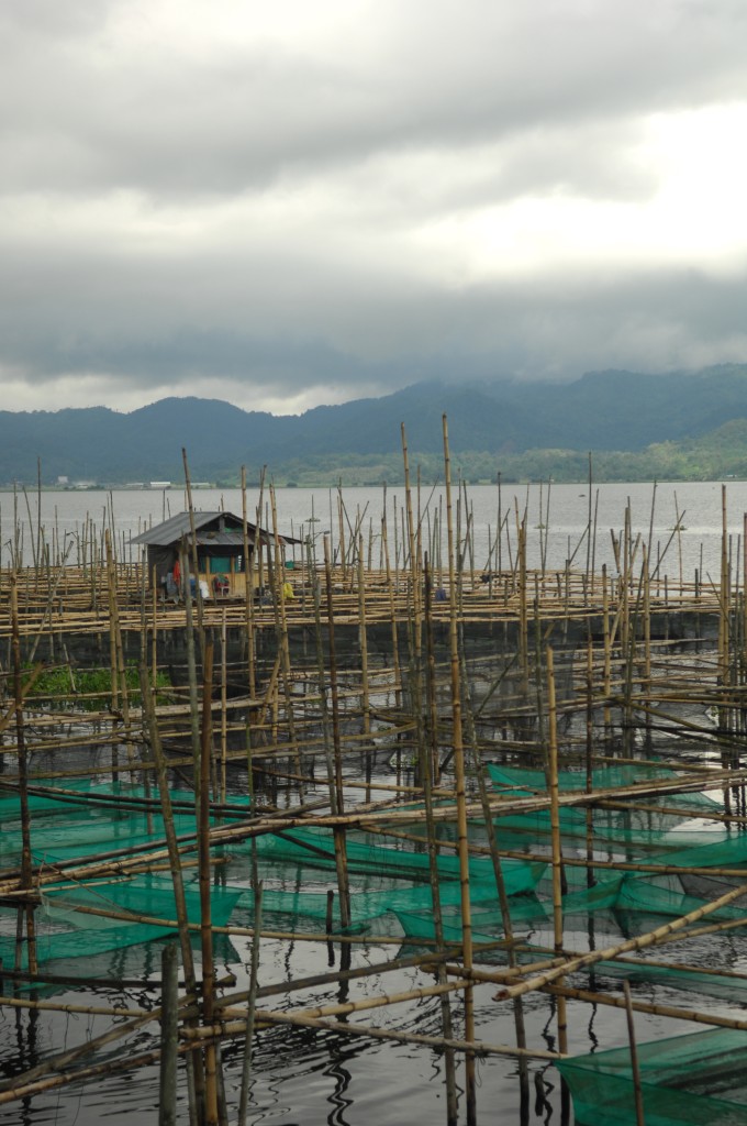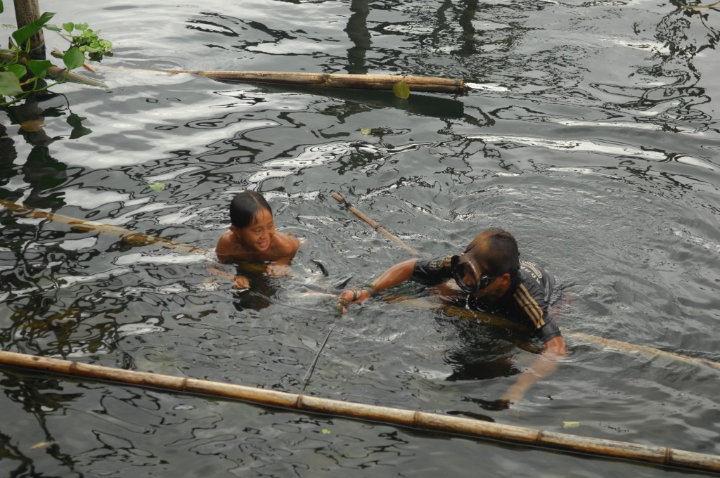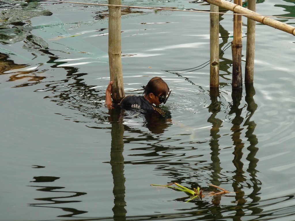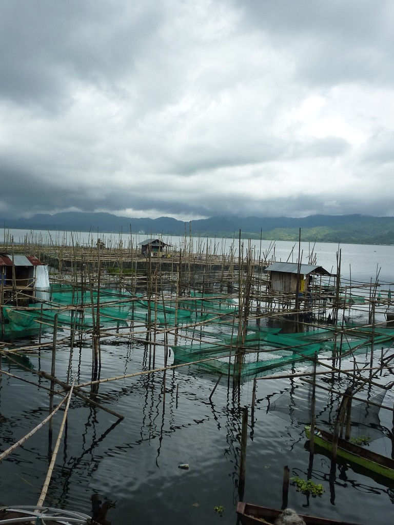 Schließlich erreichen wir den Tondano Lake und machen kurz an einer der vielen Zuchtfischfarmen. Zwei Jungs kommen gerade von der Ernte für den Tagesbedarf an Land geschwommen. Der ältere hat die Fische mit einer selbstgebastelten Harpune erlegt, sein kleiner Bruder schwenkt stolz den an einer Schnur aufgereihten Fang.