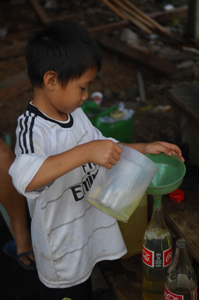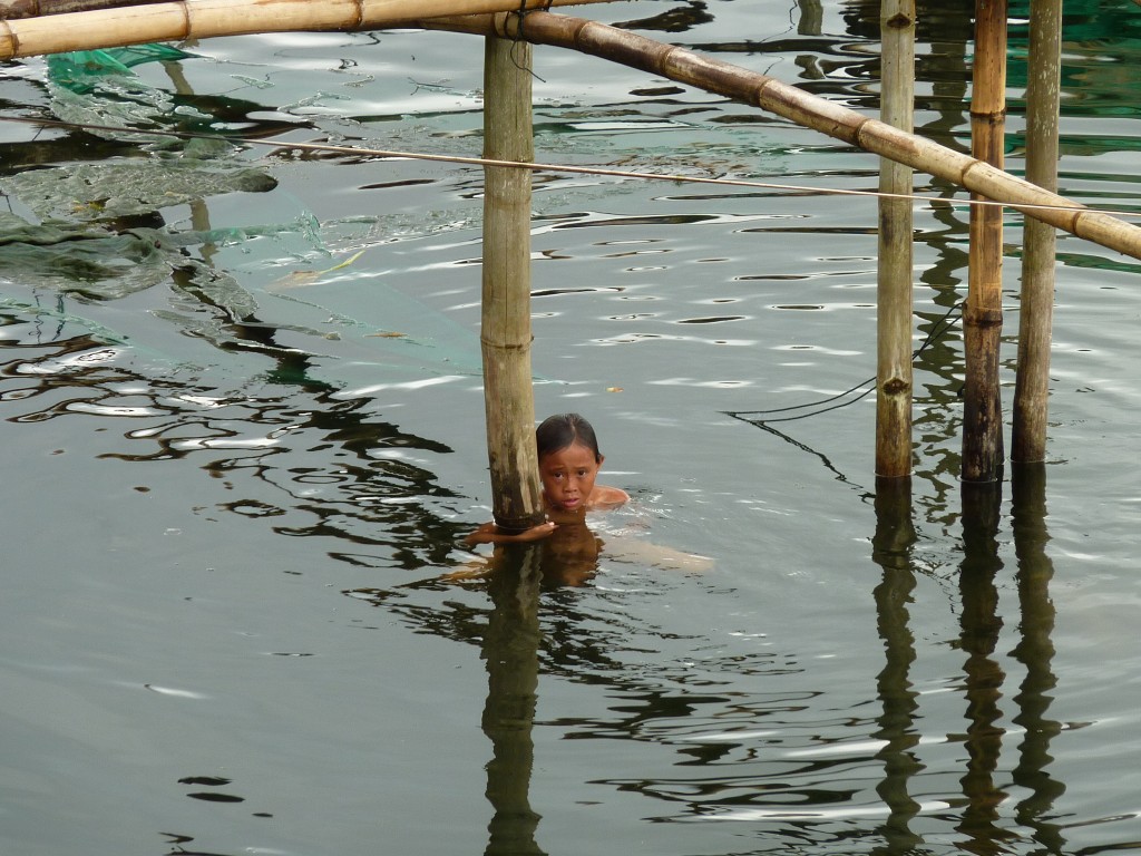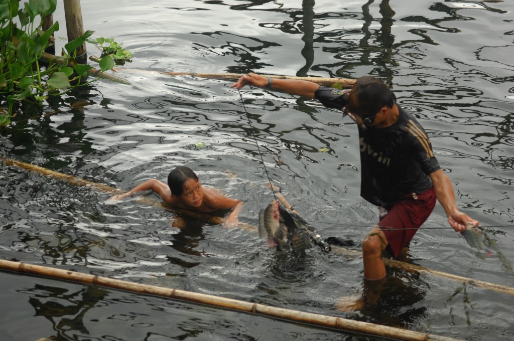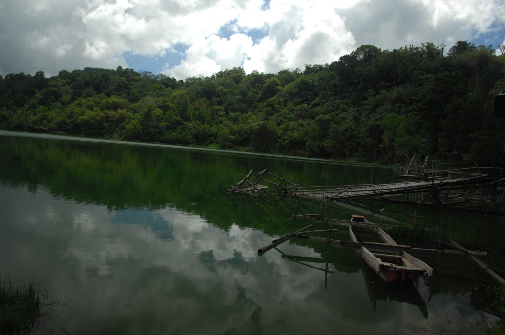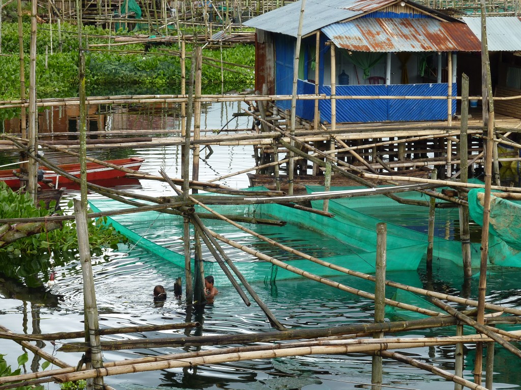 Schließlich erreichen wir den Tondano Lake und machen kurz an einer der vielen Zuchtfischfarmen. Zwei Jungs kommen gerade von der Ernte für den Tagesbedarf an Land geschwommen. Der ältere hat die Fische mit einer selbstgebastelten Harpune erlegt, sein kleiner Bruder schwenkt stolz den an einer Schnur aufgereihten Fang.