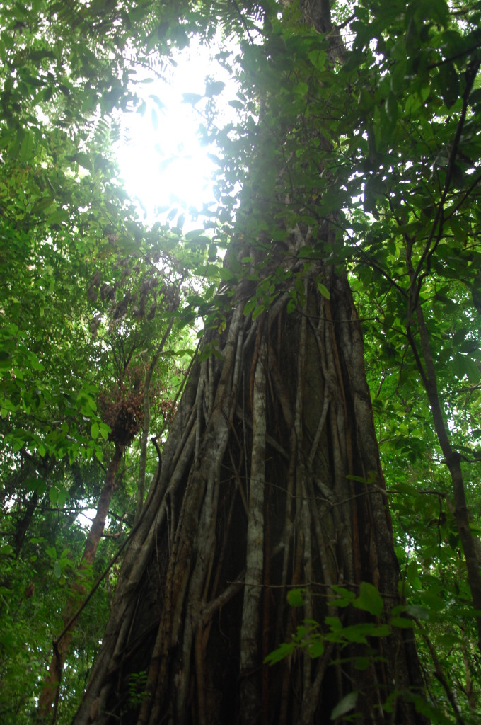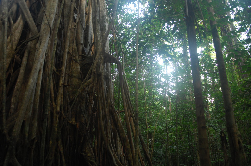 Mittlerweile ist das Zwielicht dem Morgenlicht gewichen und wir wandern weiter durch den Dschungel. Das Kreischen der Zikaden legt sich allmählich und es wird wieder ruhiger im Regenwald. In der Ferne ist das Donnern der brechenden Wellen am Strand zu hören. Der Nationalpark liegt direkt am Meer. Meidy will uns jetzt einige der hier heimischen Vogelarten zeigen, hat aber leider Pech. Der Wald ist wie ausgestorben. Dann entdeckt er in den Bäumen zwei Kletterbeutler (Kus-Kus). Die vom Aussterben bedrohten Tiere sind nur noch sehr selten zu finden. Ein Glücksfall!