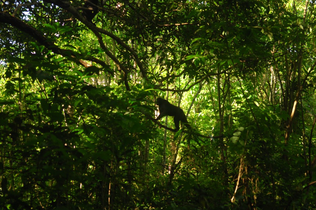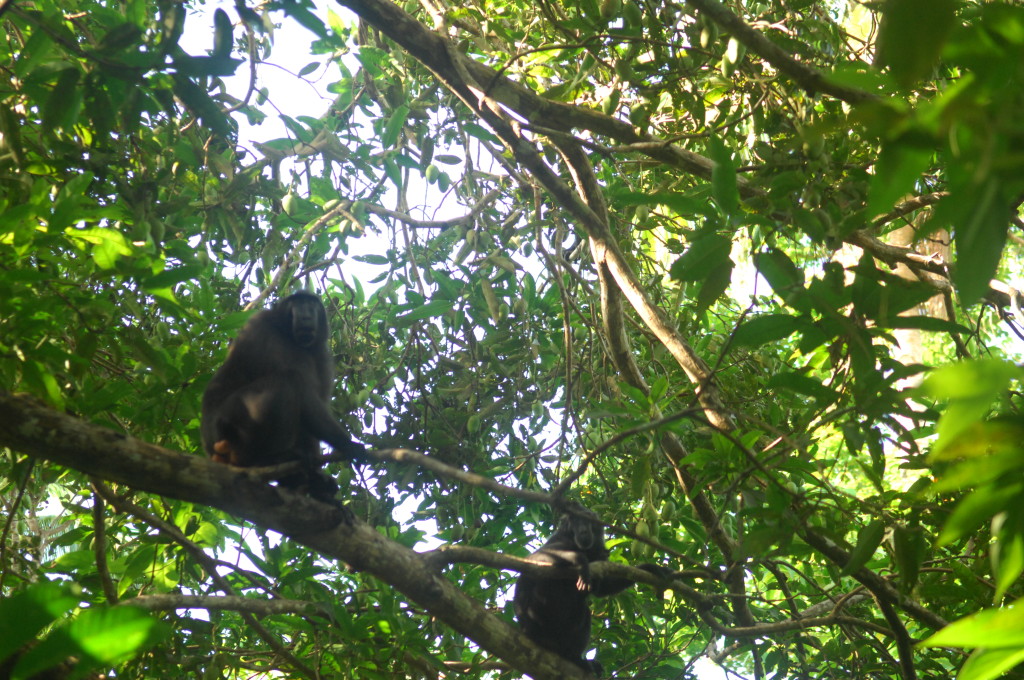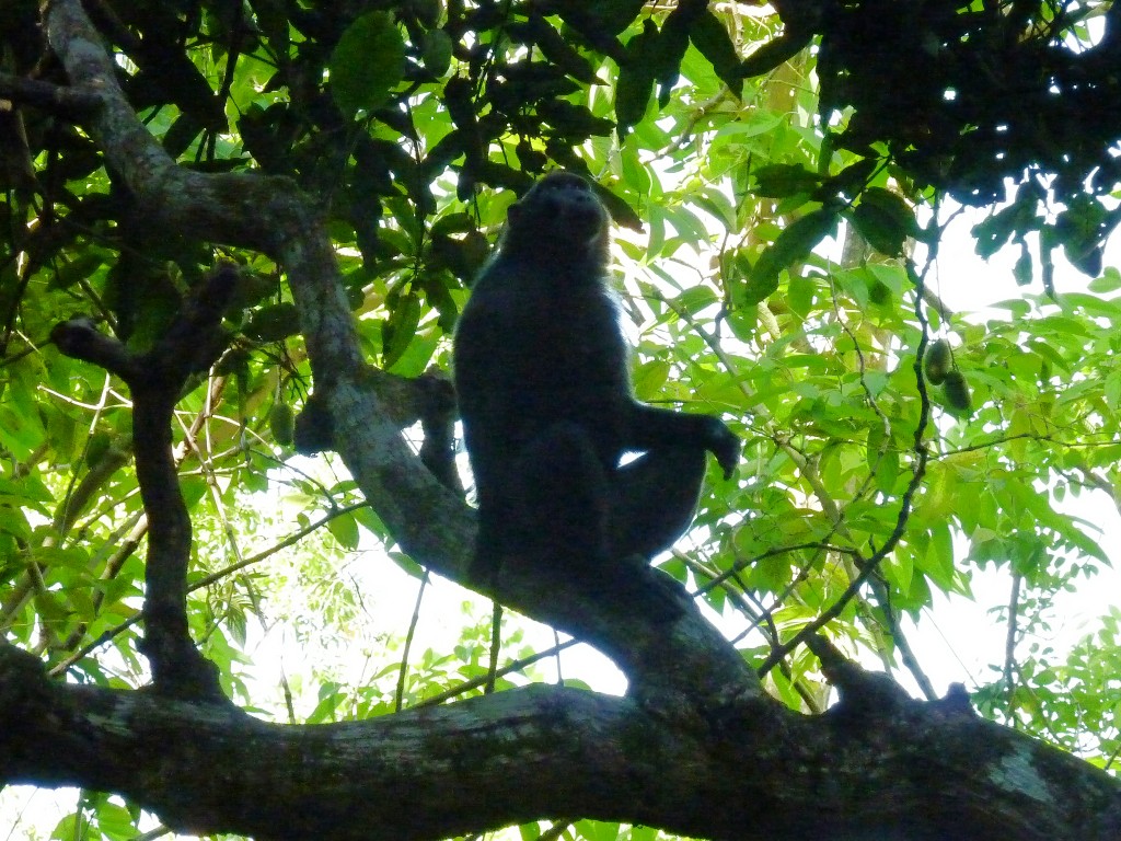 Eine Mitarbeiterin gibt den entscheidenden Tipp: eine 100köpfige Horde der schwarzen Primaten hält sich in Planquadrat AA des Nationalparks auf. Eine halbe Stunde später sind wir dort. Kein Wunder, dass sich die Schopfmakaken hier wohlfühlen. Sie plündern gerade genüsslich mehrere Mangobäume.