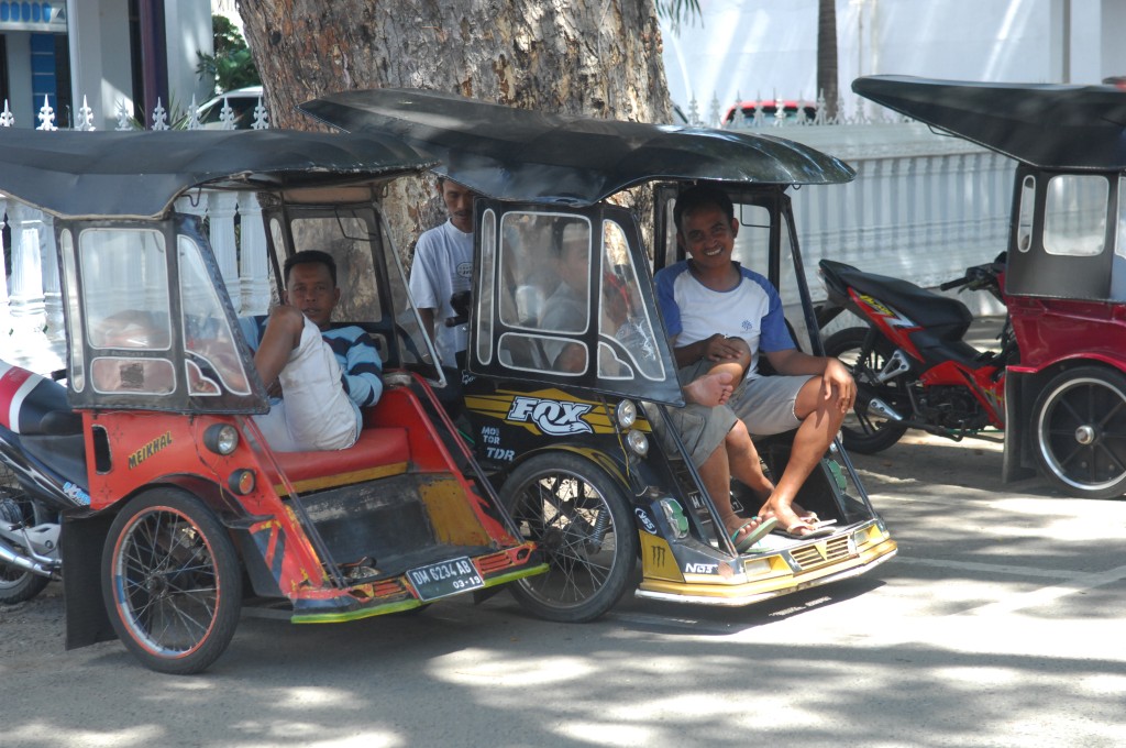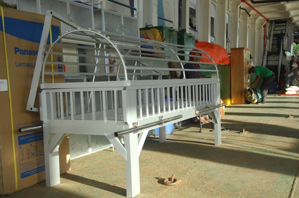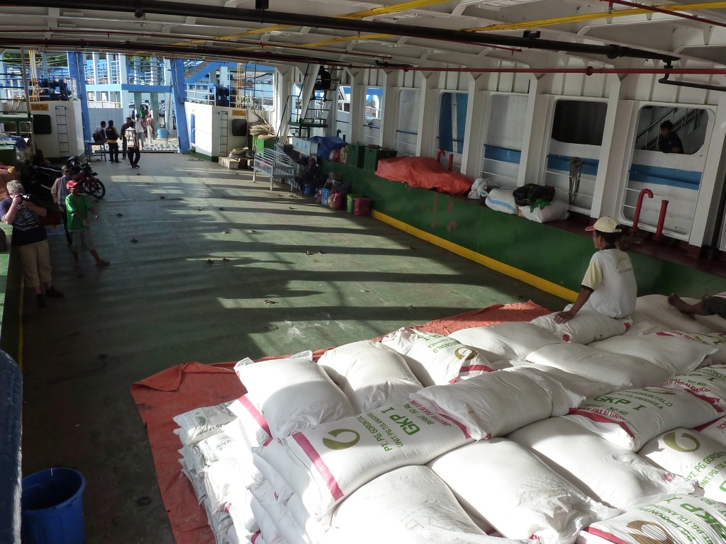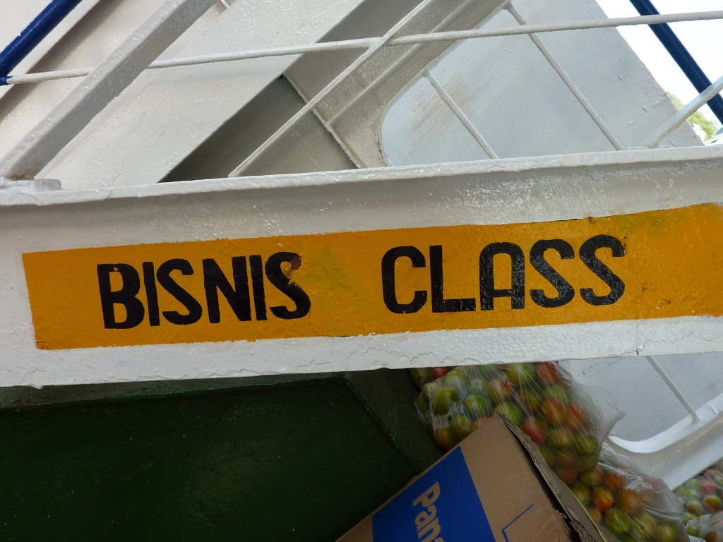 An Bord füllt sich langsam das Unterdeck. In der Nebensaison kommen nur wenige Touristen an Bord, vor allem Einheimische nutzen jetzt die Fähre für den Transport ihrer Einkäufe in der großen Stadt. Unterdeck stapeln sich bereits Unmengen Reissäcke, Tüten mit Tomaten und anderem Gemüse sowie Möbel und ein kurioses Aluminiumgerüst. Letzteres ist ein Gestell zum Transport eines Leichensacks, wie uns Hardy erläutert. Da Muslime ihre Leichen nicht im Sarg sondern eingenäht in ein Tuch beerdigen, muss dieses von Trägern zum Friedhof getragen werden. Für einen Leichenwagen ist es auf den Inseln zu unwegsam, also wird der Sack einfach in das Gestell gelegt und mittels der Haltegriffe an den Seiten auf Kopfhöhe geschultert und von kräftigen Männern auch durch unwegsames Gelände getragen.