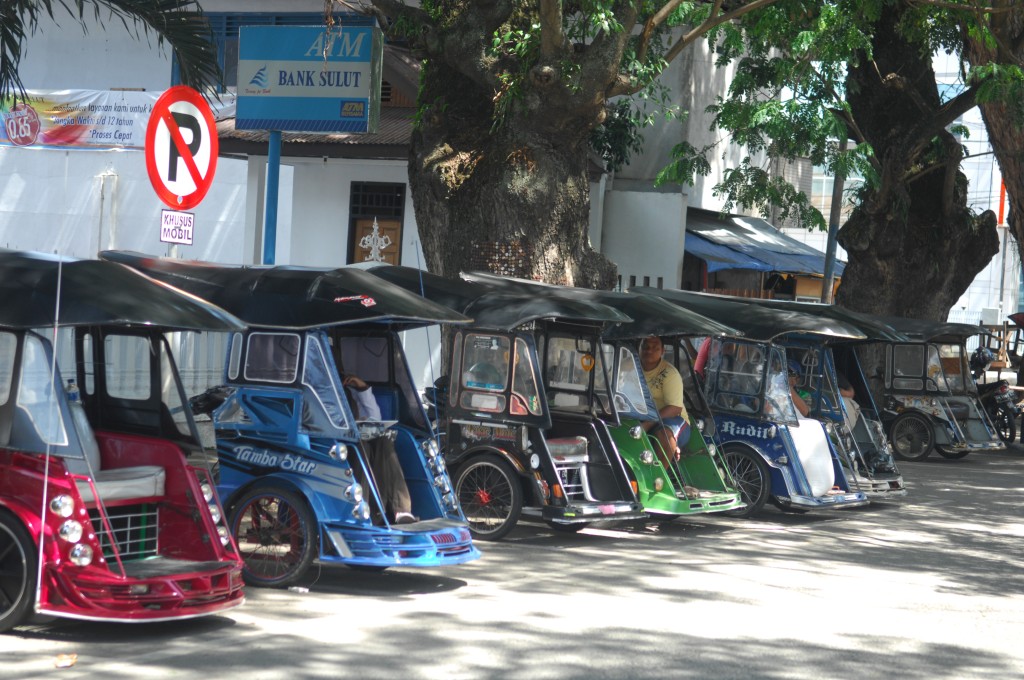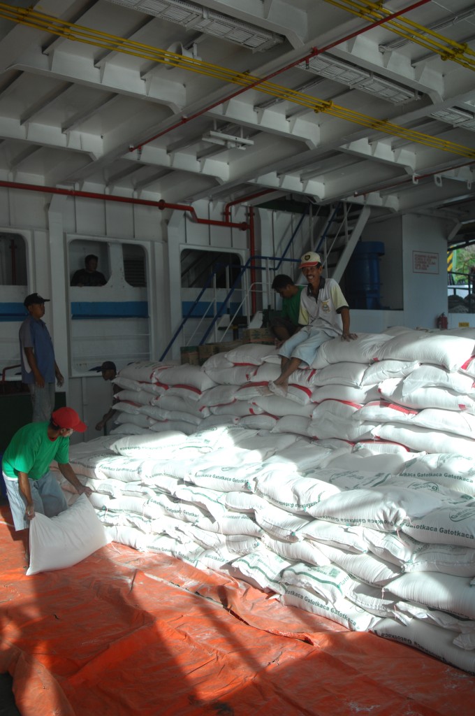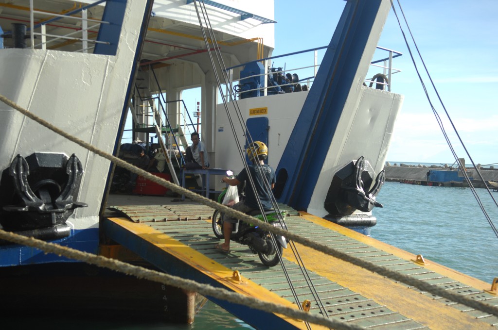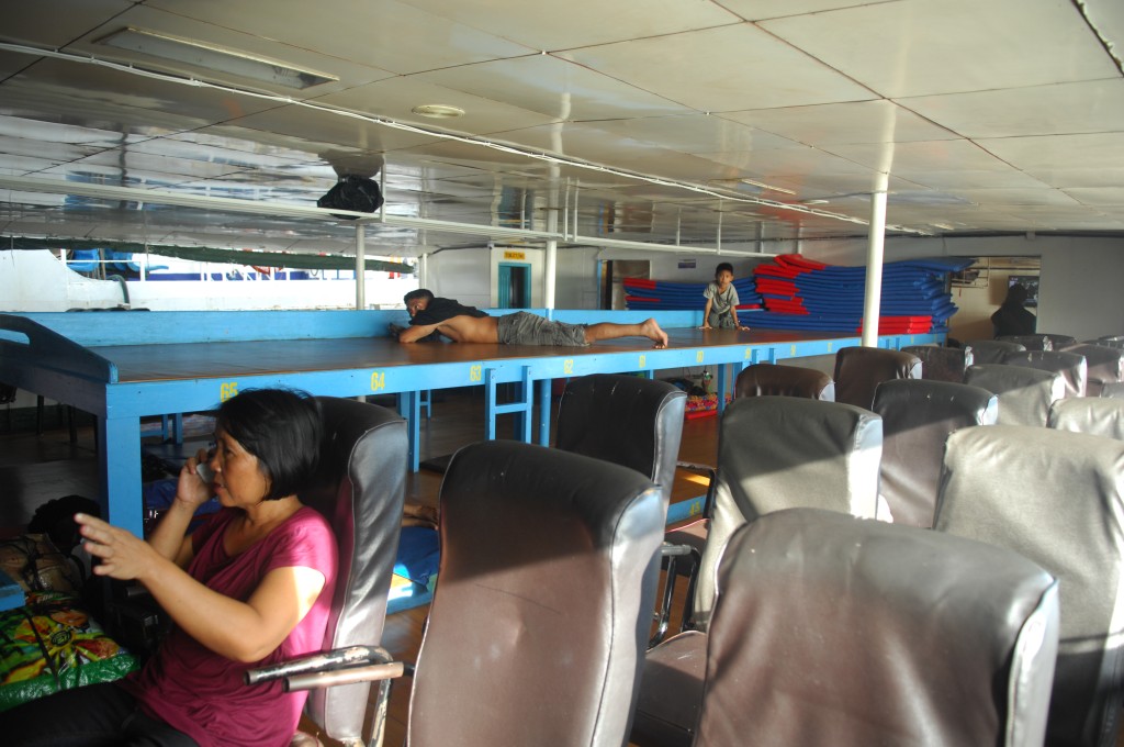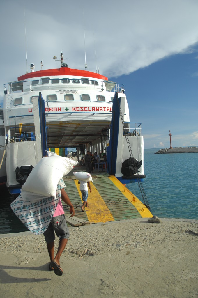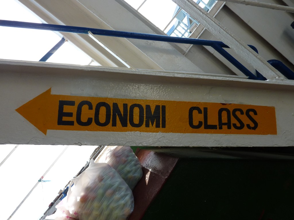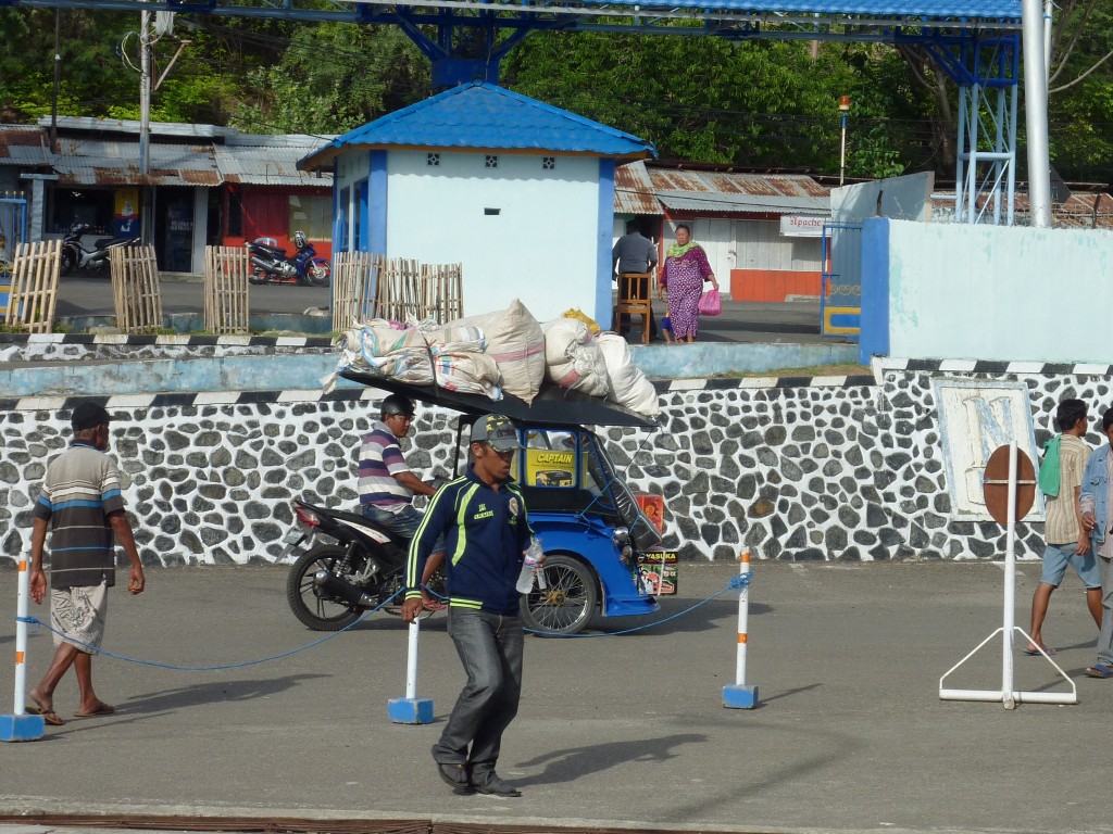 Am frühen Nachmittag bringt uns ein Minibus des Q-Hotels zum Hafen. Wir wollen mit der Tuna Tomini zu den Togian-Inseln in der Mitte Sulawesies fahren. Die Fähre pendelt zweimal die Woche zwischen Gorontalo und Wakai. Der Ticketverkauf am Hafen beginnt um 15 Uhr, ablegen soll das Schiff angeblich gegen 17 Uhr. Zur Auswahl stehen zwei Kategorien: den Unterschied zwischen „Economi“-Class (72Tsd Rp. mit Matte) und „Bisnis“-Class (89Tsd Rp. ohne Matte) macht eine Klimaanlage. In der einfachen Klasse sind als weitere Kategorie Liegeflächen für Schaumstoffmatten vorgesehen, im klimatisierten Deckbereich werden sie einfach zwischen die Stuhlreihen gelegt. Davon machen auch einige Crewmitglieder Gebrach, die ihre (unklimatisierte) Kabine zahlungskräftigen Gästen für rund 30 Euro pro Person überlassen. Wir leisten uns zwei „Bisnis“-Tickets, Matten haben wir selber dabei bzw. wollen die Möglichkeit nutzen, quer über mehrere Sitze zu schlafen.