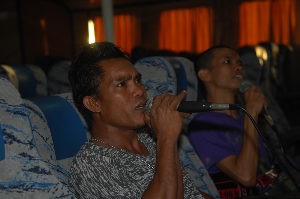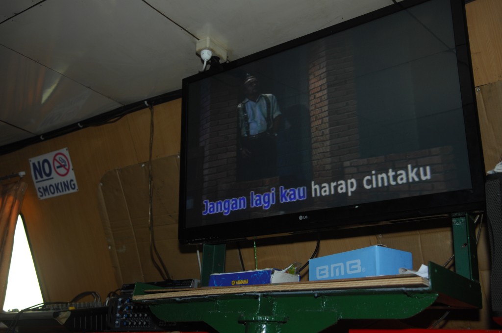 Als wir zu unseren Plätzen im oberen Deck zurückkehren, frönen dort bereits zwei Einheimische einem Lieblingssport vieler Asiaten: Inbrünstig schmettern sie die neuesten Schlager dieser Region. Dem Karaoke-Virus kann man offenbar nirgends entkommen. Zum Glück ist der Spuk jedoch bald zu Ende, da die beiden offiziell gar keinen Platz in dieser Klasse gebucht hatten. Bis zum Ablegen erhalten wir einen Einblick in das örtliche Nachrichten- und Werbeprogramm. Neben den üblichen Katastrophenmeldungen – mehr Überschwemmungen, Erdrutsche etc als Verkehrskatastrophen – zeigt die bunte Werbewelt die neuesten Ziele für Begehrlichkeiten: Instanttee aus der Tüte und natürlich die neuesten und effektivsten Cremes zum Weißermachen der Haut.